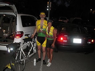 Along the way there, one of the rear lights of the tandem flew off. We got out of leading the pace line to stop and pick up the fallen Cateye. Dick stopped along with us and rode back along the road to help retrieve it for us. I was later told that Rob Hawks was the one who yelled out to us about the light. Apparently he and Bruce Marchant were riding behind us from the very beginning. Who knew? I couldn’t see anything in the dark but all the little headlights behind us. Mark