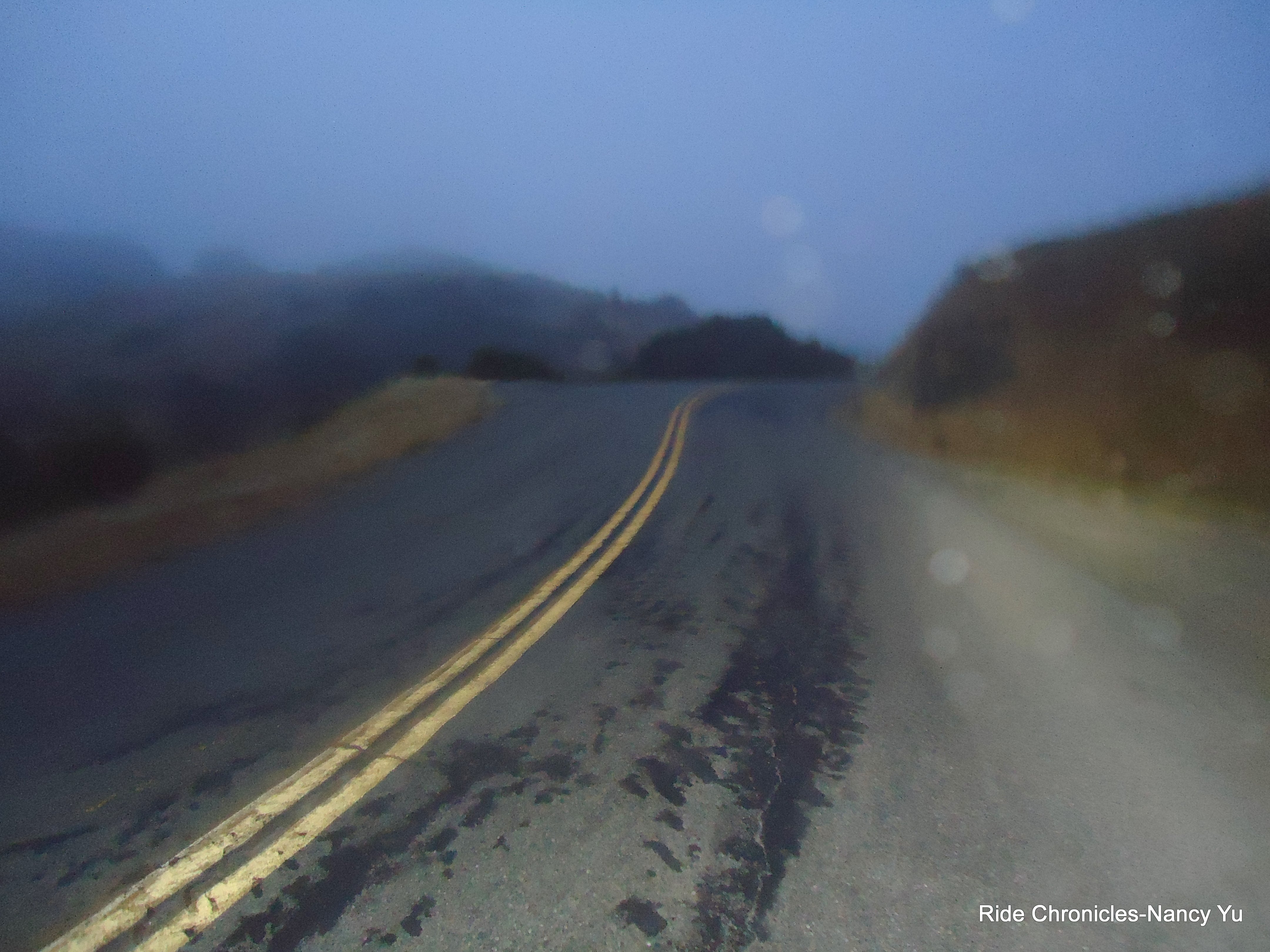 We make an unofficial stop at the Fairfax Town Hall. It’s 5:09 AM. There is a restroom available inside the Police Station and it’s open 24/7. As I step inside the door, the sound of my cleats on the floor startles the clerk behind the window and he literally jumps out of his chair. I apologize and make a motion for the restroom. While I’m outside waiting for Mark, a large group of cyclists rolls on by. As we get ready to leave, Zach Kaplan and Veronica Tunucci pull up behind us on a recumbent tandem. We exchanged greetings and head on out. We continue on Bolinas Rd which eventually becomes Bolinas Fairfax Rd. The climb up to the first rest stop is 3.2 miles with an average gradient of about 5%. It’s foggy and misty as we reach RS#1 at Pine Mtn, mile 24.5. It’s 5:55 AM. Temp 50. The volunteers take down our numbers; I refill my bottle and eat a segment of banana and a piece of PBJ sandwich.