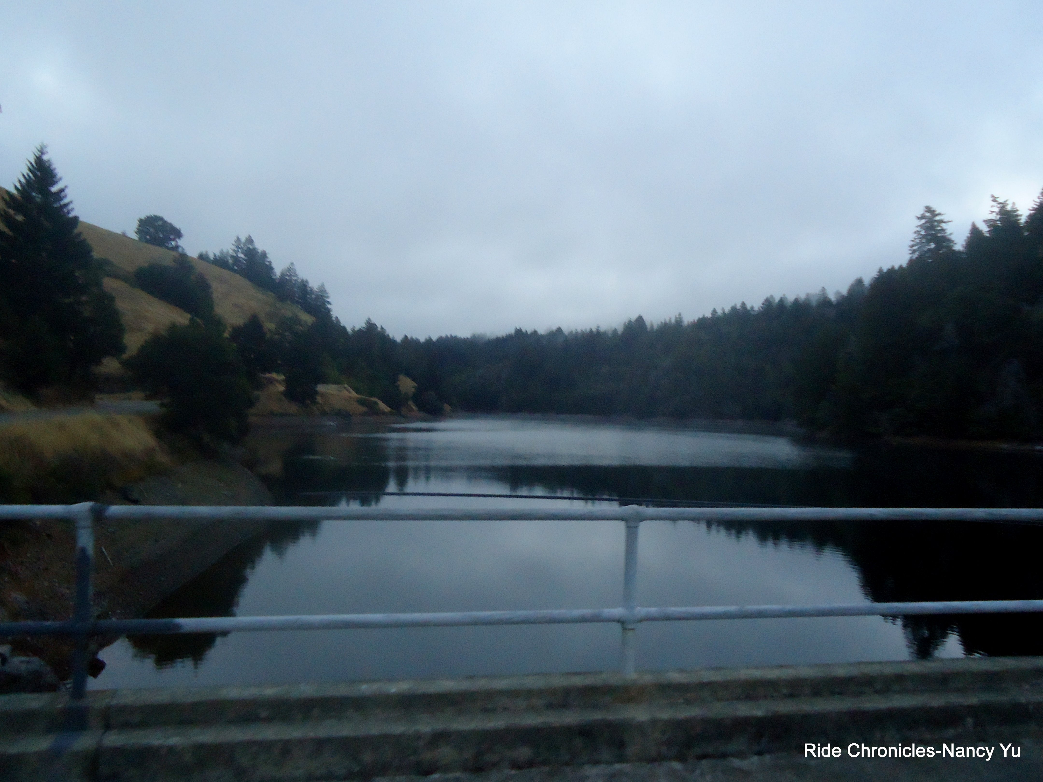 There is a short climb out of Pt Reyes Station before we make the turn on Pt Reyes-Petaluma Rd. It’s a fun section of downhill all the way to the colored bridge at Platform Bridge Rd. We take a left to ride along the Nicasio Reservoir before the climb up Rocky Hill. We both hear loud music behind us and I turn around and see that it’s Lee in his red BIKEVAN. We both wave at him as he passes by. He gives us a friendly acknowledgement by flashing his top lights. That’s the first SAG vehicle I’ve seen till now.
