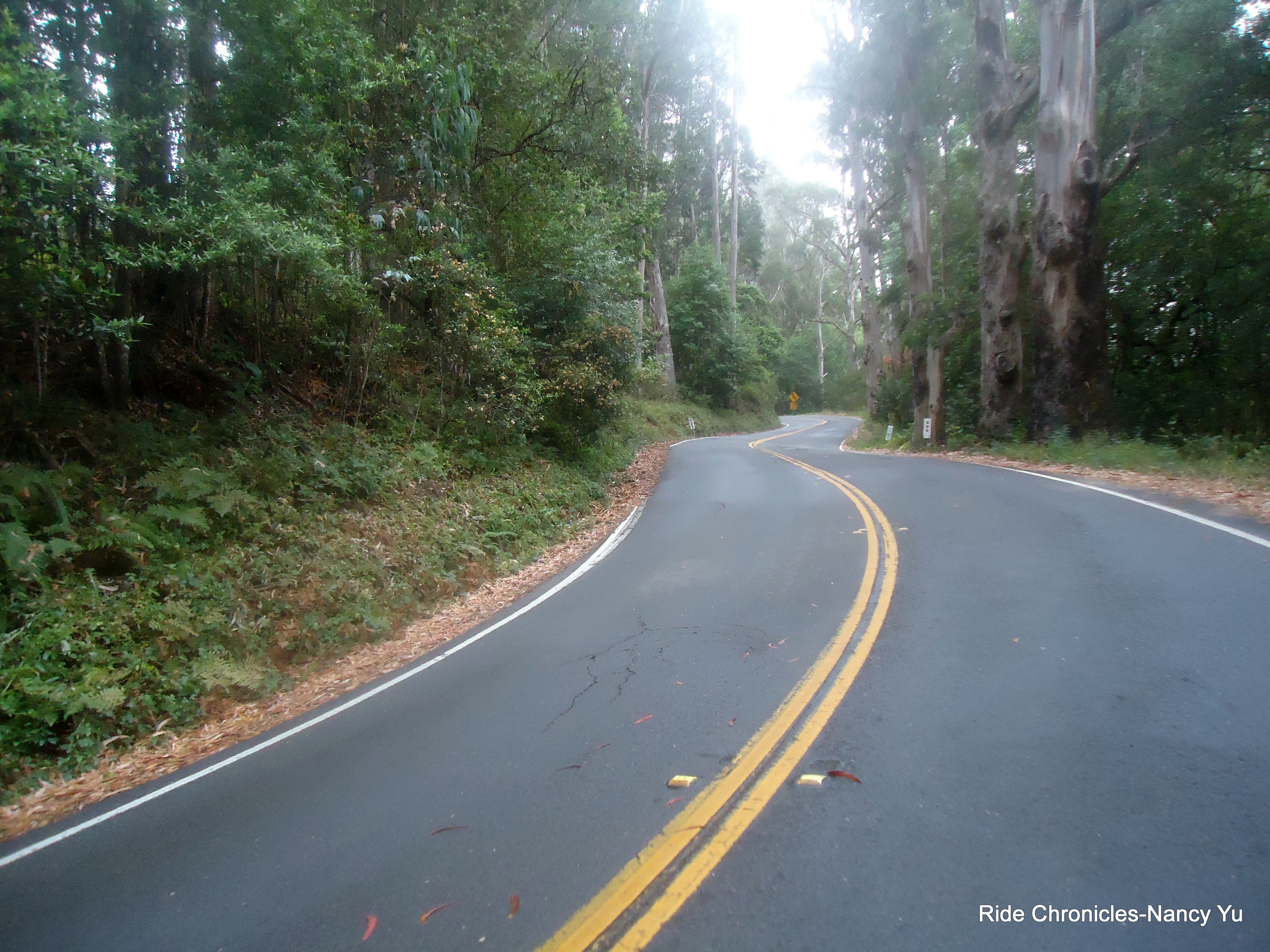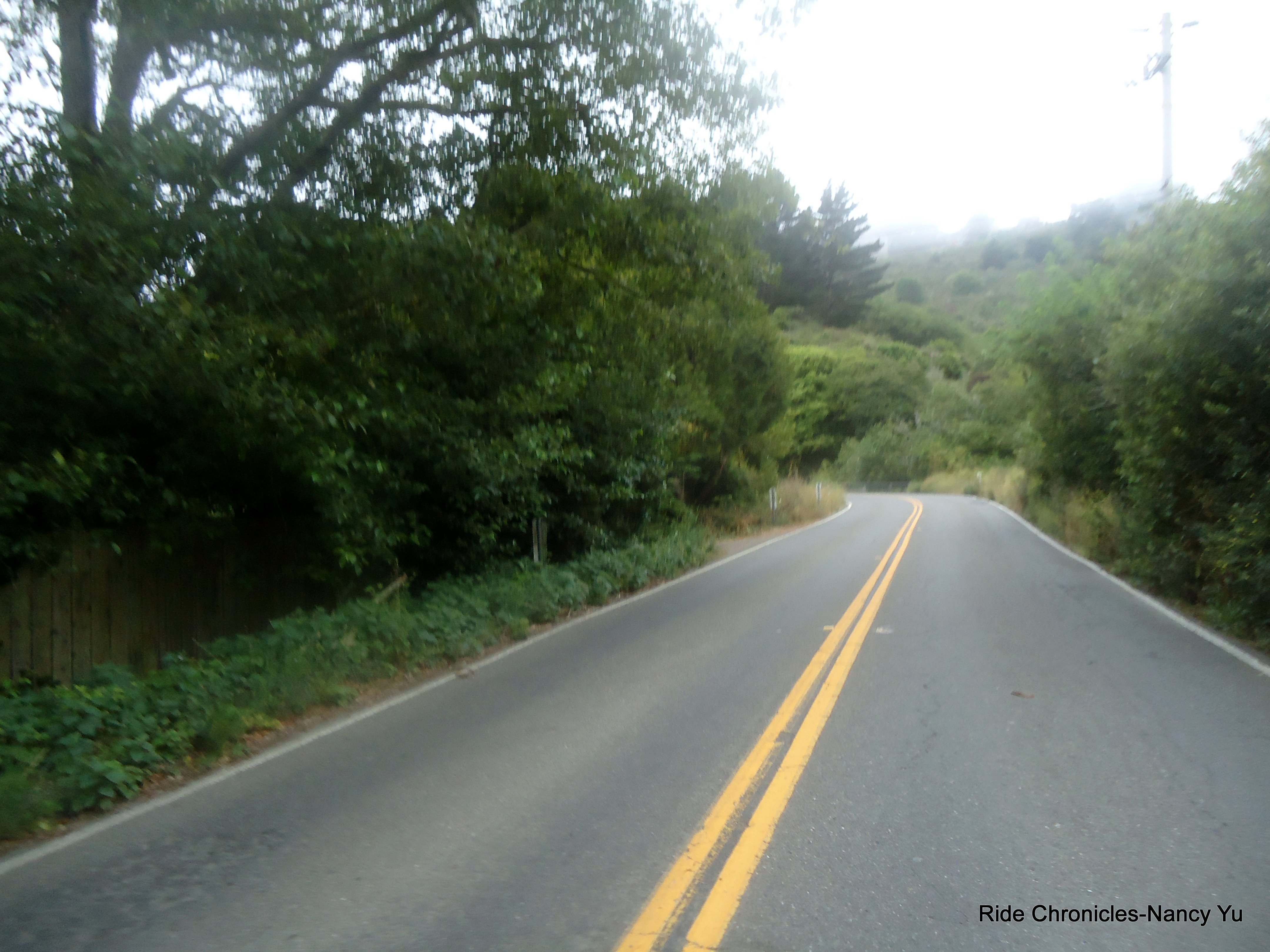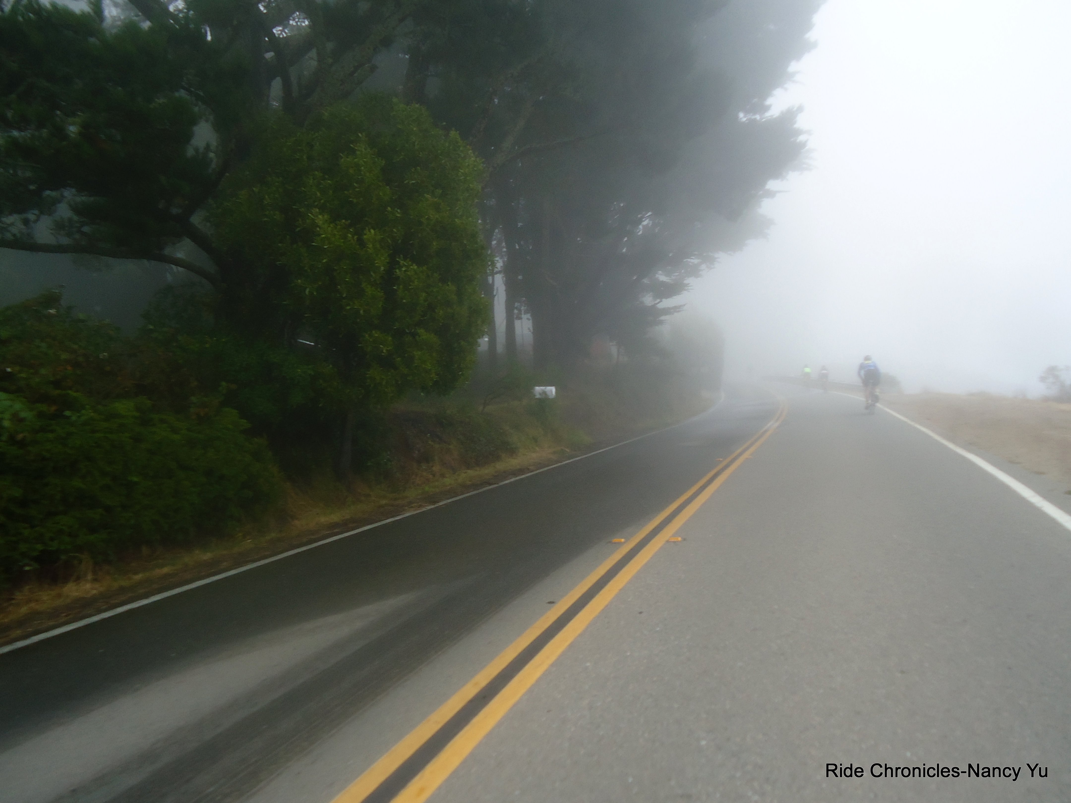 As we reach Pan Toll Rd, the weather changes dramatically. It’s very foggy, misty, damp and a lot colder. Mark takes the descent with caution and safety as a cyclist chooses to blast by us on the left into the opposite lane. We take a