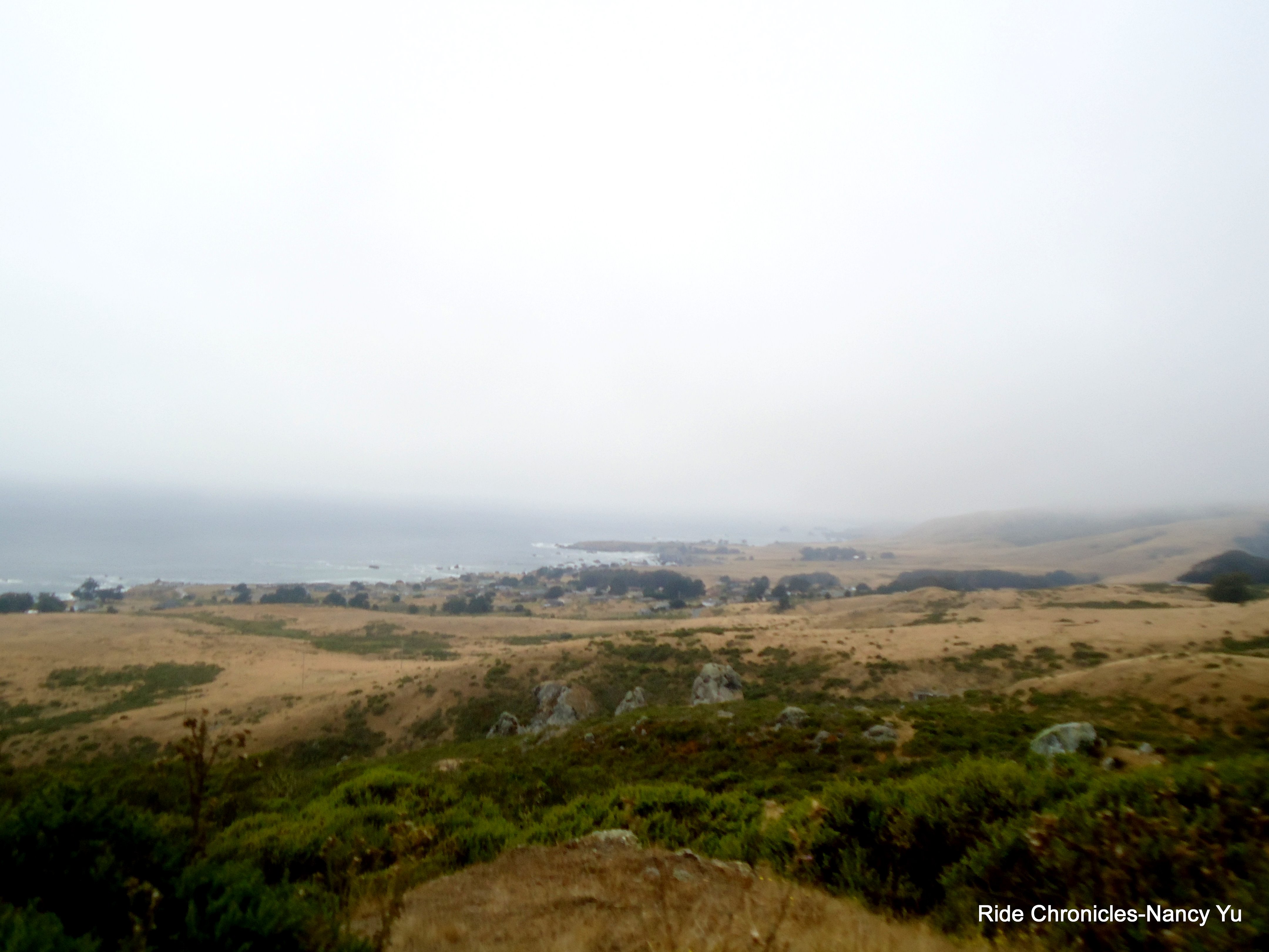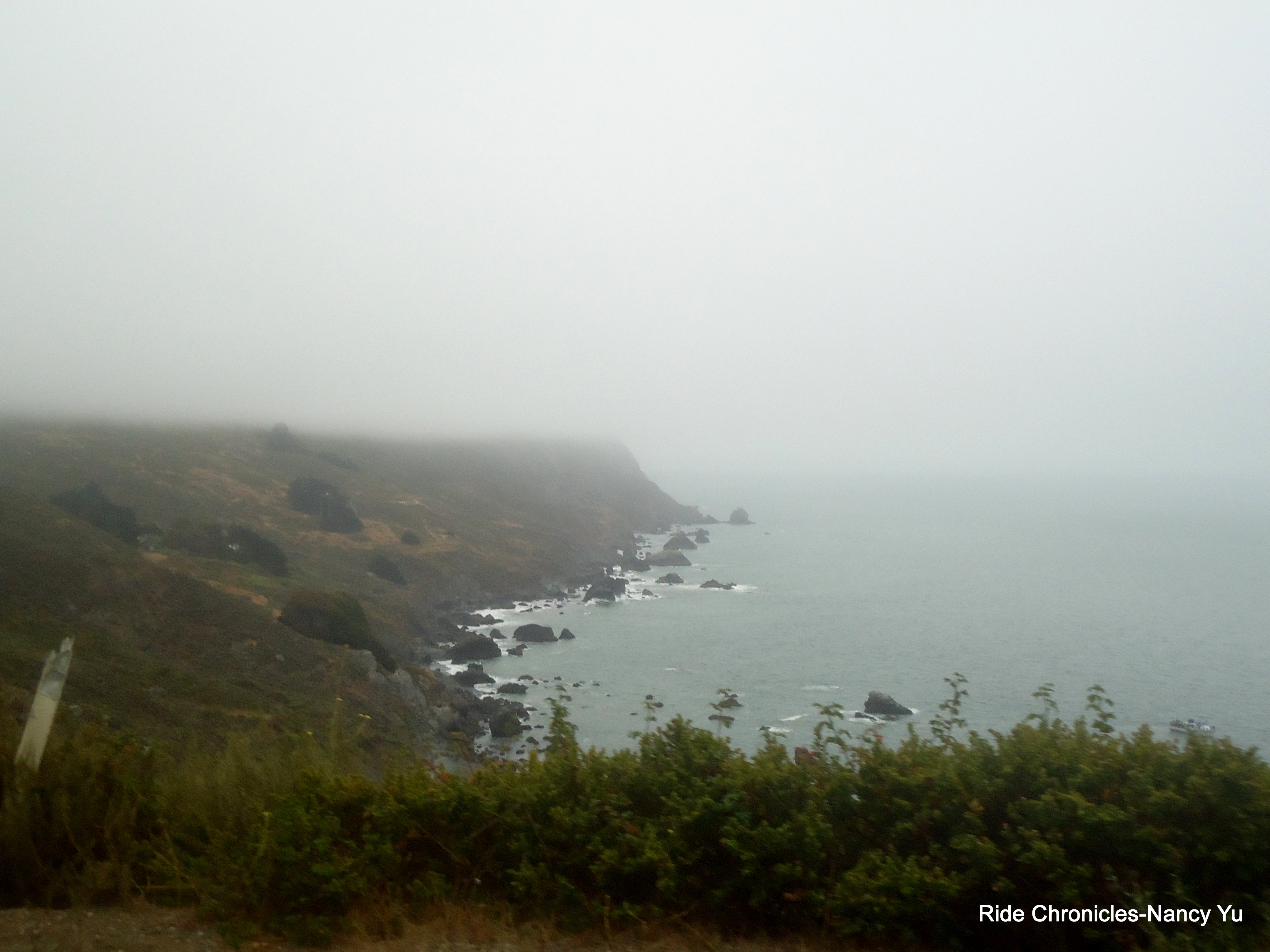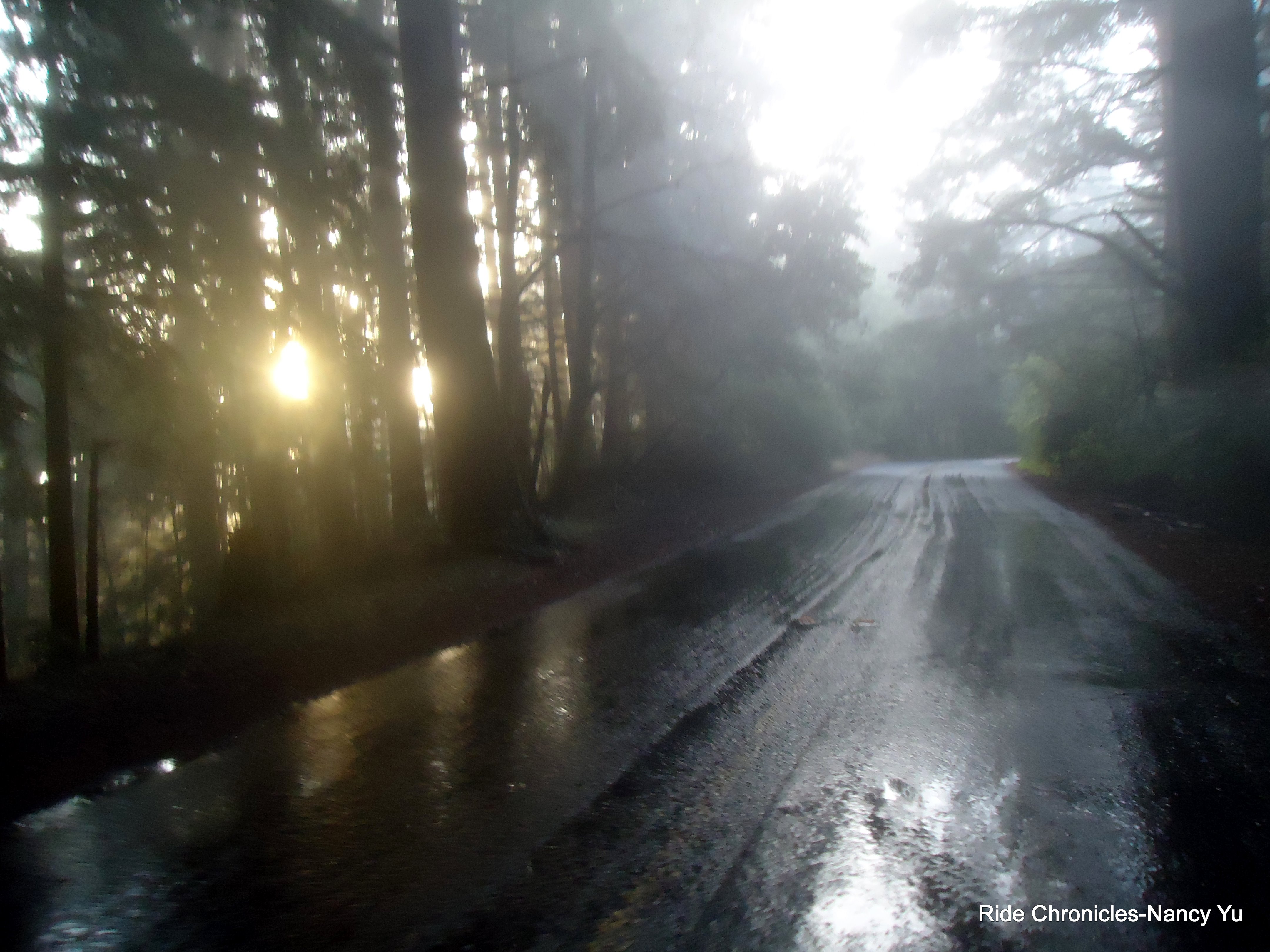 As we reach Pan Toll Rd, the weather changes dramatically. It’s very foggy, misty, damp and a lot colder. Mark takes the descent with caution and safety as a cyclist chooses to blast by us on the left into the opposite lane. We take a