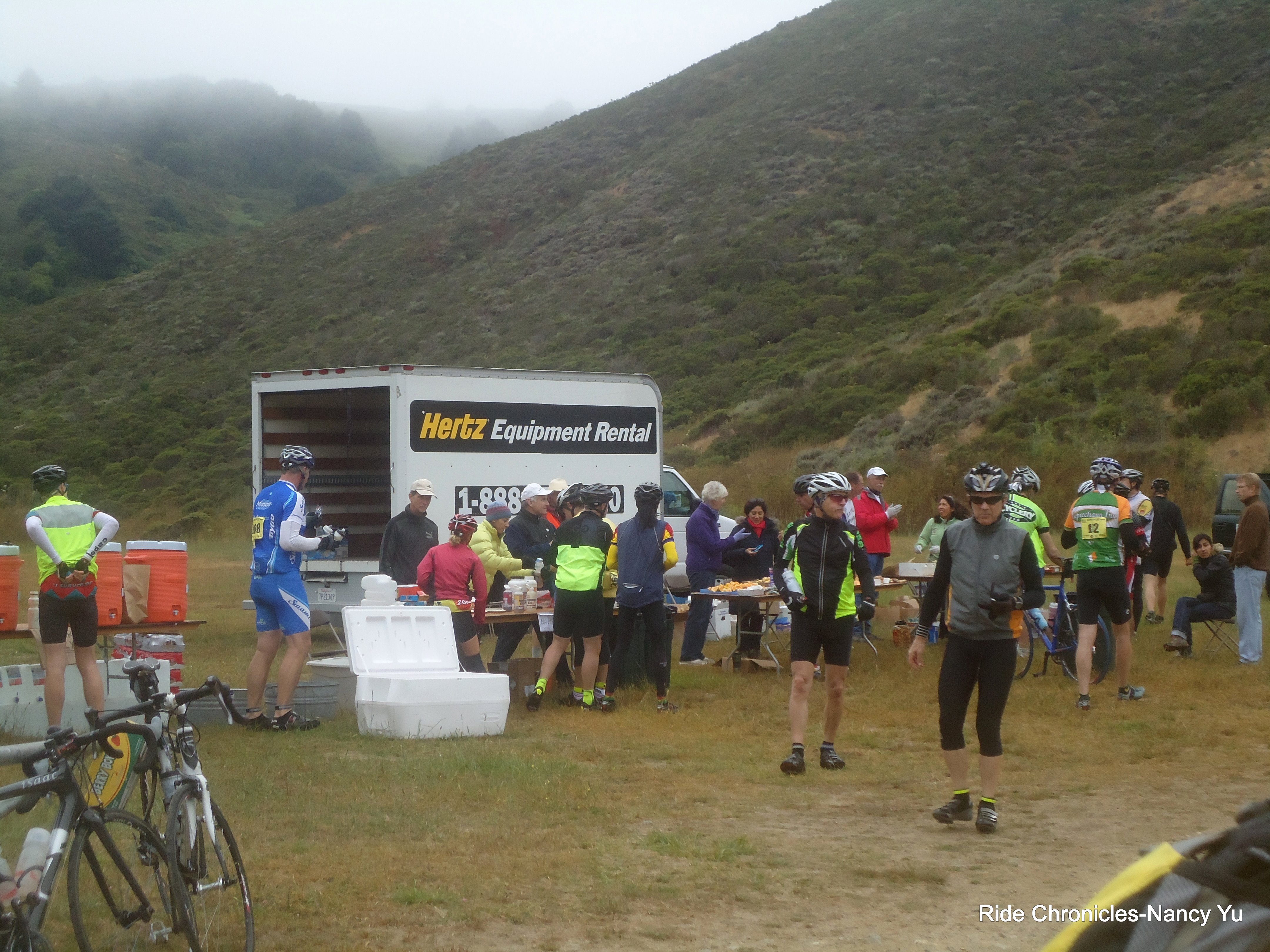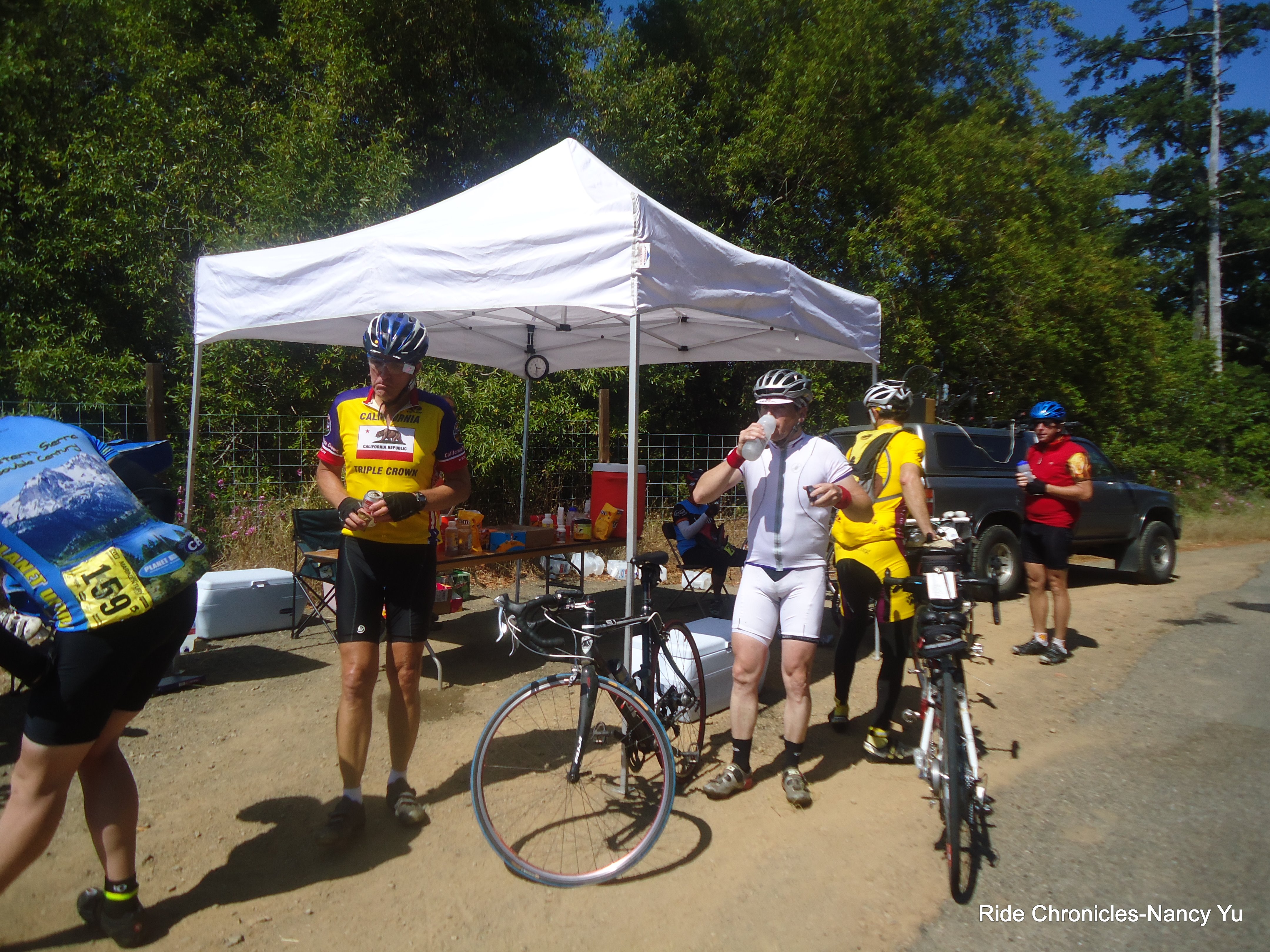 left turn at the stop sign and head east on Panoramic Hwy to Muir Woods Rd. The descents take us to RS#2 at Santos Meadows, mile 50.2. It’s 8:16 AM. I take in some food, refill my Cbak and was ready to roll. And of course, I never pass up a potty stop.