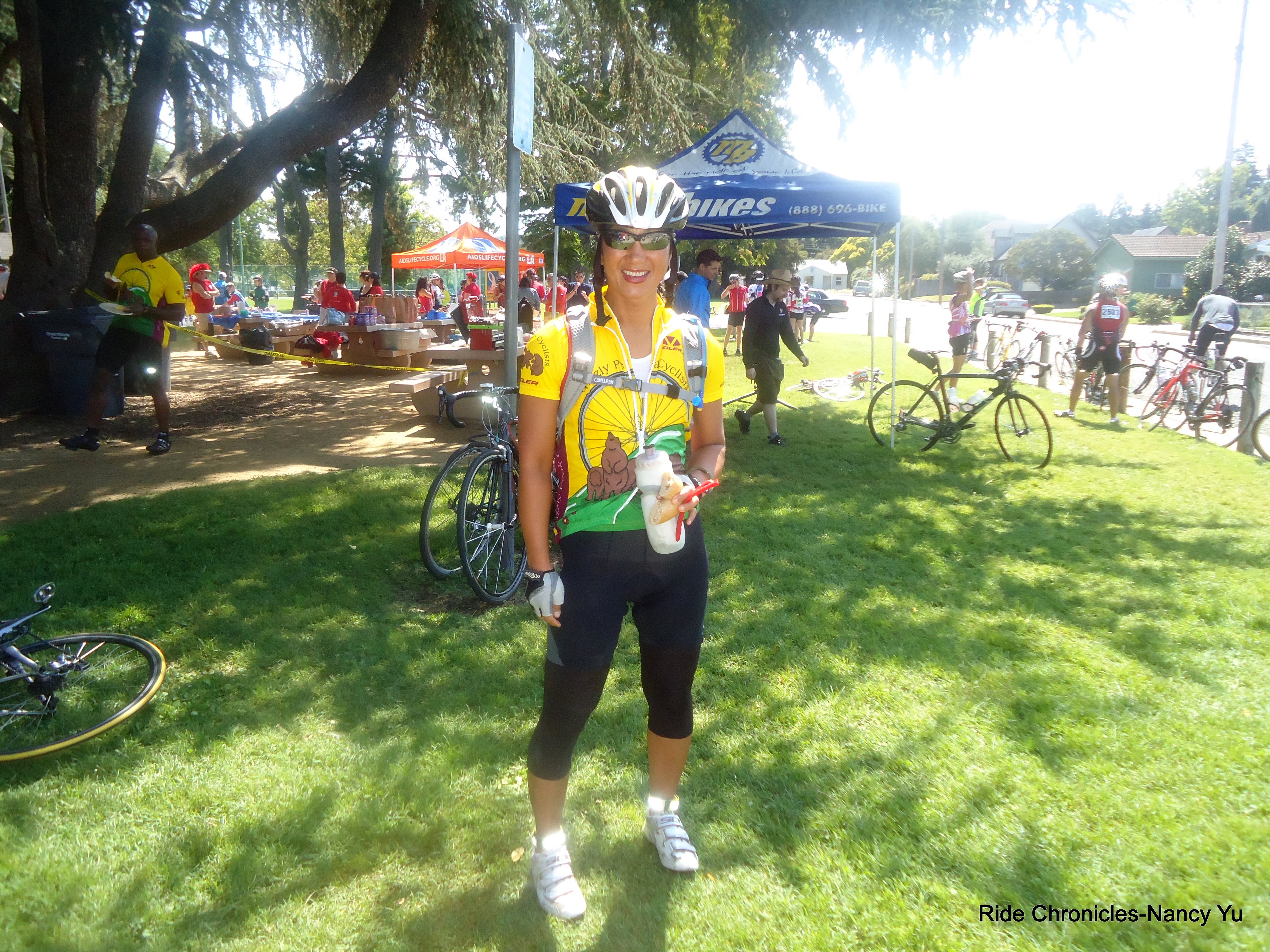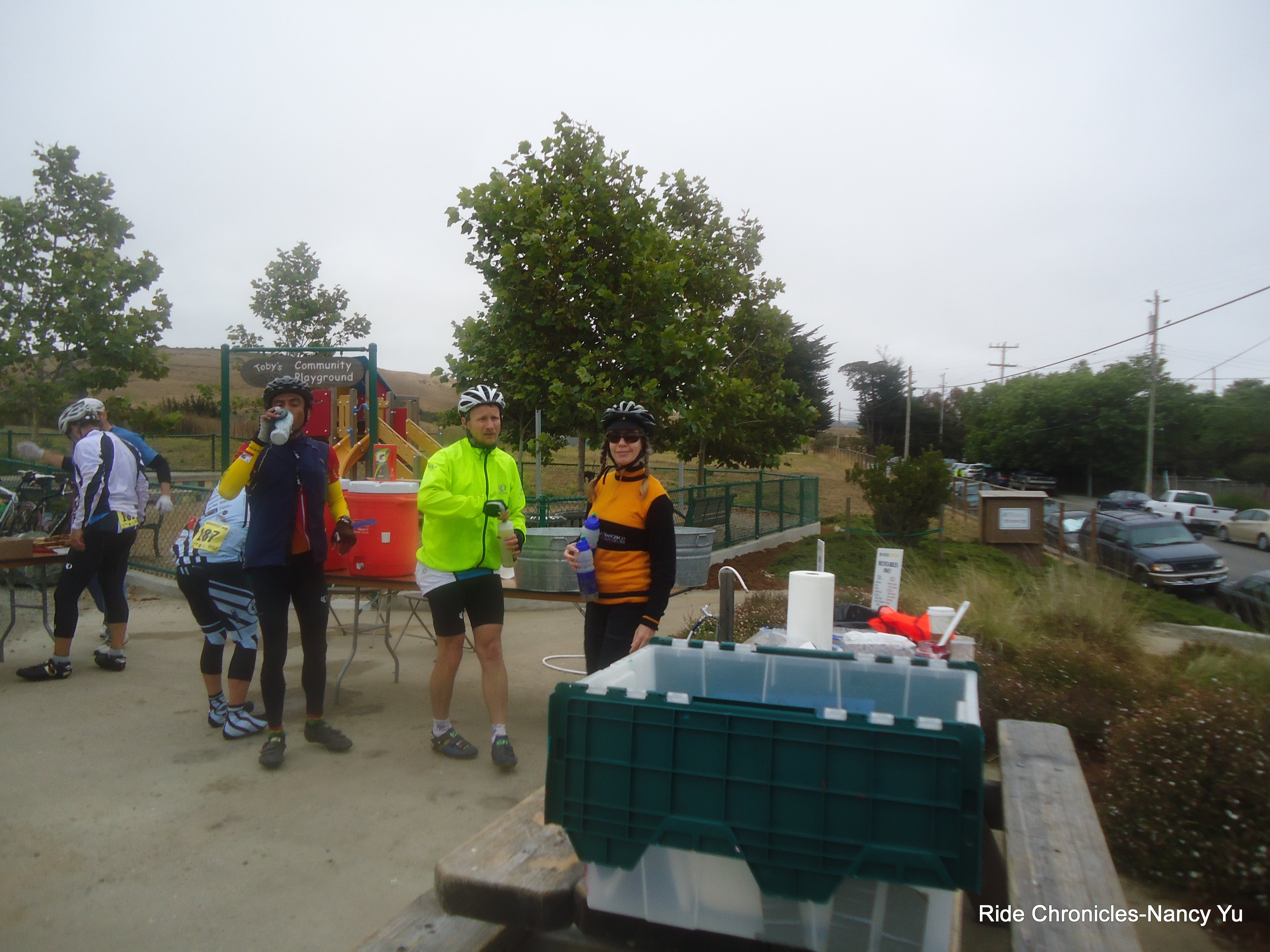 We reach RS#4 at Petaluma/McNear Park, mile 93 at 11:13 AM. Temp 75. I hear someone call out my name and it’s Dick Ferrer. He’s working as a volunteer at this lunch stop. Ed Wesley is also there. I spot other Grizzlies here. There’s Cree, Barry, Rich, Debra, Veronica and Zach. My apologies if I missed anyone else. This rest stop was packed. I refilled my bottle and Cbak and ate some fruits along with some crackers. I took half a bagel to stuff in my saddle bag for later. I had a few red vines and it just got stuck all over my teeth. Yuck! I took off my arm warmers and stuffed them inside my jersey pocket. The knee warmers were stuffed into the Cbak. The warmth of the sun felt really good.