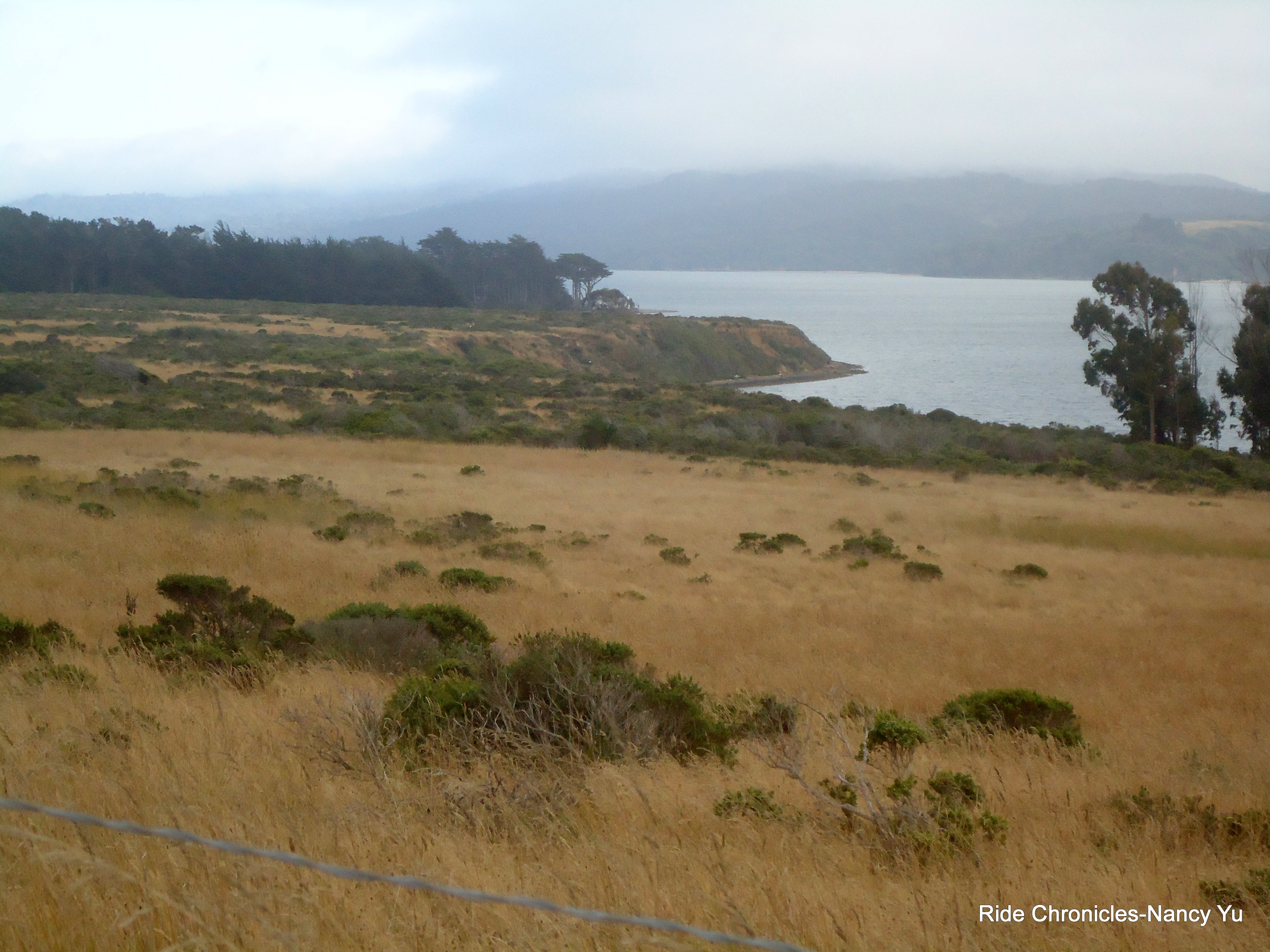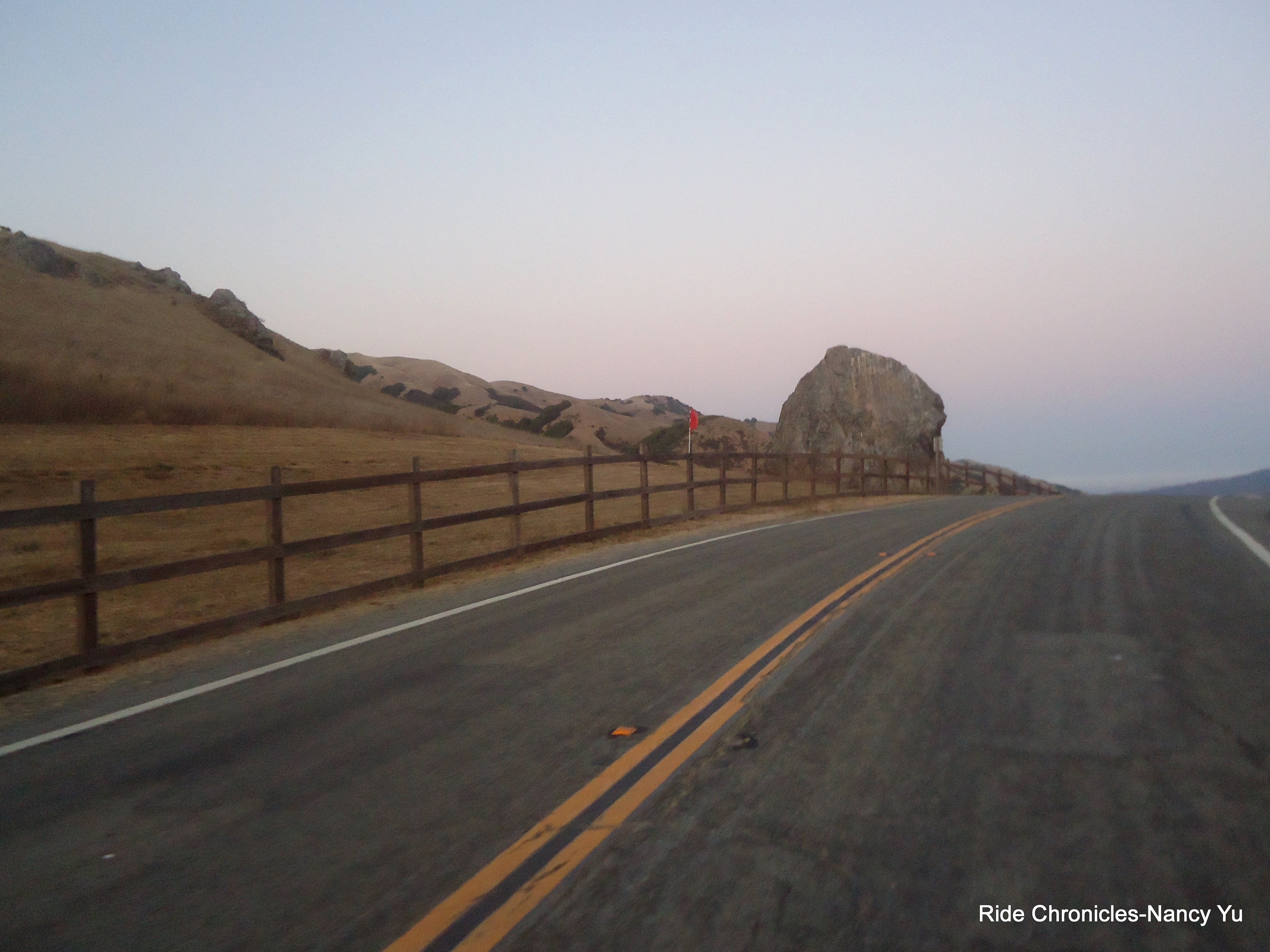 We exit the RS and head out on Middle Rd for the next 5 miles. It starts off relatively flat with golden grasslands as far as the eye can see. There are a few climbs on this unsuspecting road. The sun is still up and it feels great! Lee passes by in the BIKEVAN. I take the time to eat the remainder of the burrito I got earlier. I catch a glimpse of Michael’s friend, Bill Stephens driving his car as we’re making our way up the climb. The winds are back! It’s been following us for most of the day. As we near the last climb for the turn on Dillon Beach Rd, we see a couple of guys standing on the side of the road. Initially I though one of them had a flat. We pass by them slowly and Mark asks if they have everything they need. One guy replies” only if you have a spare fork with you”. His fork broke off the bike! Well, I guess we can’t help after all. He has to wait for a SAG vehicle to come by.