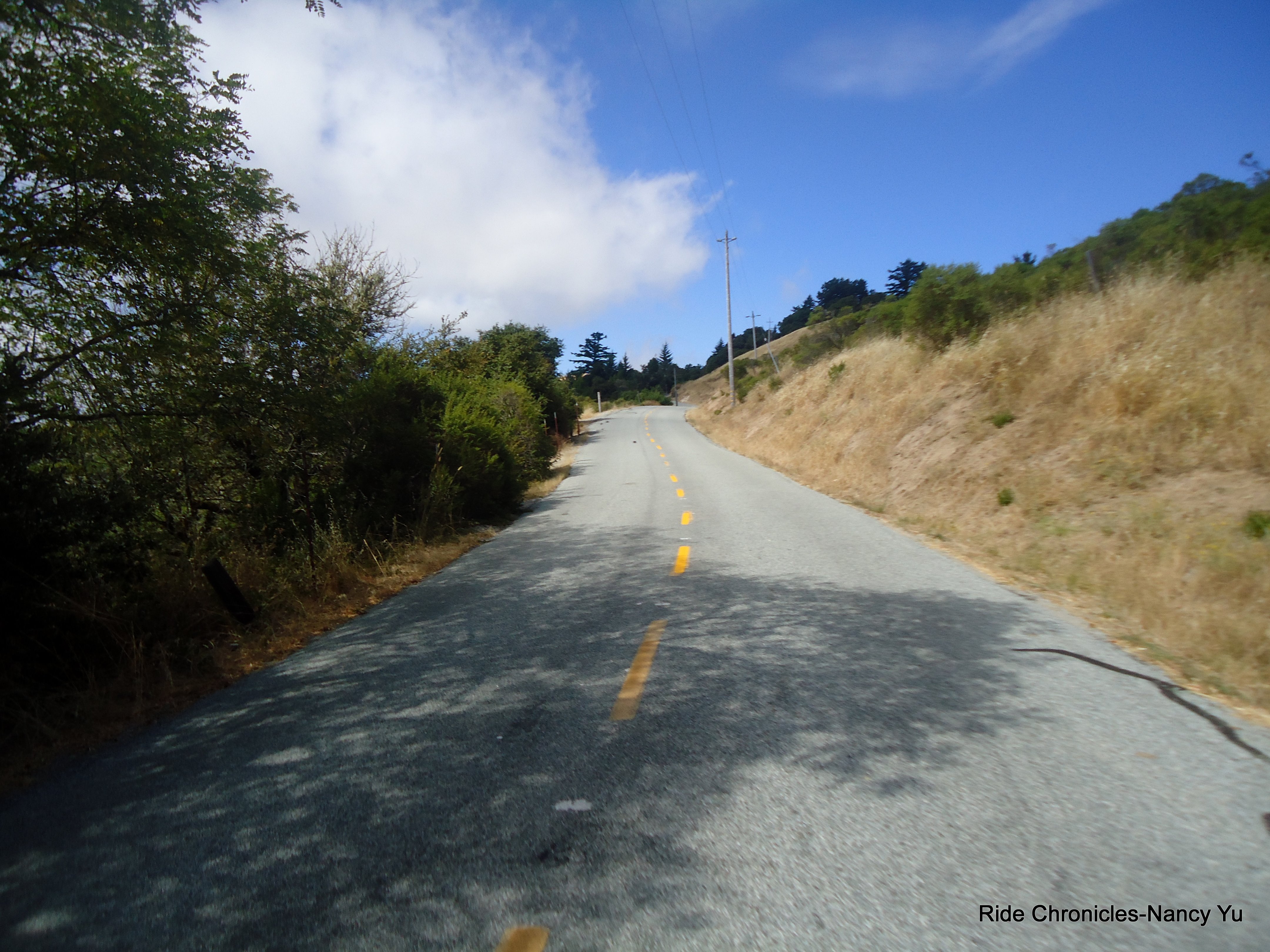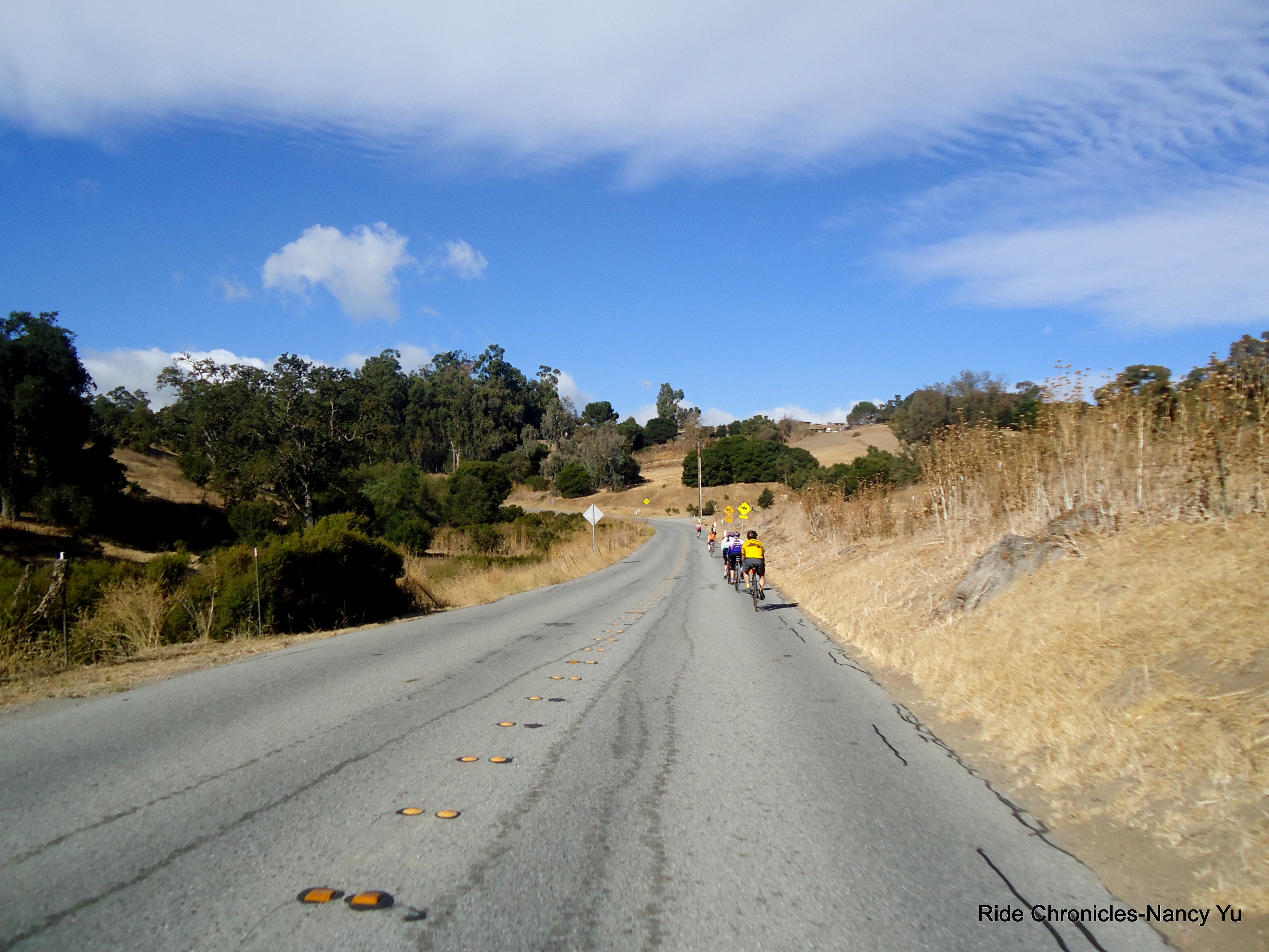 There is a brief regroup before we start the 7.6 mile climb on the west side of Alpine Rd. It’s absolutely beautiful on this secluded back road! The gradient ranges from 6-8%. There are a few short sections that hit 10-12%. It’s pretty cool and shaded for the most part. Once we reach the ranch near the false summit, the sun is out. The next climb is along the ridge and you’re fully exposed, it was wonderful to feel the warmth of the sun on my back. The views are spectacular! On this section, there are a few longer climbs that are in the 10-12% range but after you’re done, it’s a fun descent all the way to Skyline. There is a brief