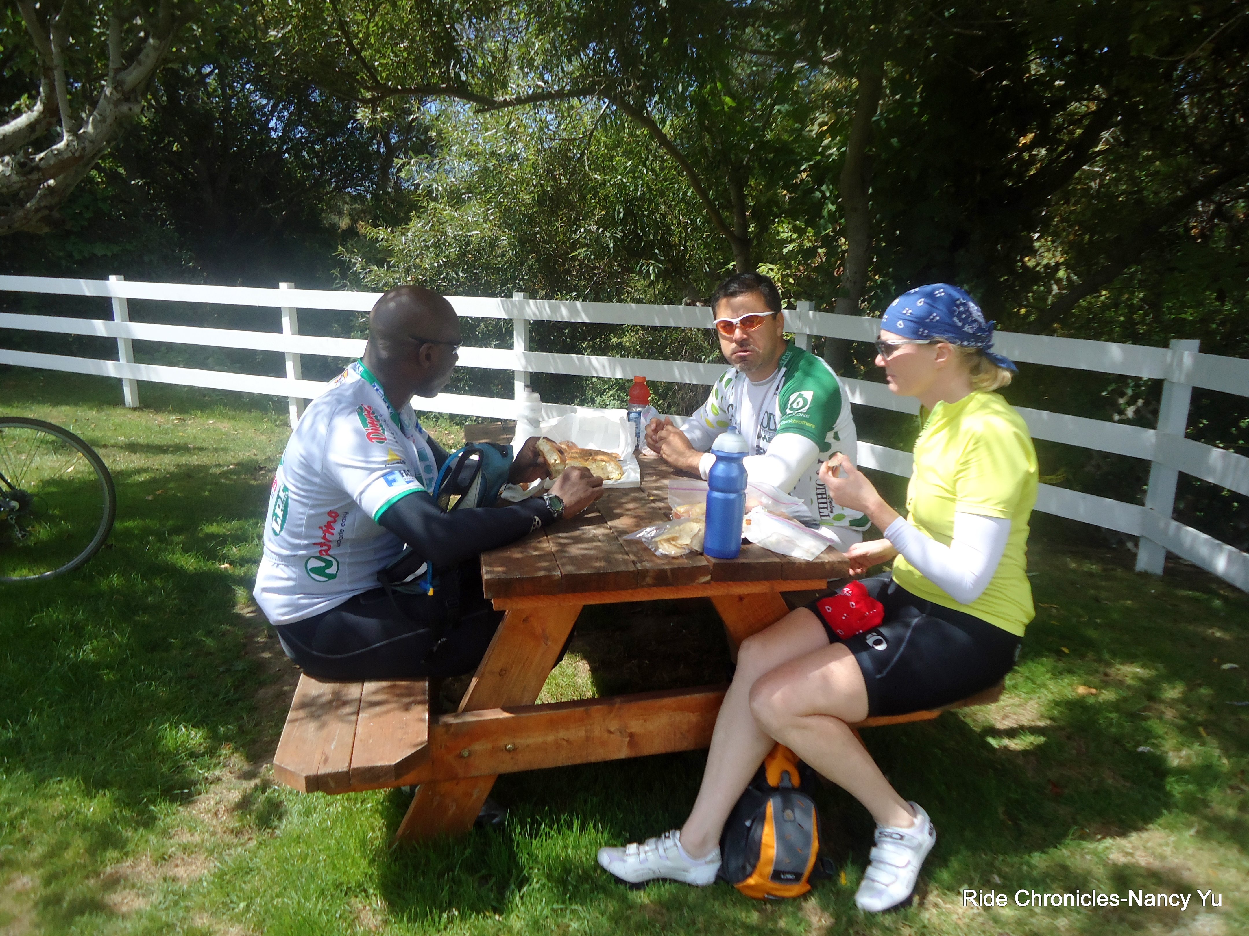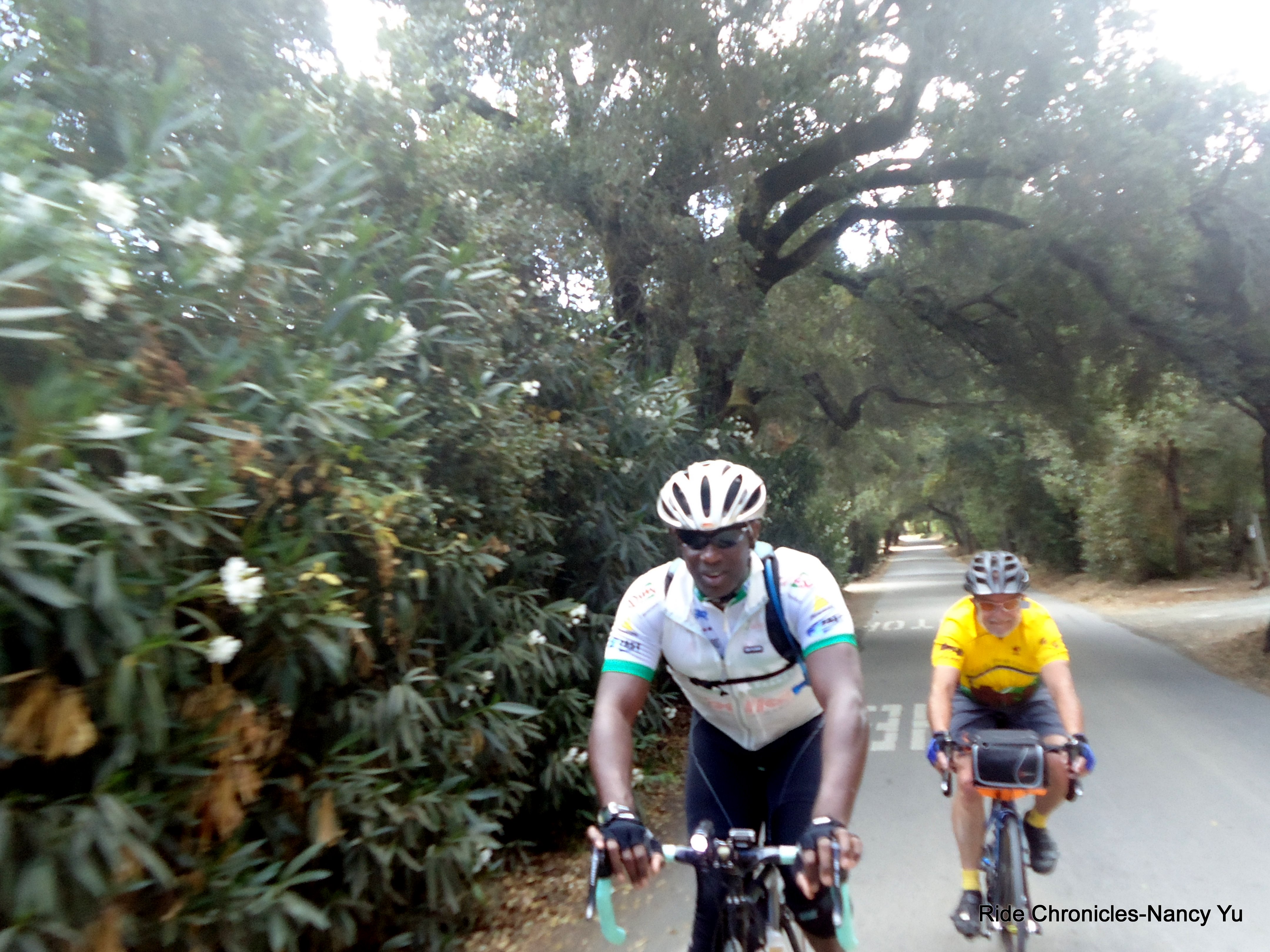 We make the left turn onto Stage Rd heading south. The climb up this way on Stage is around 5-6% and levels out to about 2-3% in between. The second climb up reaches 7-8%. It’s very quiet back here with barely any cars. There are plenty of cyclists descending from the opposite direction. I stop at the Cemetery to take a few pictures of the blooming pink flowers. Lunch is at Arcangeli’s Market. Picnic tables, water and porta-potties are in the back of the store. It’s a sunny 74 here.