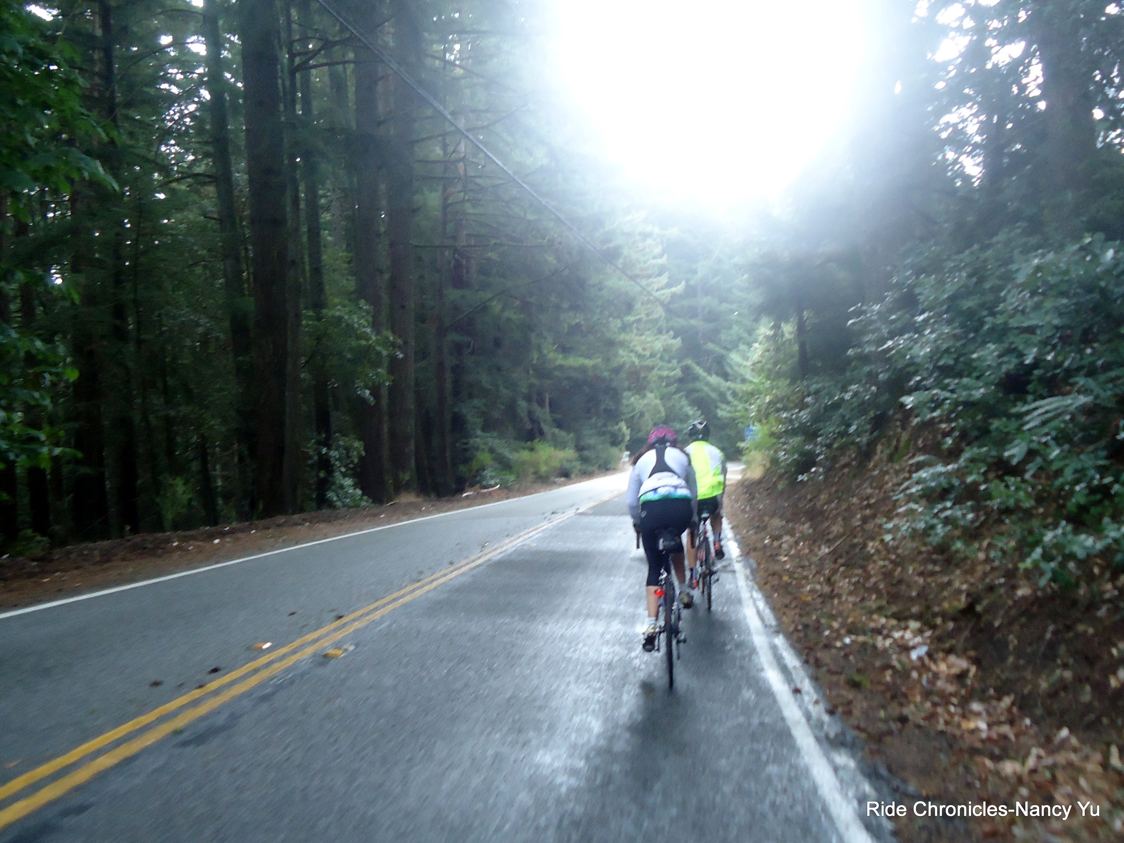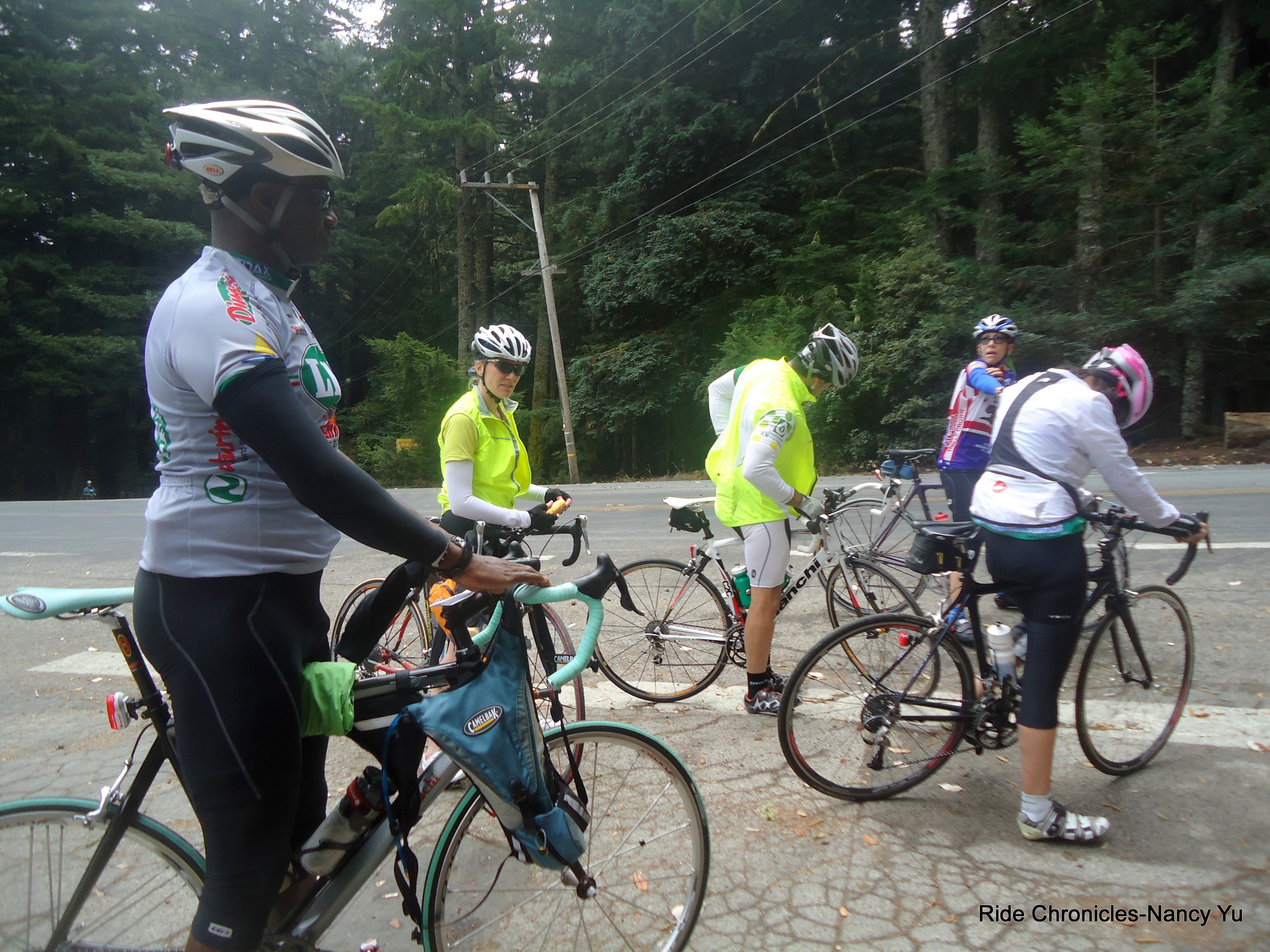 We head west on Skyline Blvd/Hwy 35 for 5.5 miles. It’s foggy and the road is damp on certain sections. We all get passed by a dozen or so people driving their souped up racing sports cars. The gradient on the climb is around 6-7% before the descent down to Hwy 84.