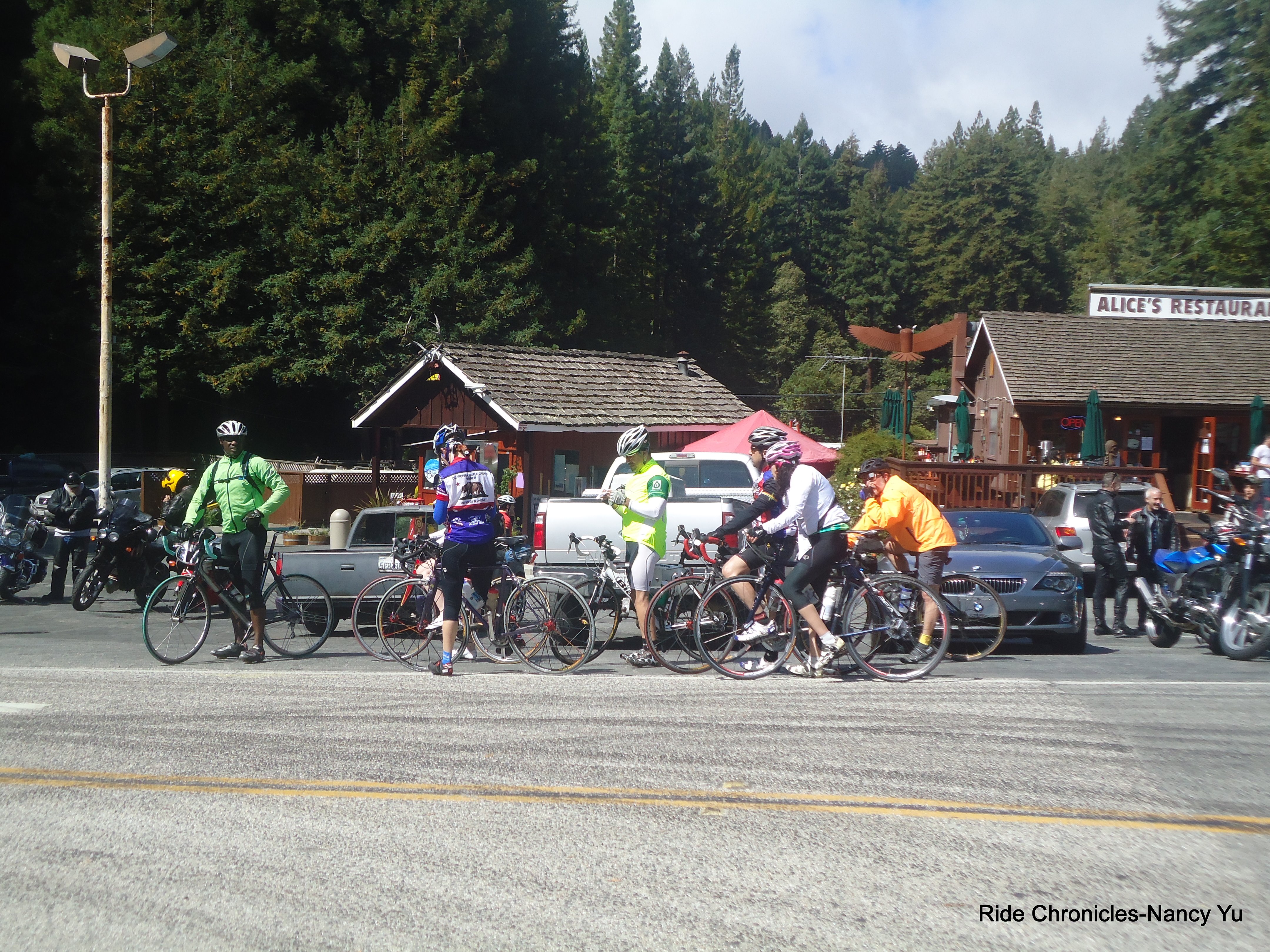 We head out on Arastradero to Alpine and Portola Rds. There is a lot of traffic as we ride through town. Portola ends and becomes Woodside Rd. From there we take Tripp Rd to Kings Mtn. There is water available at the Woodside Store Park.
