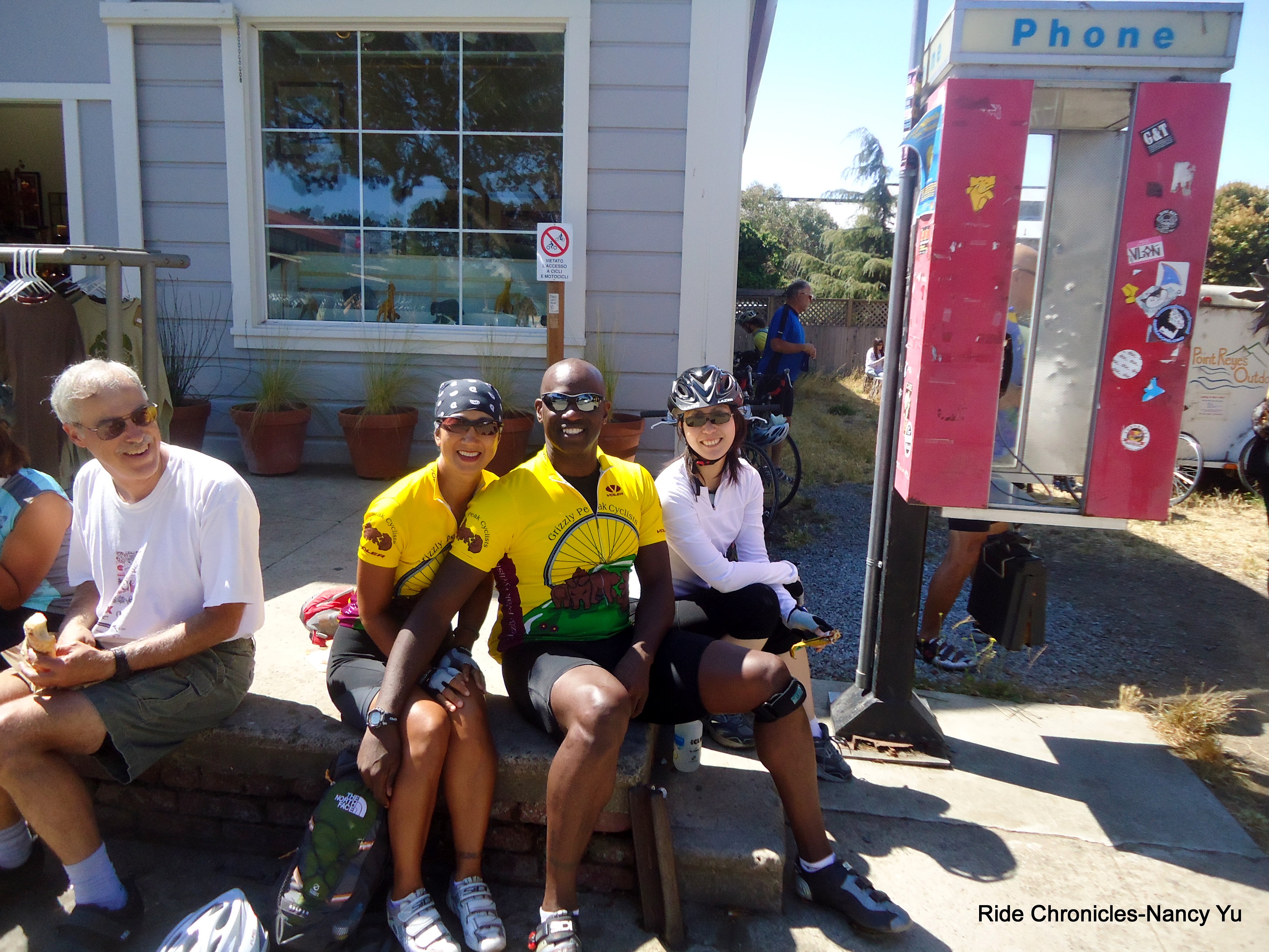We all head out on Nicasio Valley Rd and Pt Reyes-Petaluma Rd. The lunch stop is at Point Reyes Station. The usual place for everyone to hang out is in front of the Bovine Bakery. Water and restrooms are available at the park behind the Palace Market.