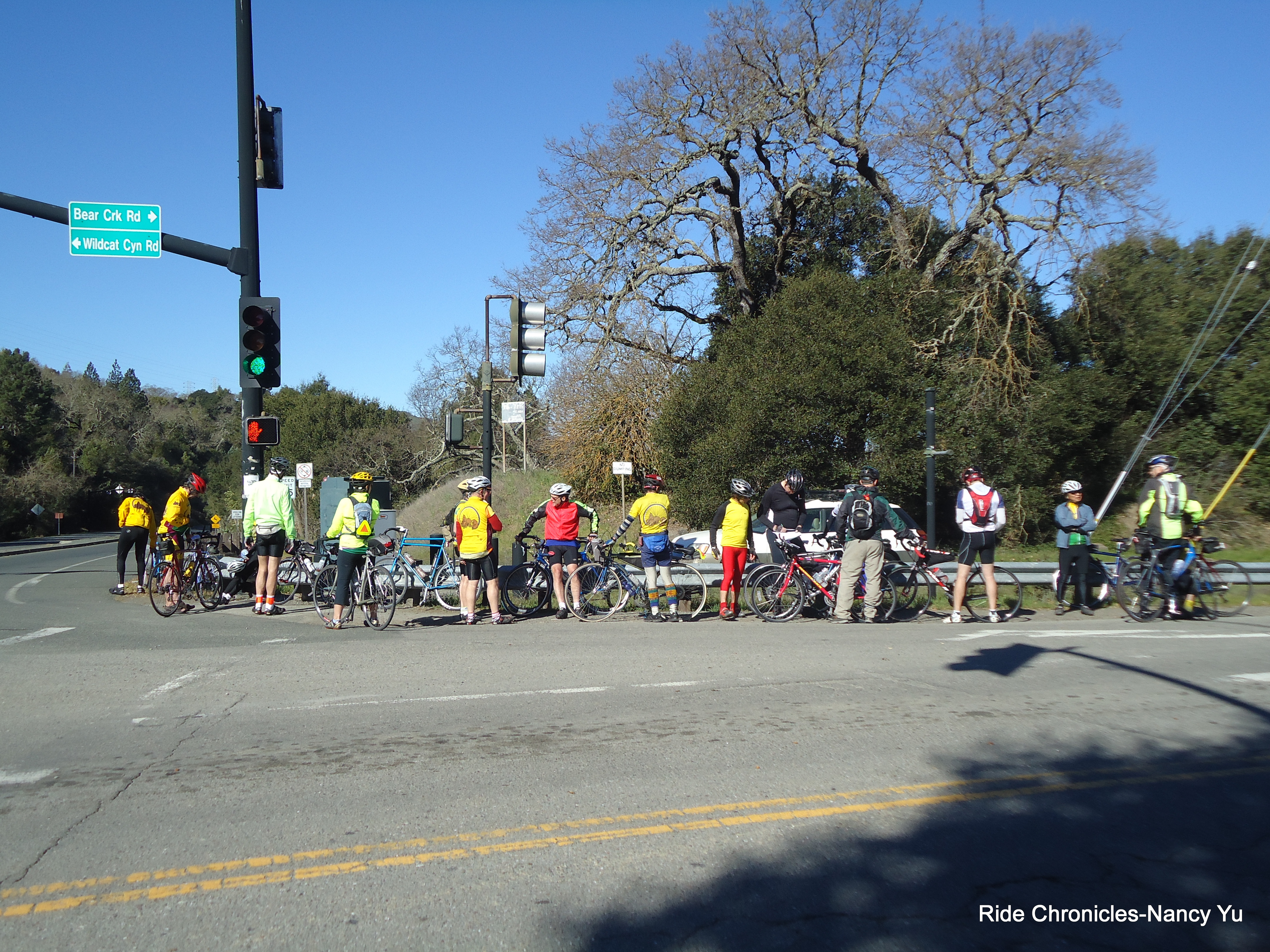 I get to SPDR and don’t see any other club members there, so I decide to climb up Wildcat to catch them on the way down. The first mile has an average grade of around 6-7% and then eases up as you reach the wide turnout area at El Toyonal. The remainder of the way up Wildcat averages around 3%. I stop for a bit at Inspiration Point and see several members ride by. I join them for the descent on Wildcat. There is a brief regroup at the corner of Bear Creek Rd & SPDR.