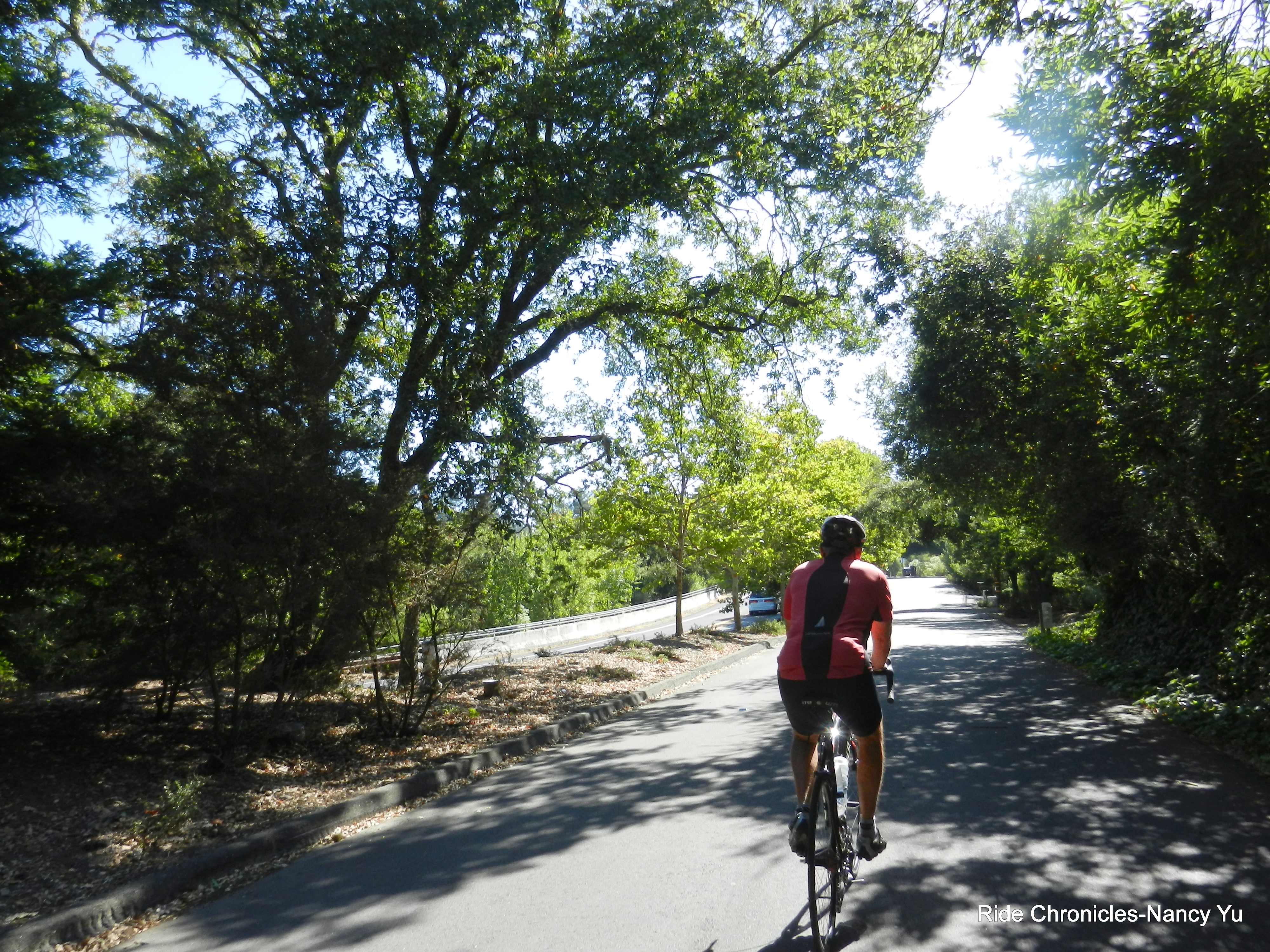 We descend Happy Valley Rd into Lafayette and make a left onto Deer Hill Rd. We continue on 1st St to Golden Gate Way and 2nd St. The turn on Moraga Blvd takes us onto the Lafayette-Morage Trail/bike path.