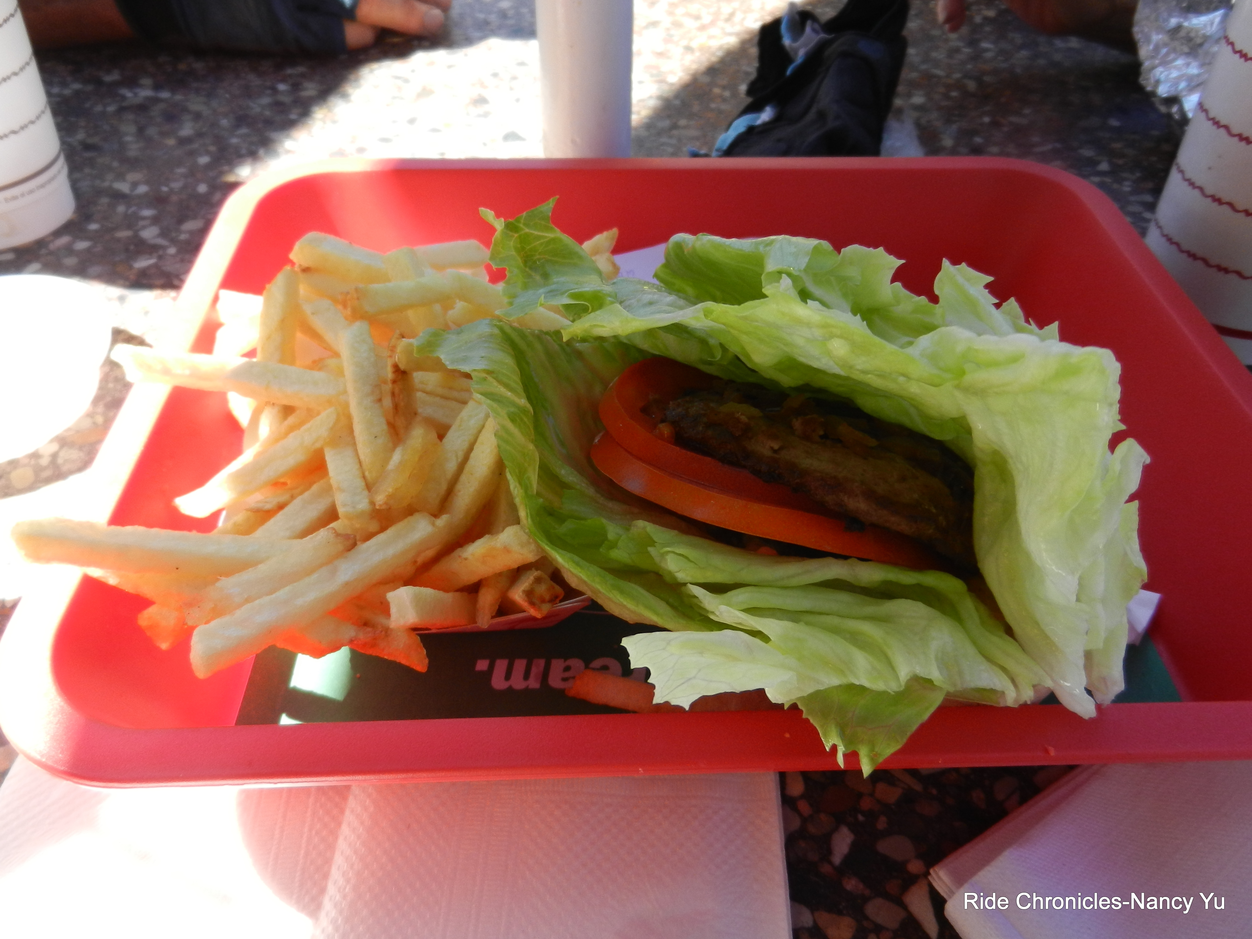 We arrive at our destination lunch stop at In N Out Burger in San Ramon. I order a hamburger protein style/no bun with fries. There is ample outdoor seating for us and the bikes.