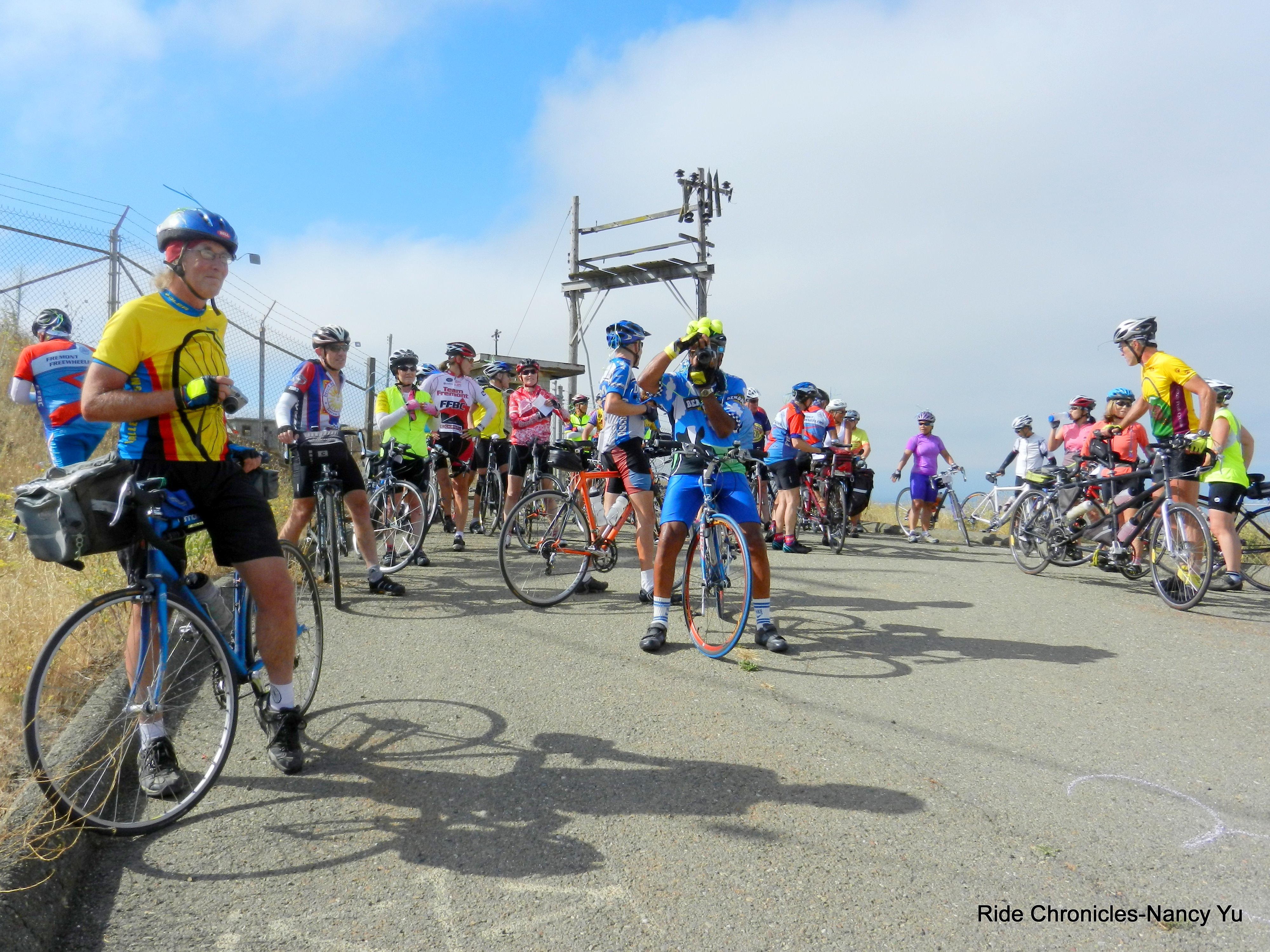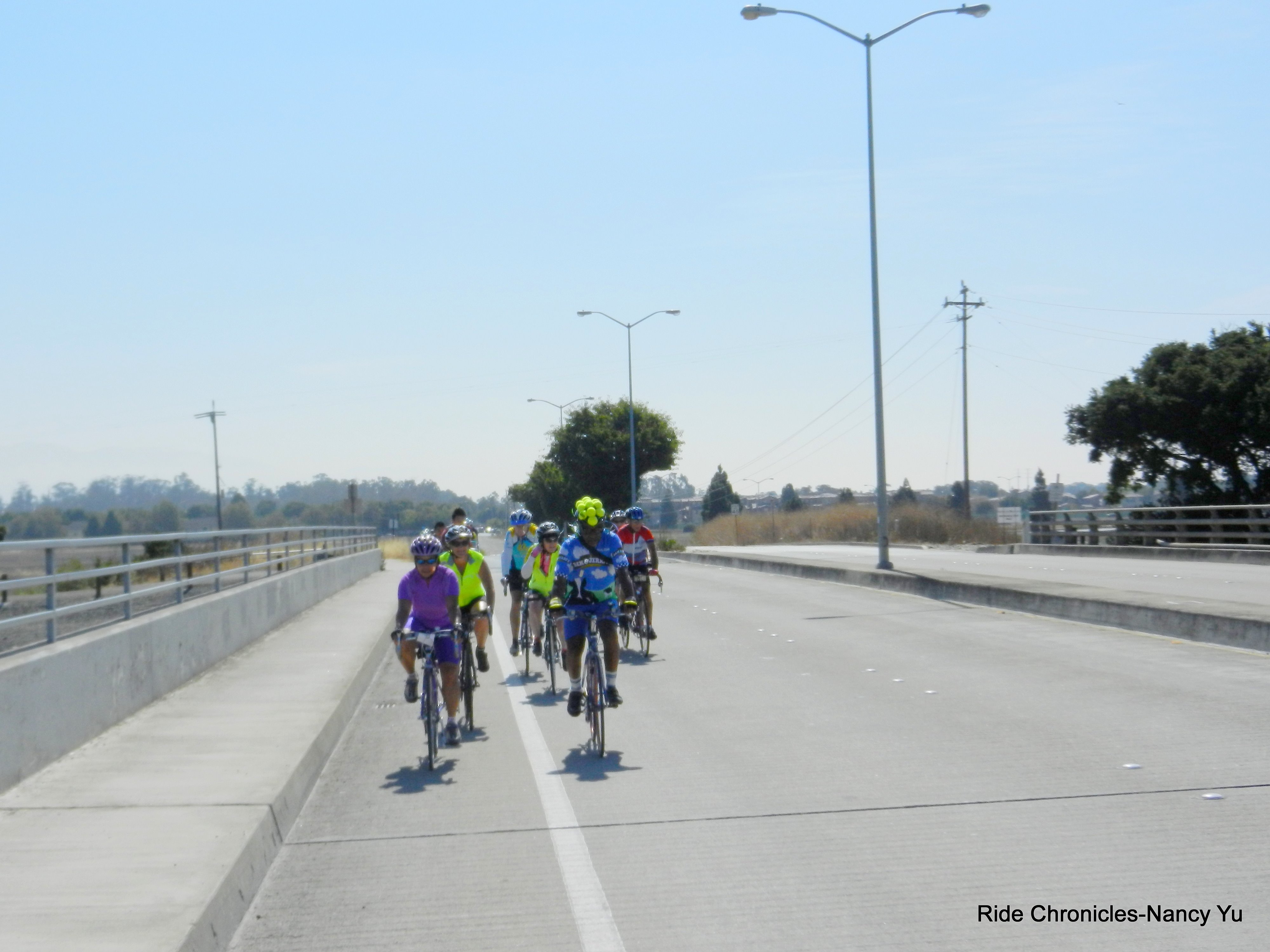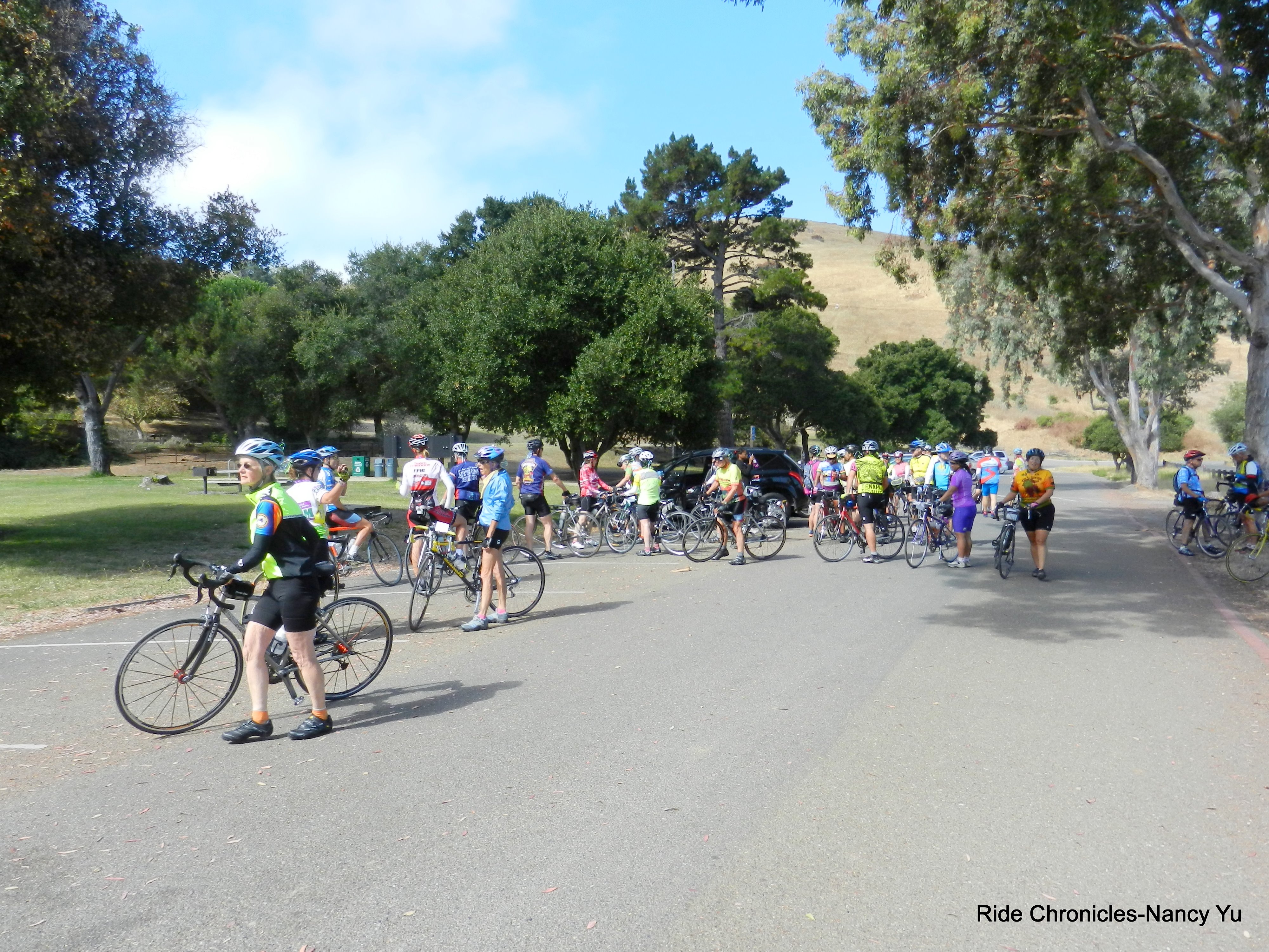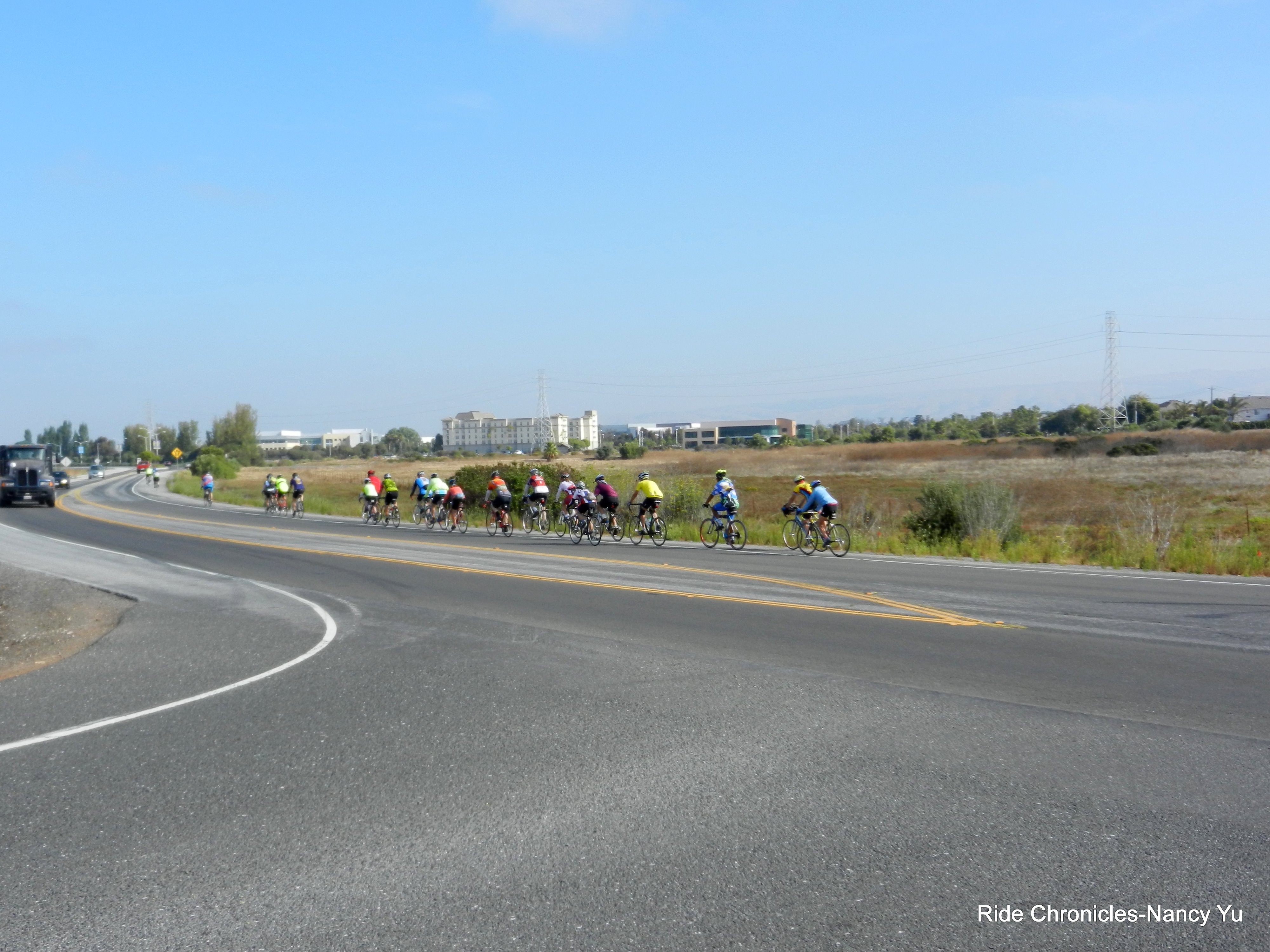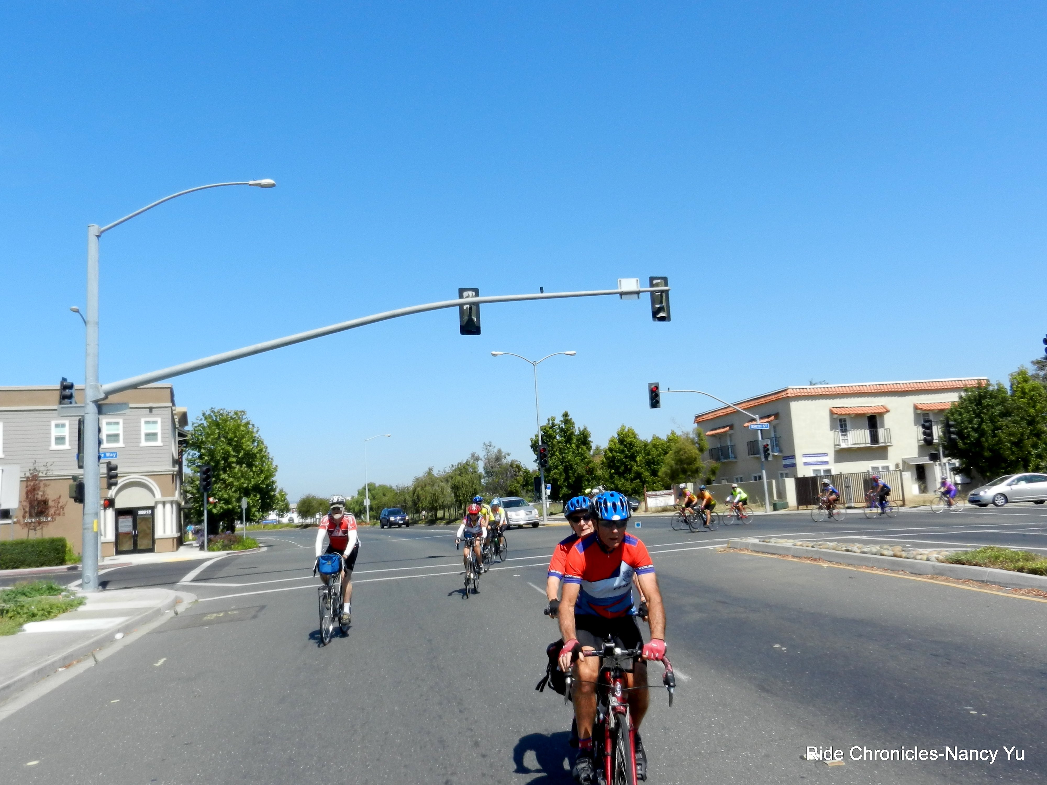 We exit the Visitor Center on Marshland Rd and take Thornton Ave/Paseo Padre Pkwy to Patterson Ranch Rd. We stop at an intersection for me to take a video of all the riders passing by. It’s a huge group!