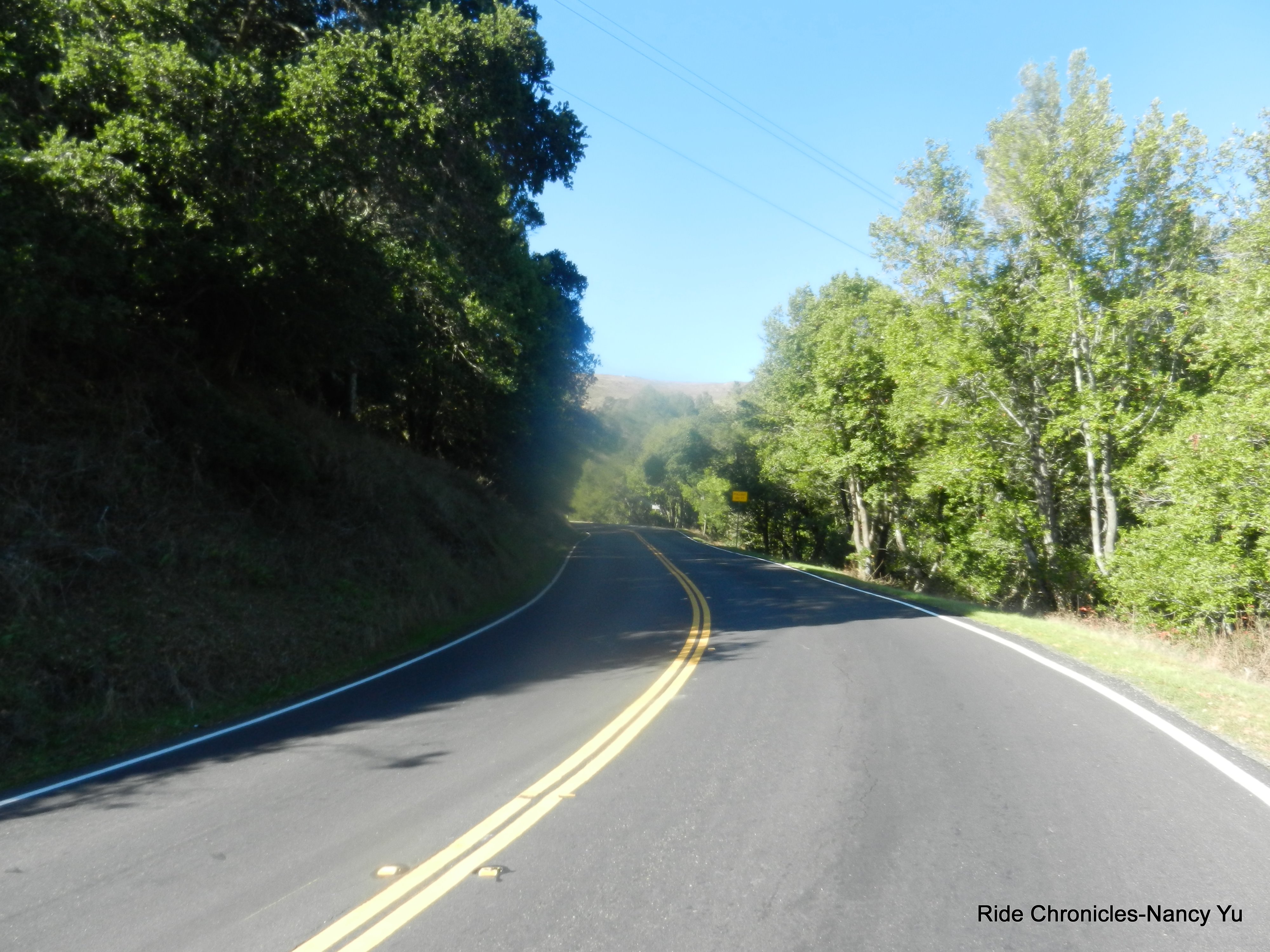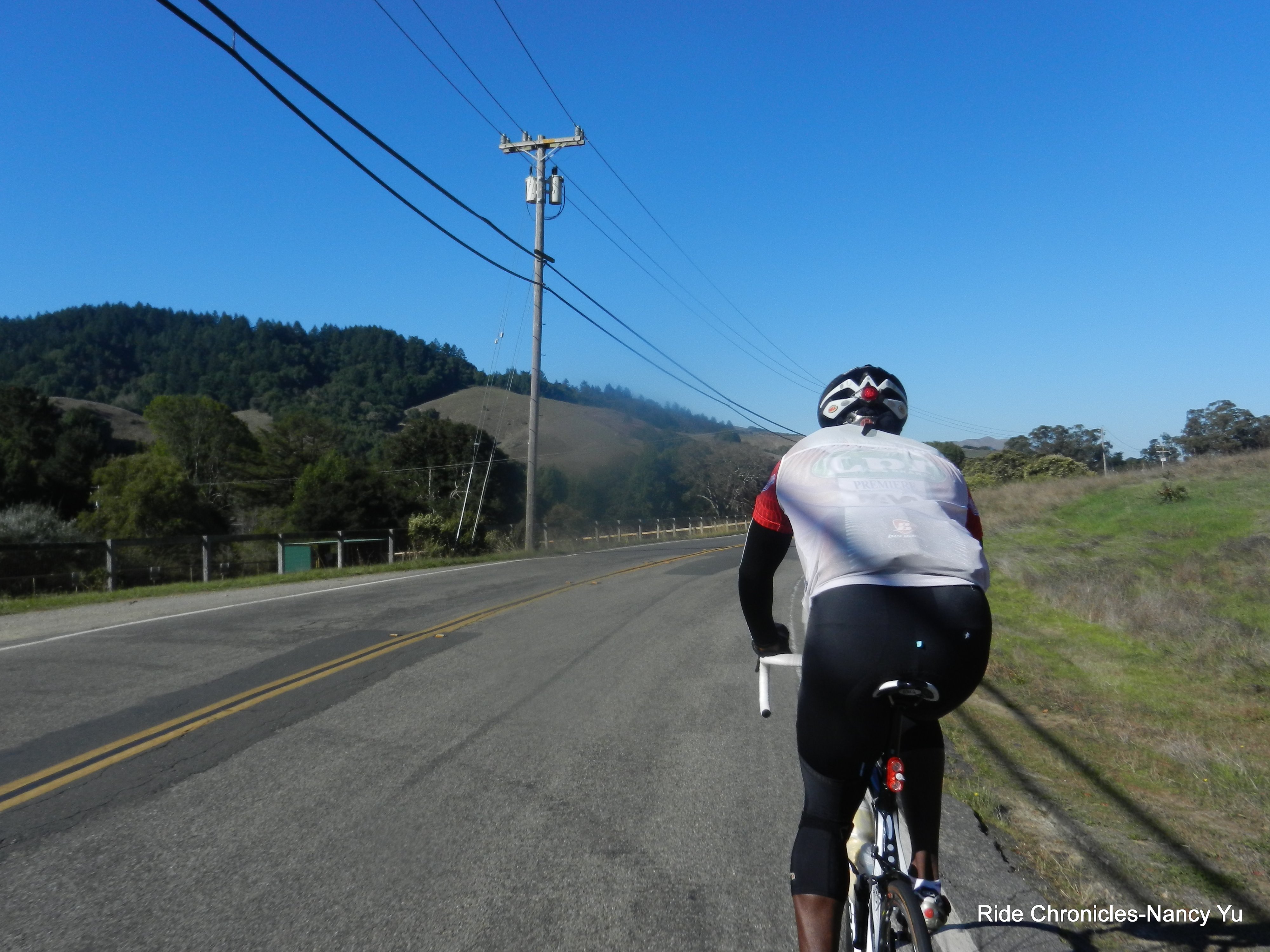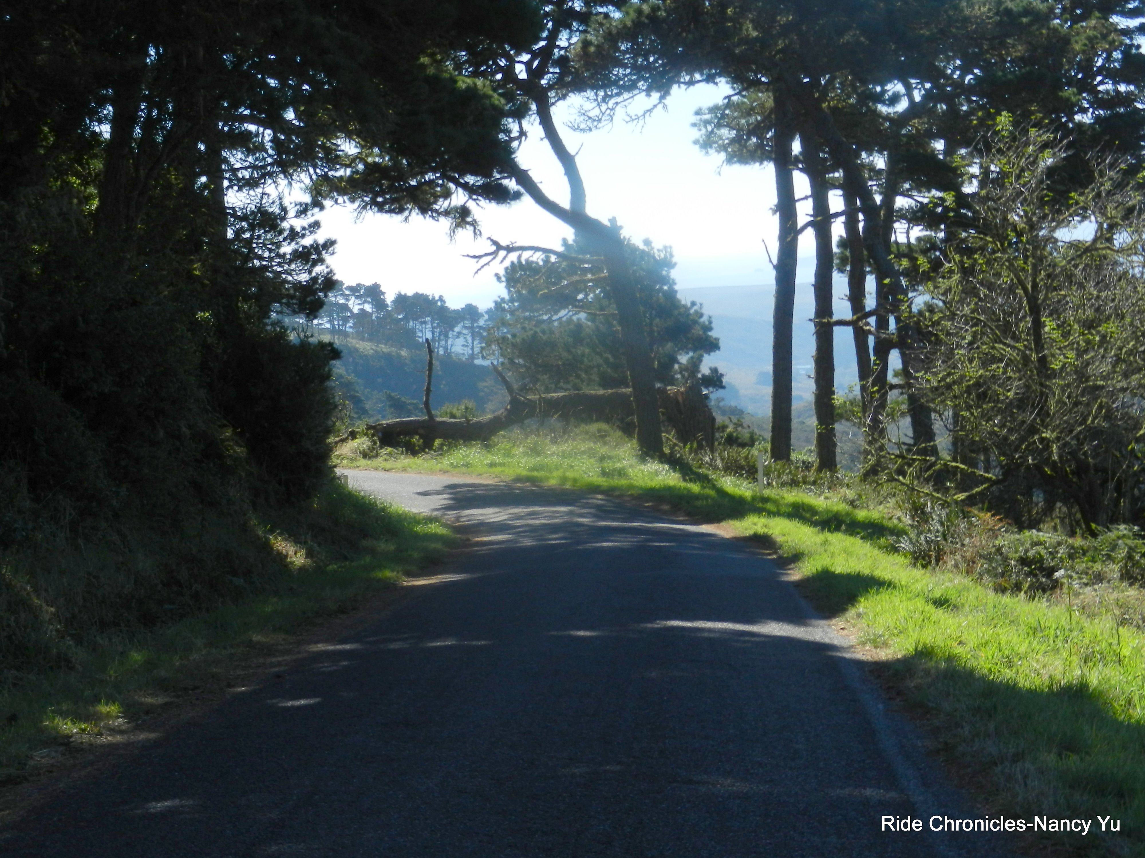 The first few flat miles heading west on Lucas Valley Rd is a good warm up to the climb up to Big Rock. The mile climb has an average grade of about 6.5% with sections that hit 8-9%. The last few turns along the guardrails takes you to the top. The 5 mile descent on Lucas Valley is really fun; the sweeping turns and small rollers takes you through a redwood forest and onto Nicasio Valley Rd.