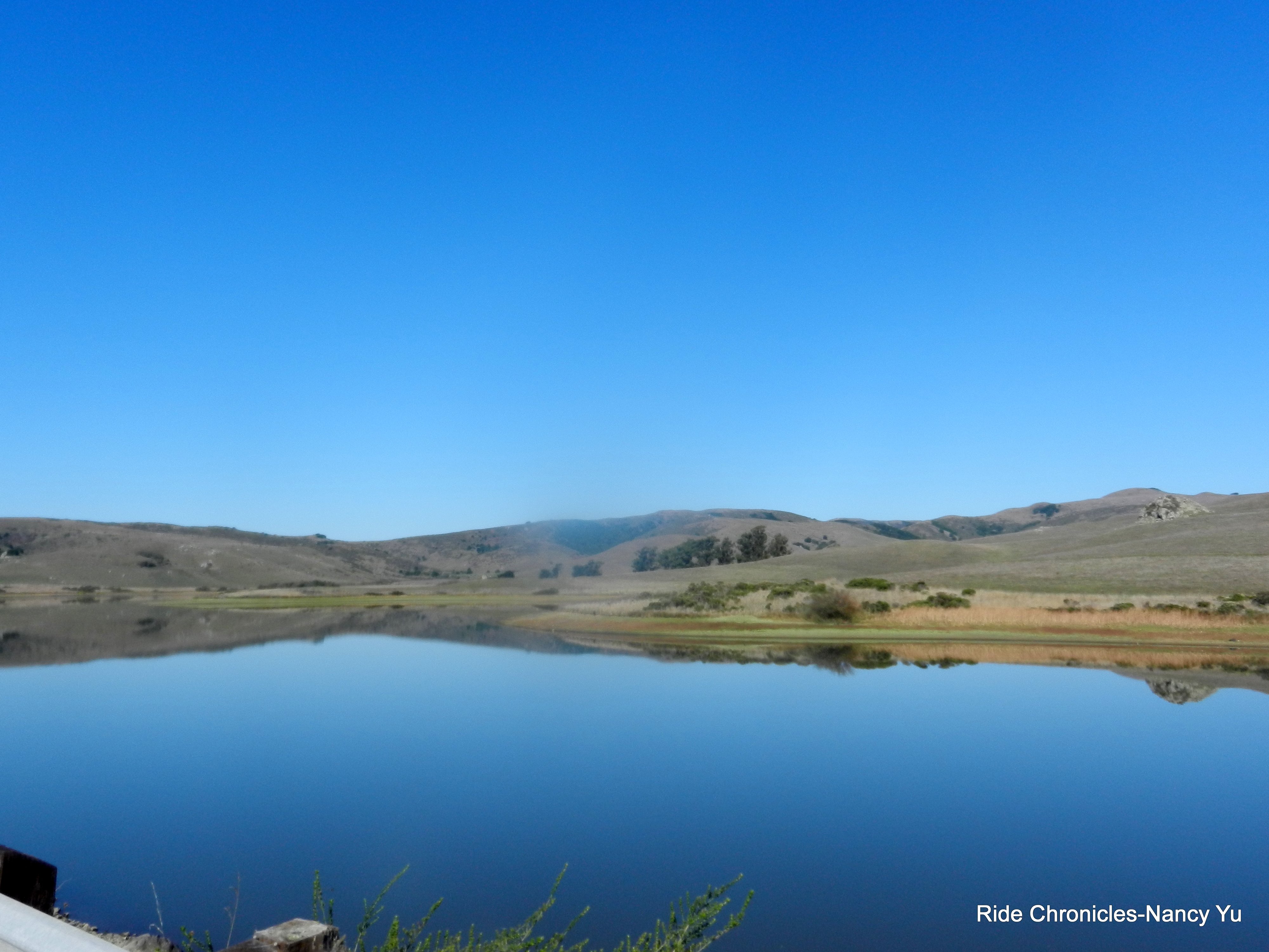 We continue on Nicasio Valley Rd, ride pass the reservoir and head west on Pt Reyes-Petaluma Rd for the next 3 flat miles. The views of the reservoir and the surrounding hills are fabulous! The slight downhill takes us to the intersection at the colored bridge.