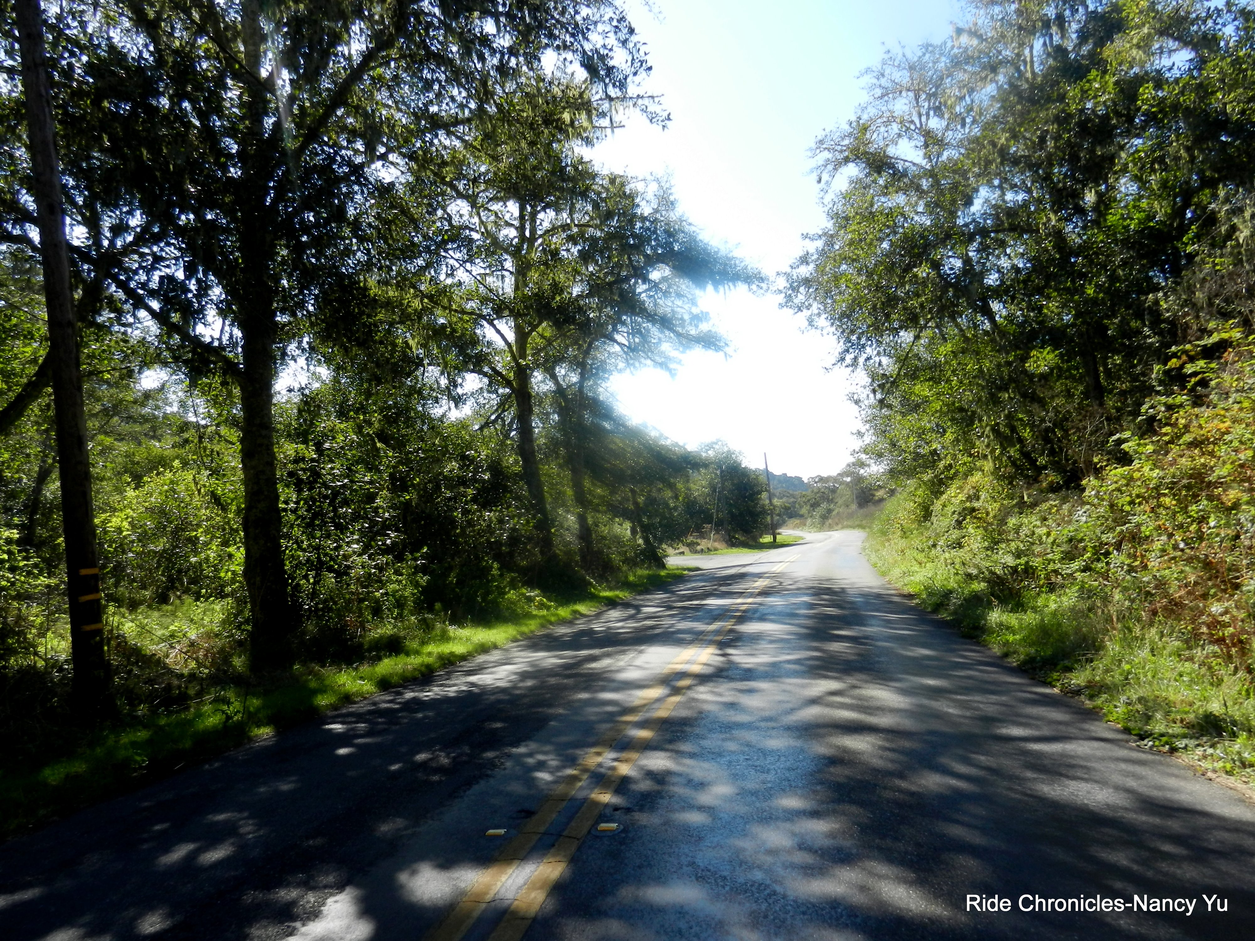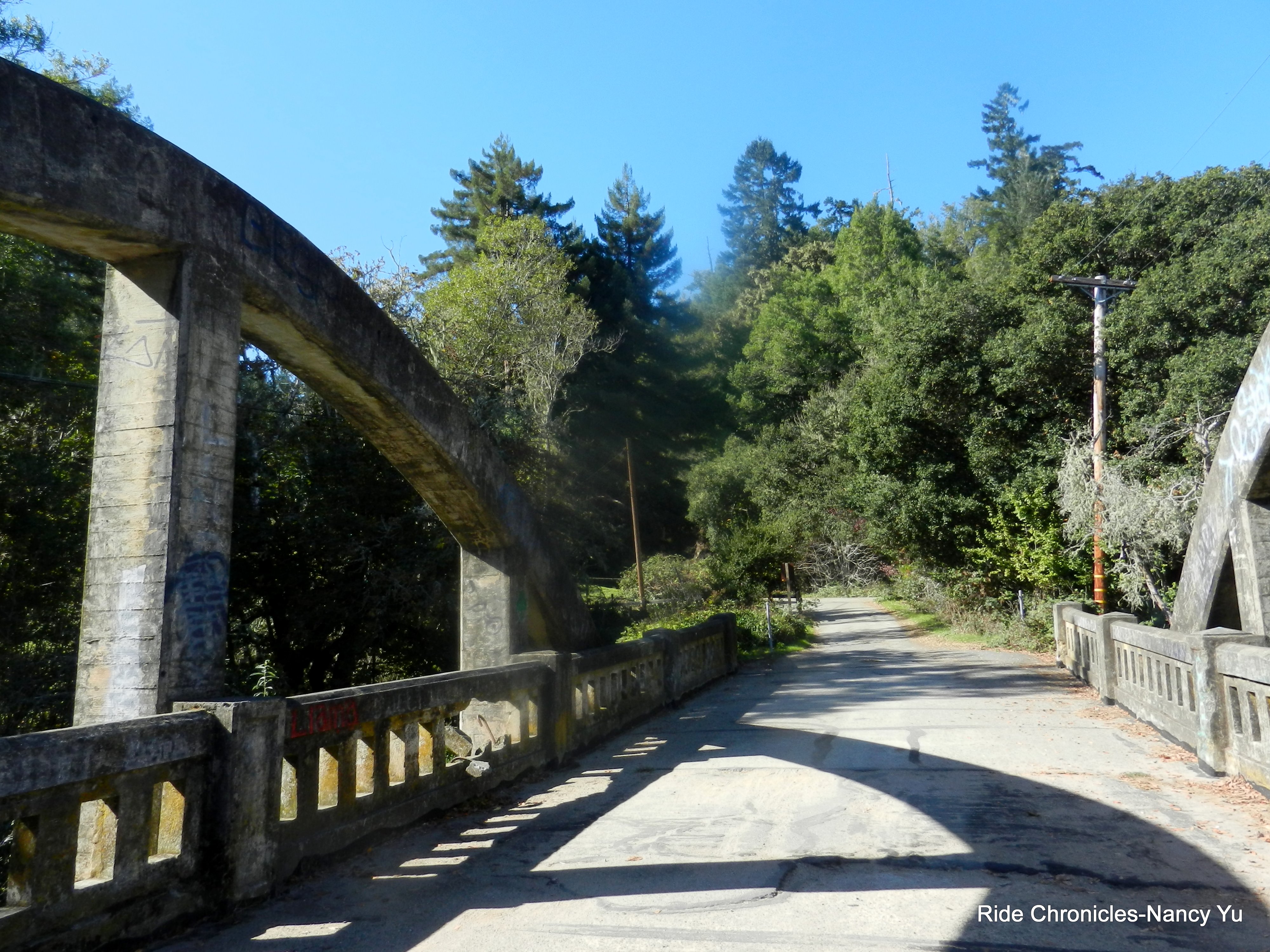 Before reaching Sir Francis Drake Blvd, we take a slight detour and cross the old platform bridge which eventually leads us back out to the main road. The climb up the backside of Olema Hill is less than a mile with an average grade of 5.6%. The gradient is a steady 7-8% as you near the top. Please obey the stop sign; the road becomes a single-lane for a very short section. Share the road and watch for cars; traffic is heavier on the weekends.