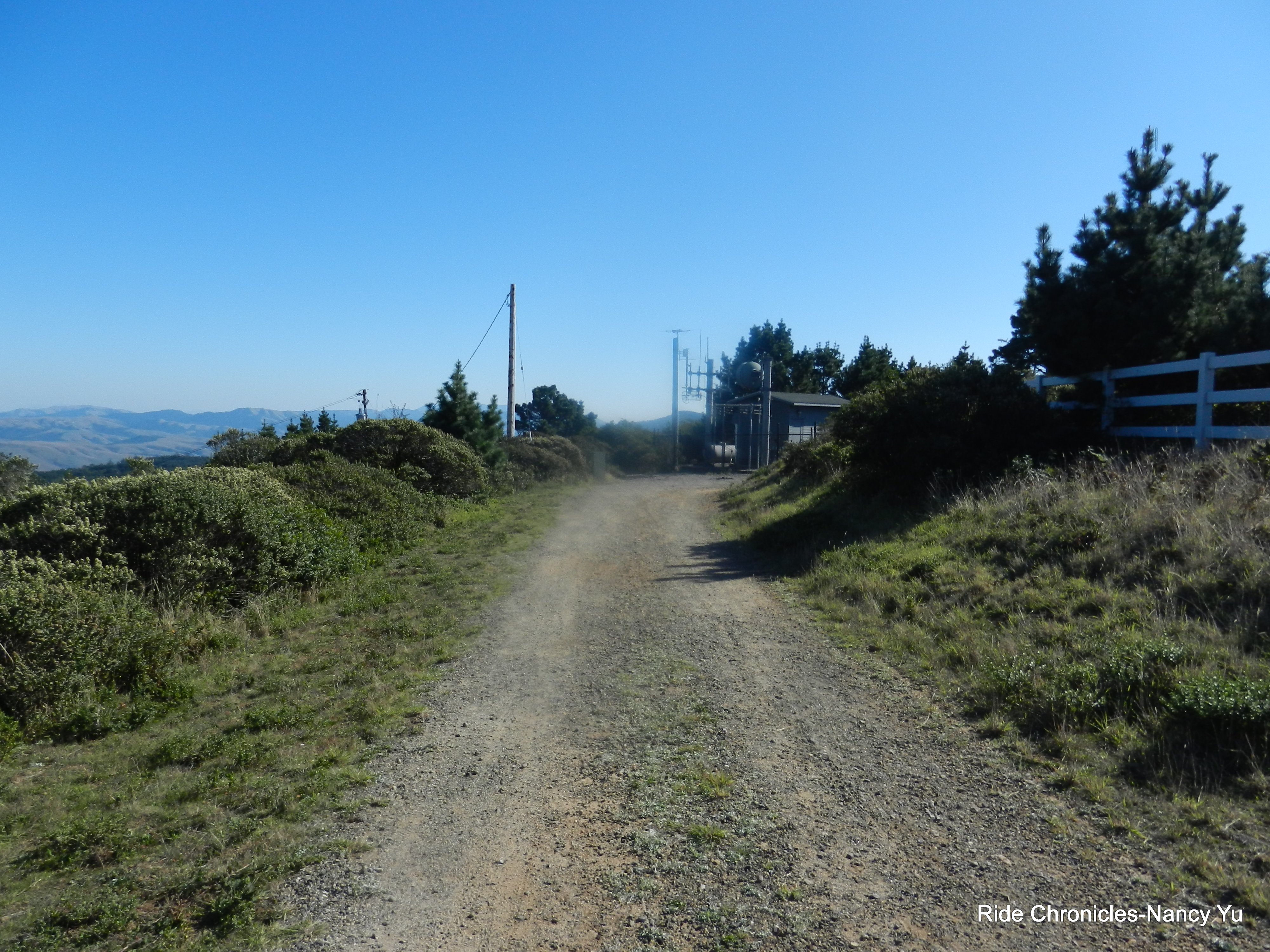 The accessible road ends at a large dirt trailhead parking area. No porta-pottie or water is available here. Mt Vision Rd continues for another mile beyond the closed gate; it’s a gentler climb past Mt Vision to the summit of Point Reyes Hill at 1336 feet. There is no thru traffic and it’s incredibly quiet and calm up here. The road dead-ends at the radio tower and becomes a dirt trail for mountain bikers.