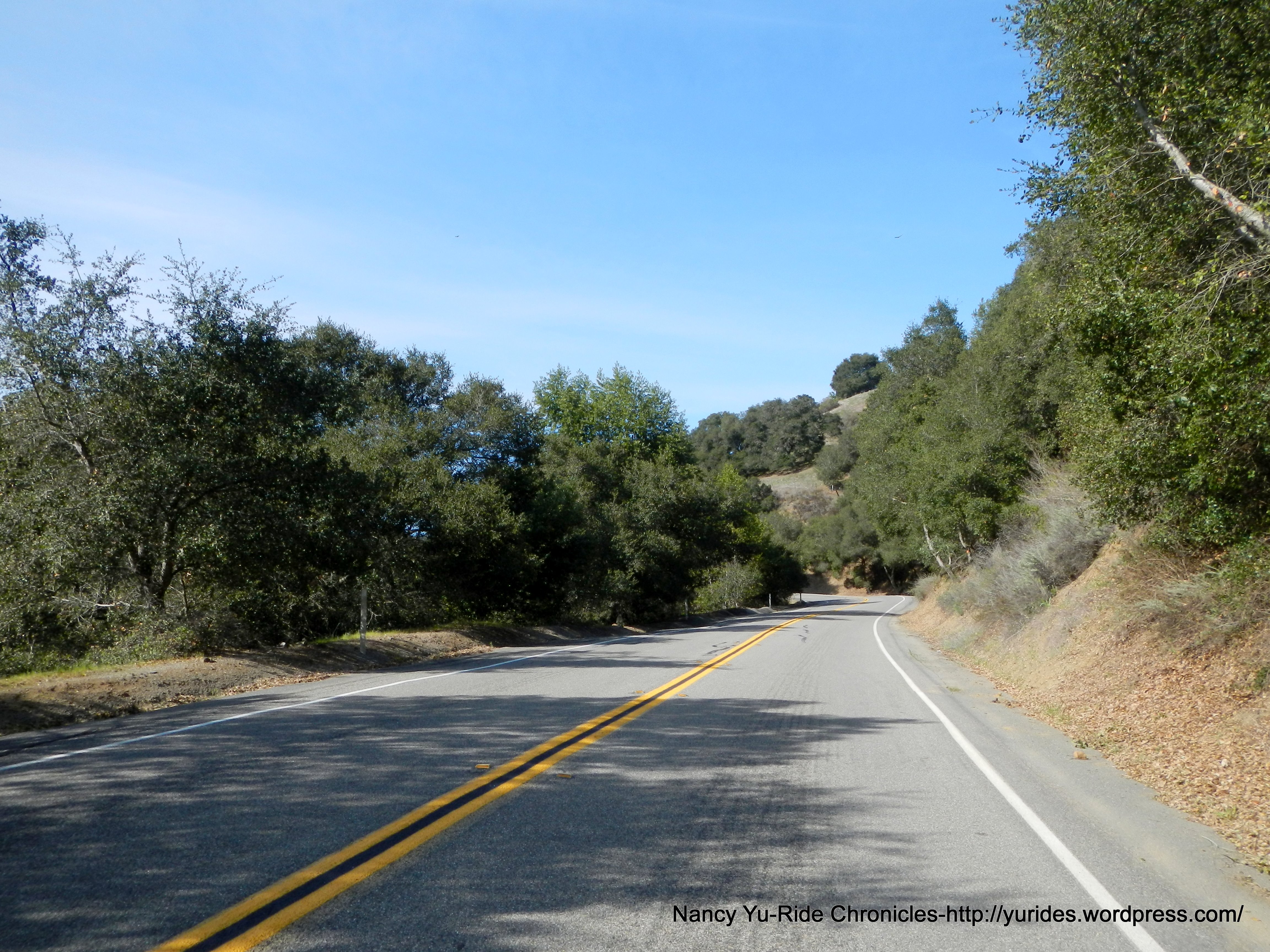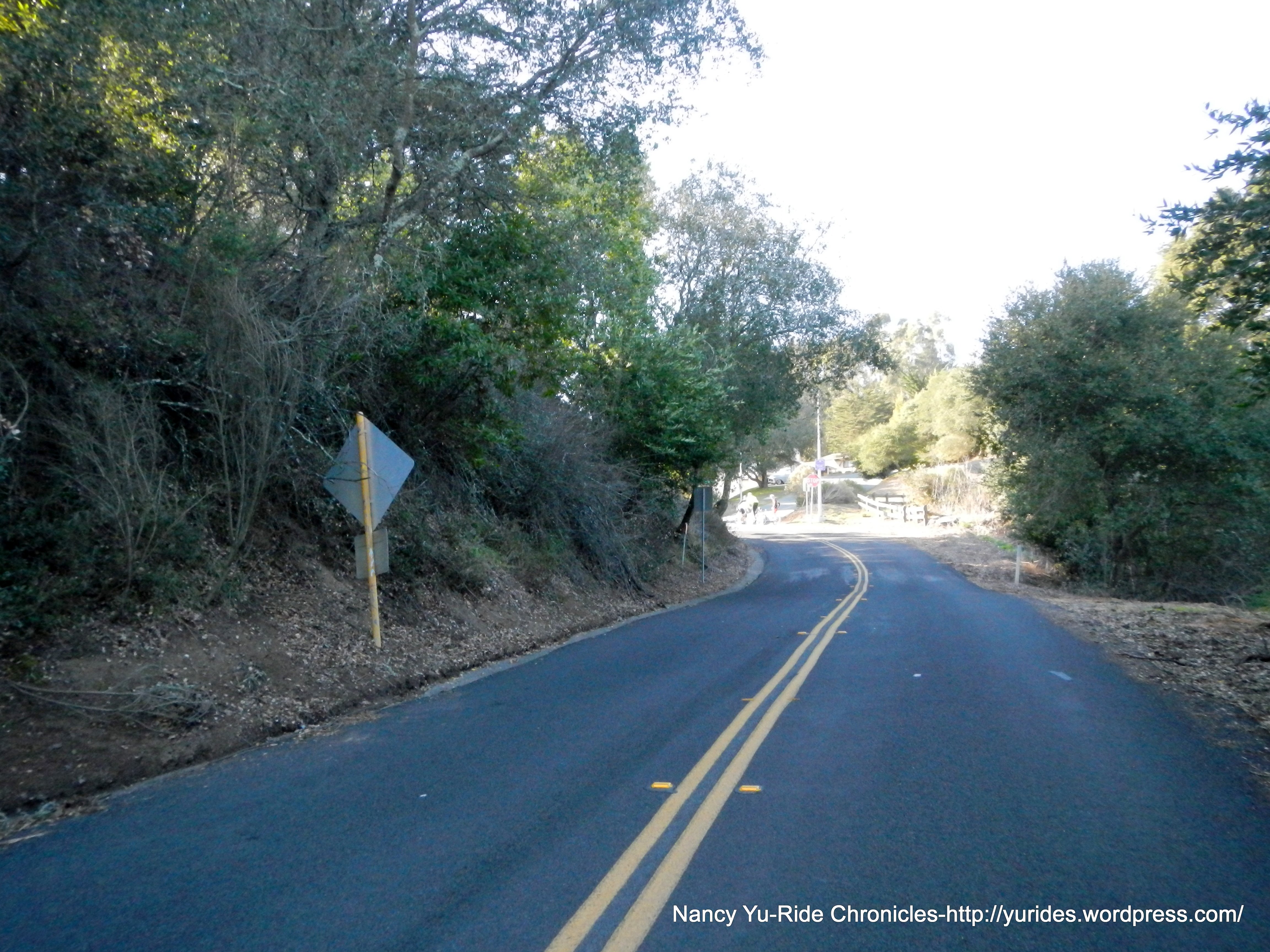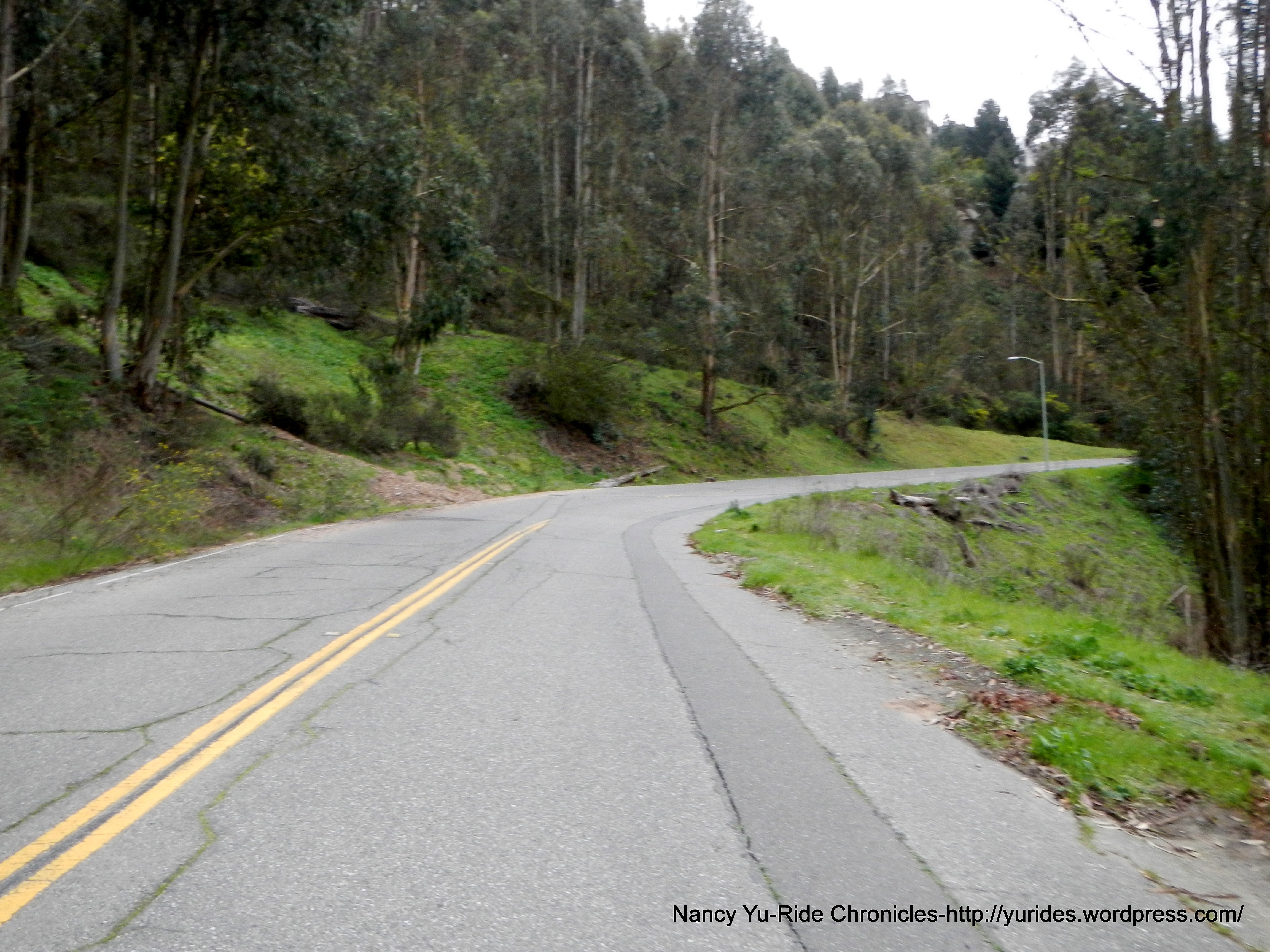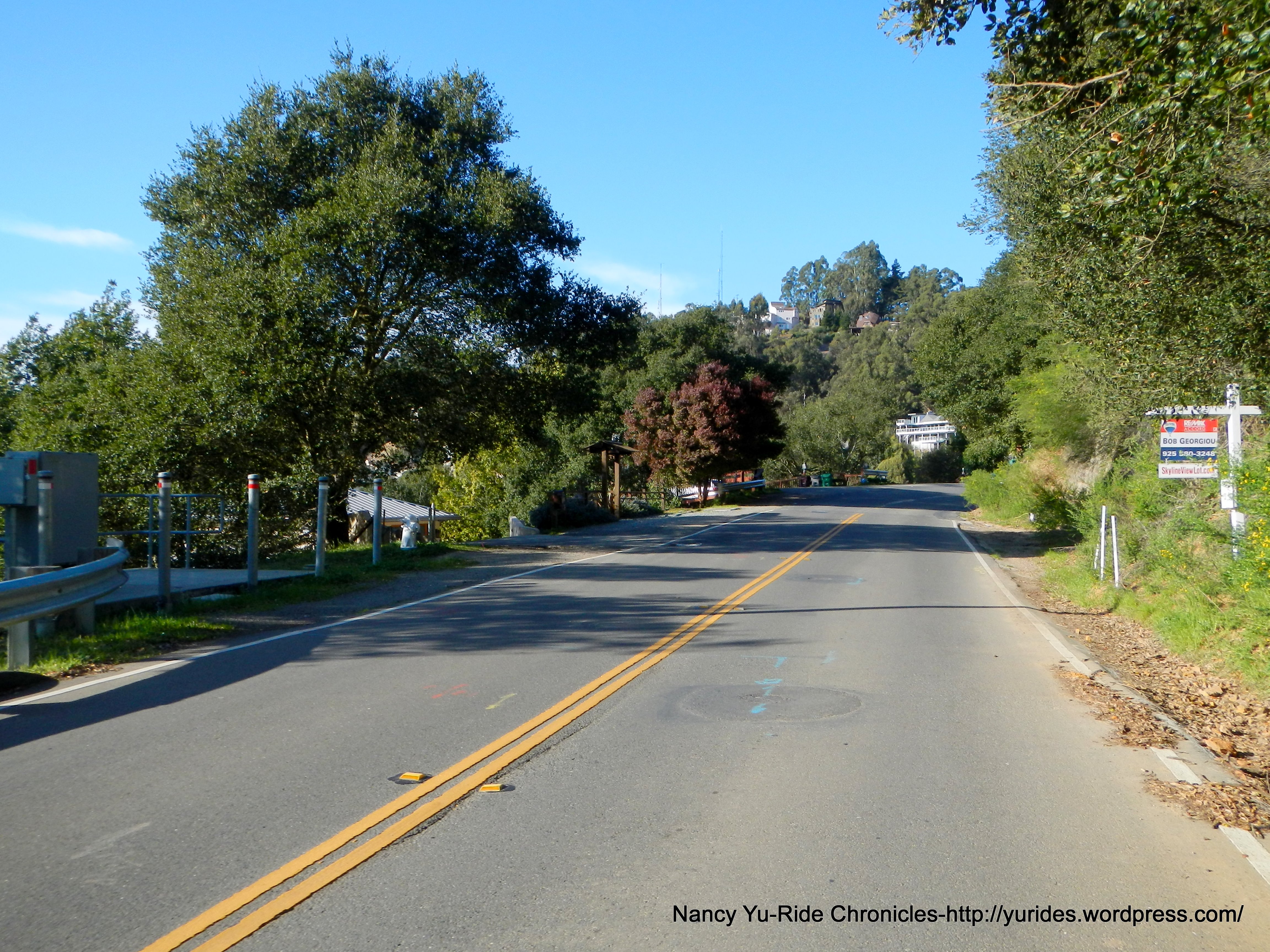 We exit the park and head south on Skyline Blvd to Redwood Rd. The first few miles on Skyline is slightly downhill, then it’s rolling terrain all the way to the summit at Robert’s Park. The 3/4 mile section of road between Manzanita Dr and Pinehurst are really bad; it’s a mine field of huge potholes and large fissures-watch out!