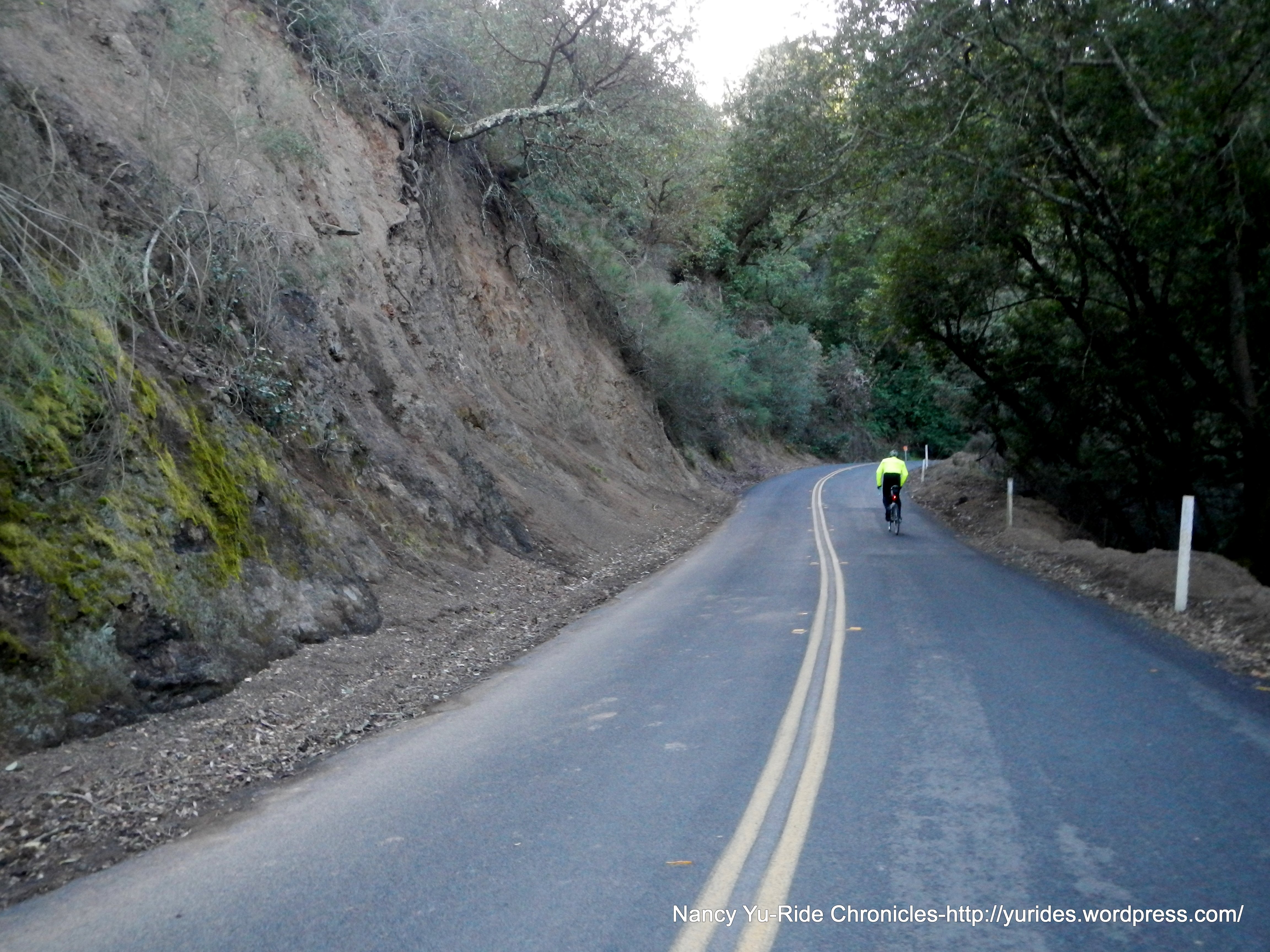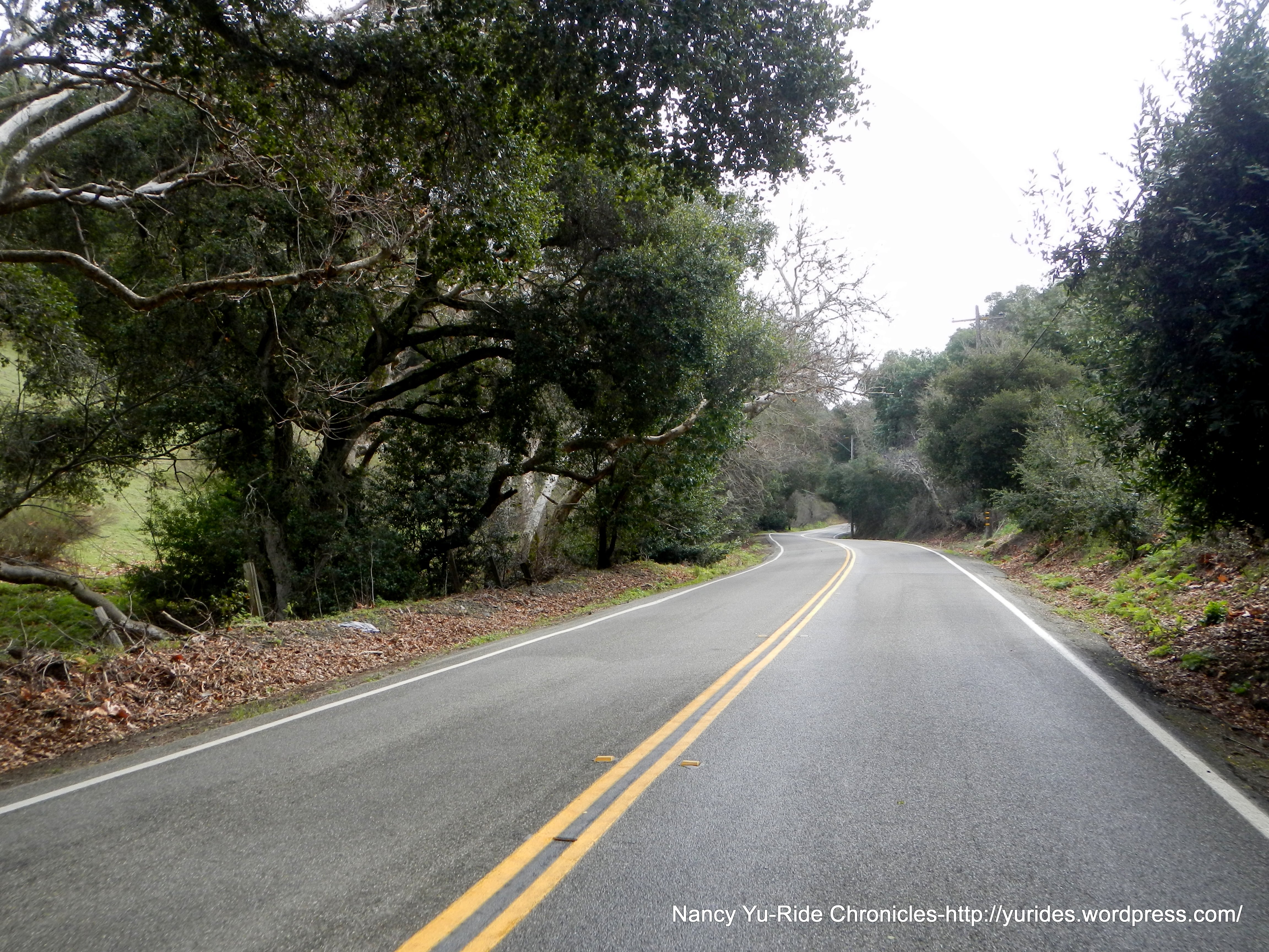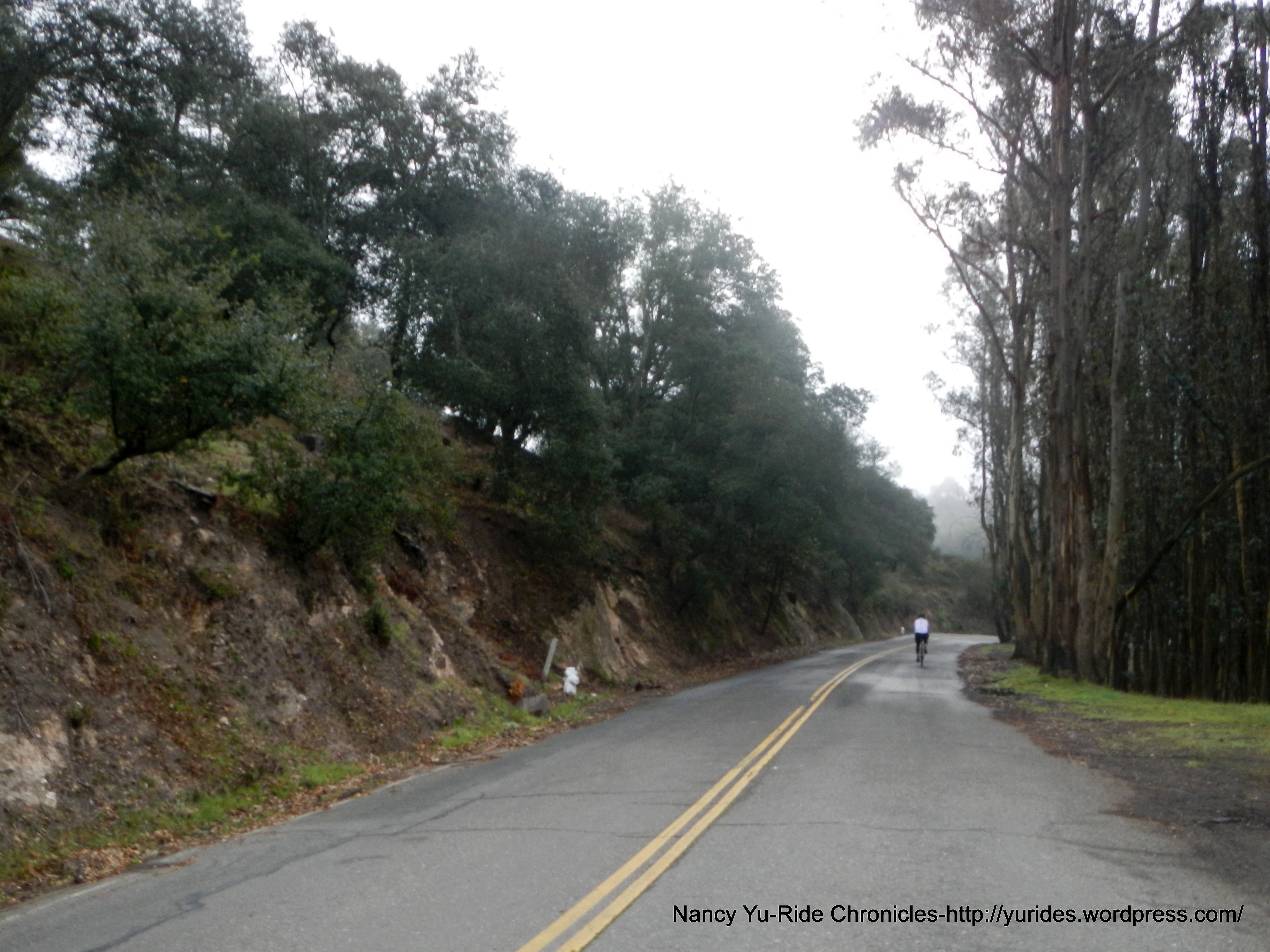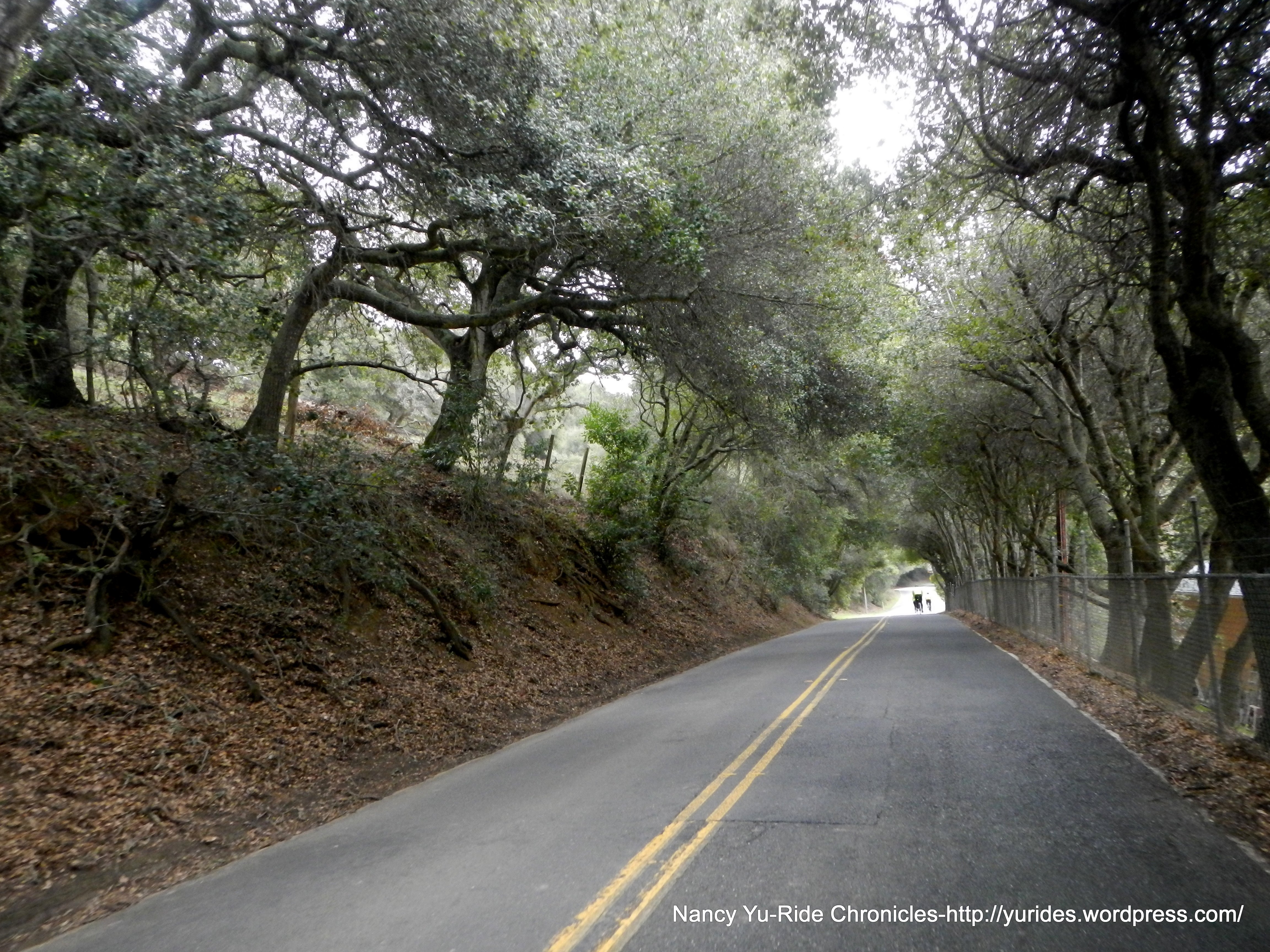 We exit the park and head south on Skyline Blvd to Redwood Rd. The first few miles on Skyline is slightly downhill, then it’s rolling terrain all the way to the summit at Robert’s Park. The 3/4 mile section of road between Manzanita Dr and Pinehurst are really bad; it’s a mine field of huge potholes and large fissures-watch out!