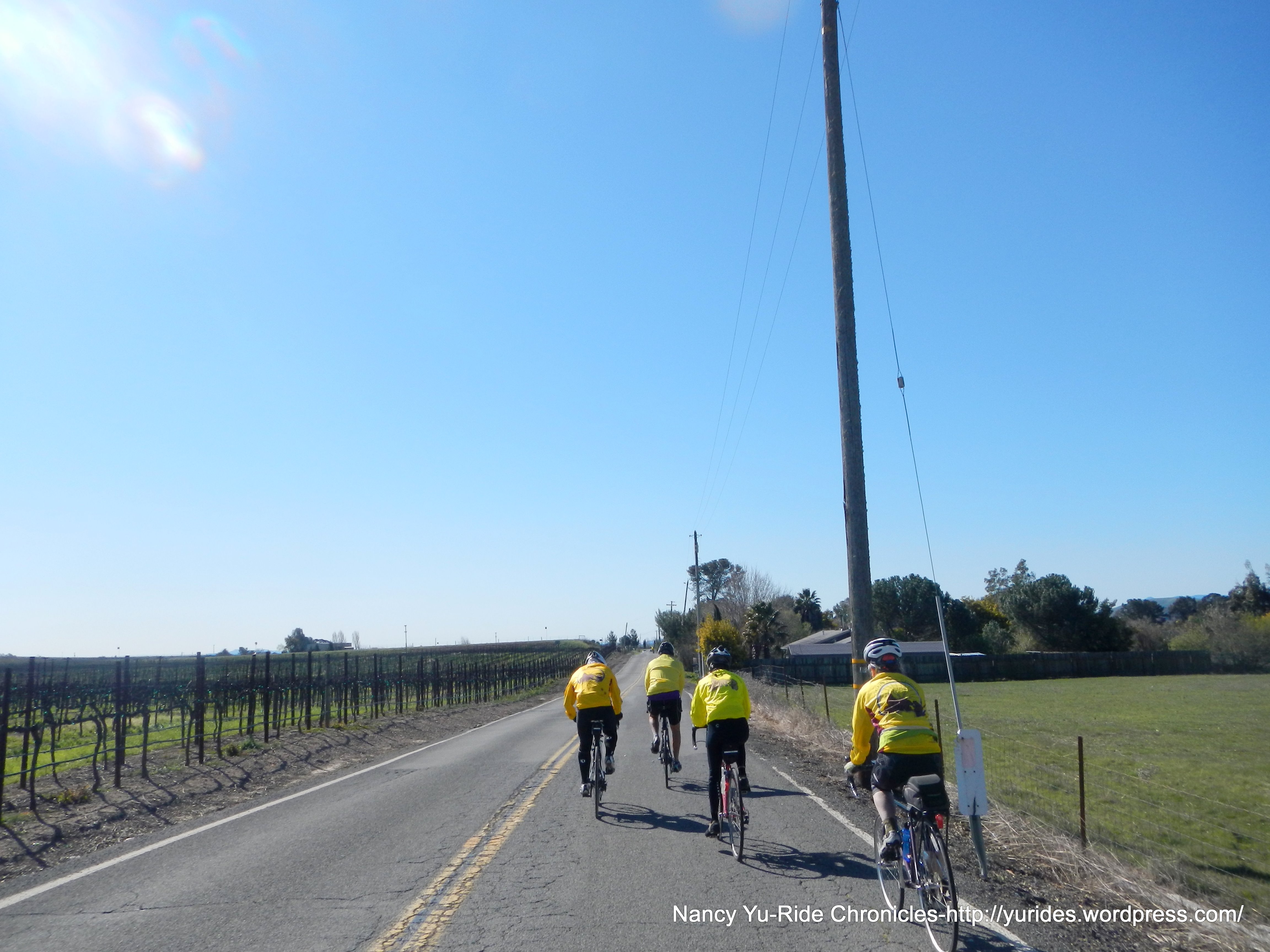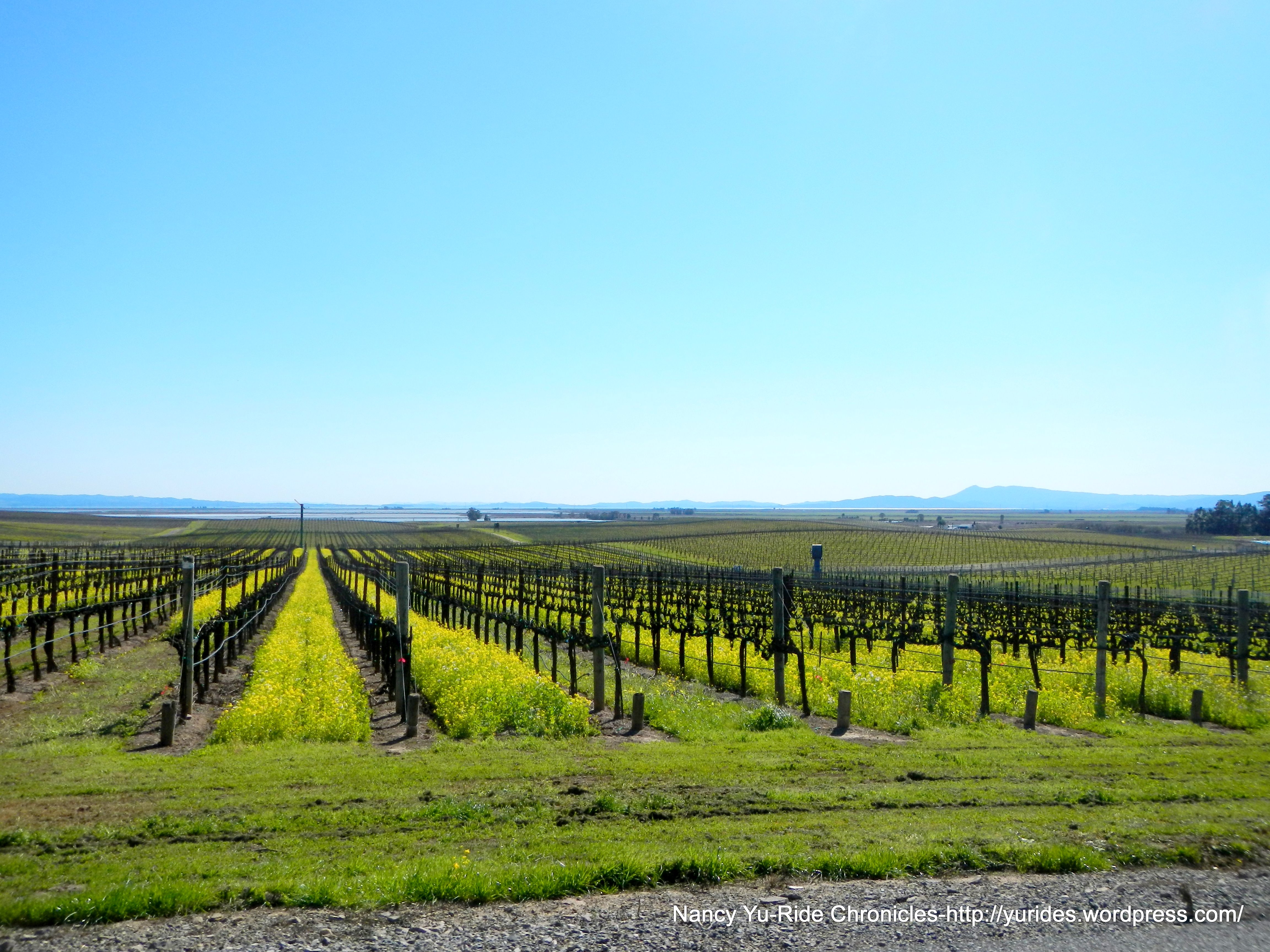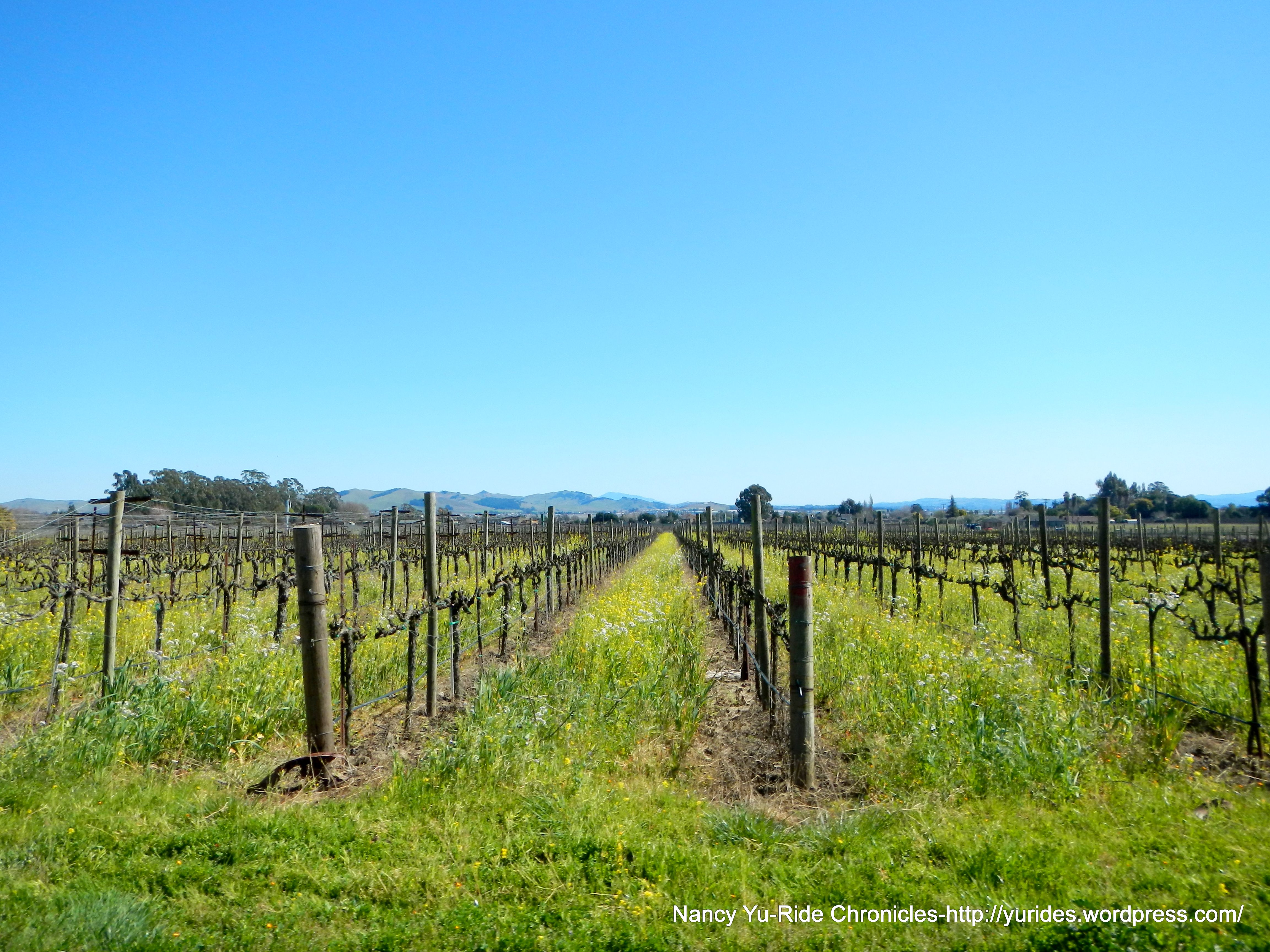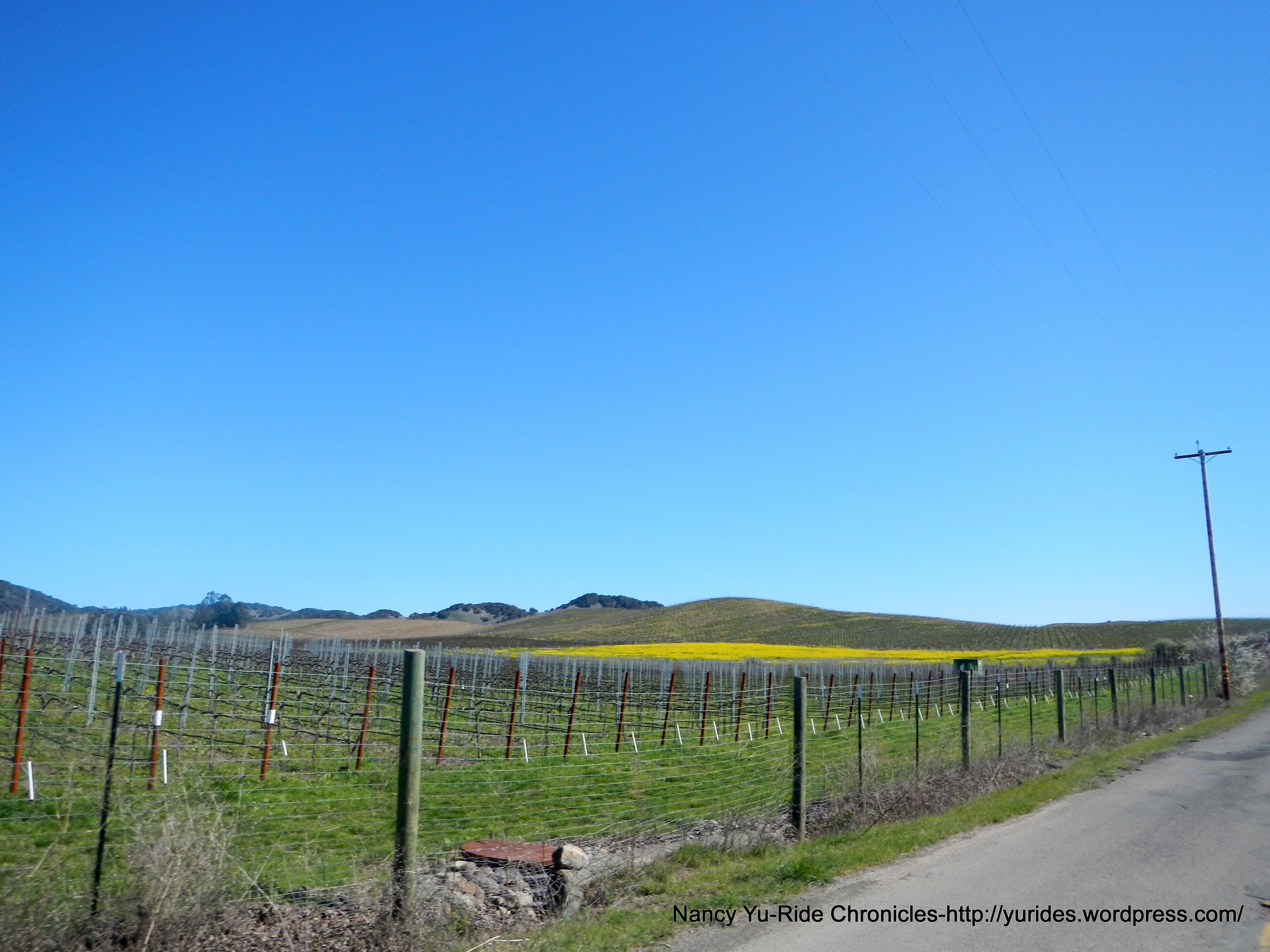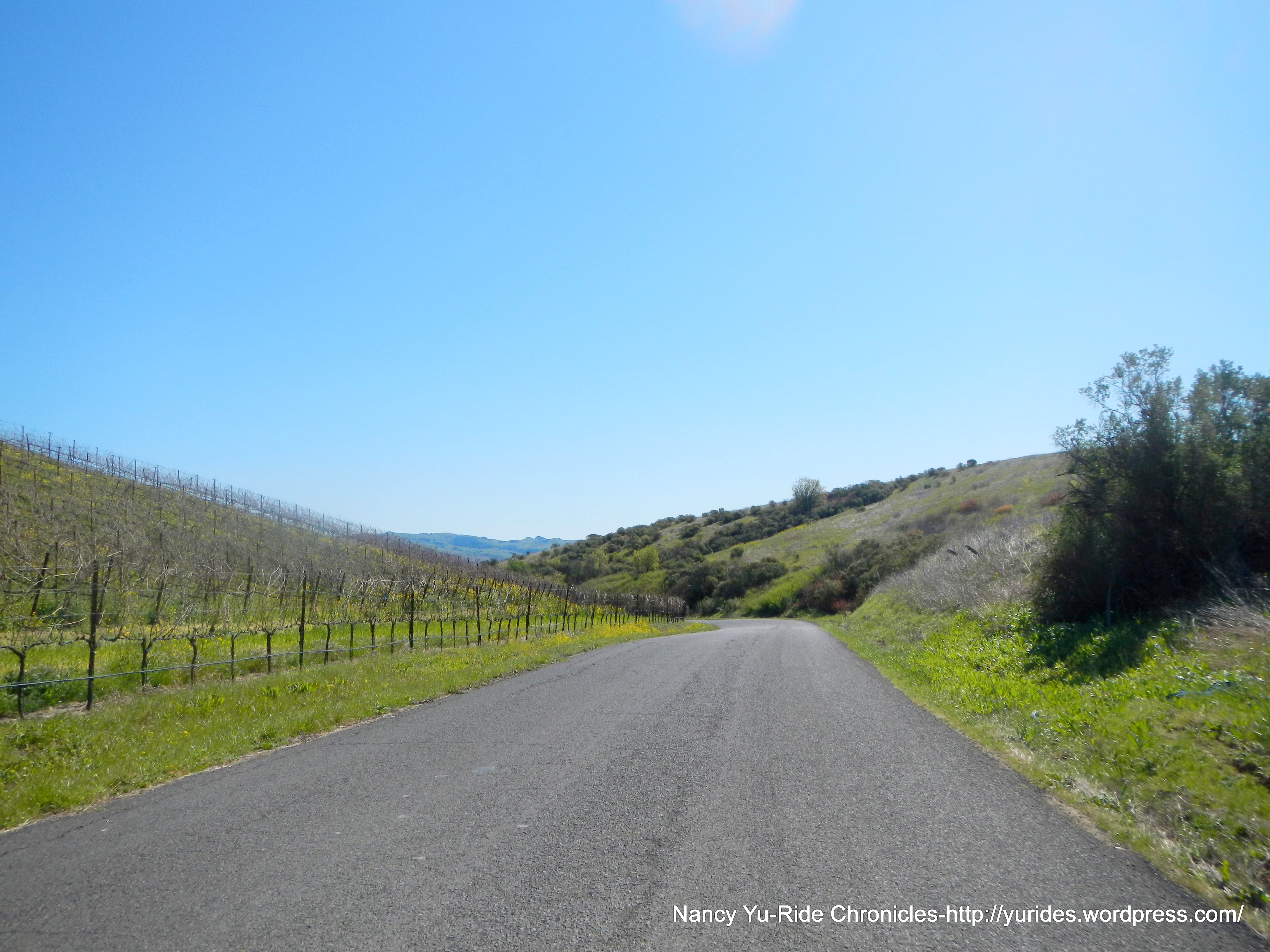 Bob L and I head back together; the short climb on Thompson Ave takes us to Congress Valley Rd and Old Sonoma Rd. There’s hardly any traffic in this area. The views of all the vineyards and mustard flowers growing in between the vines are fabulous!