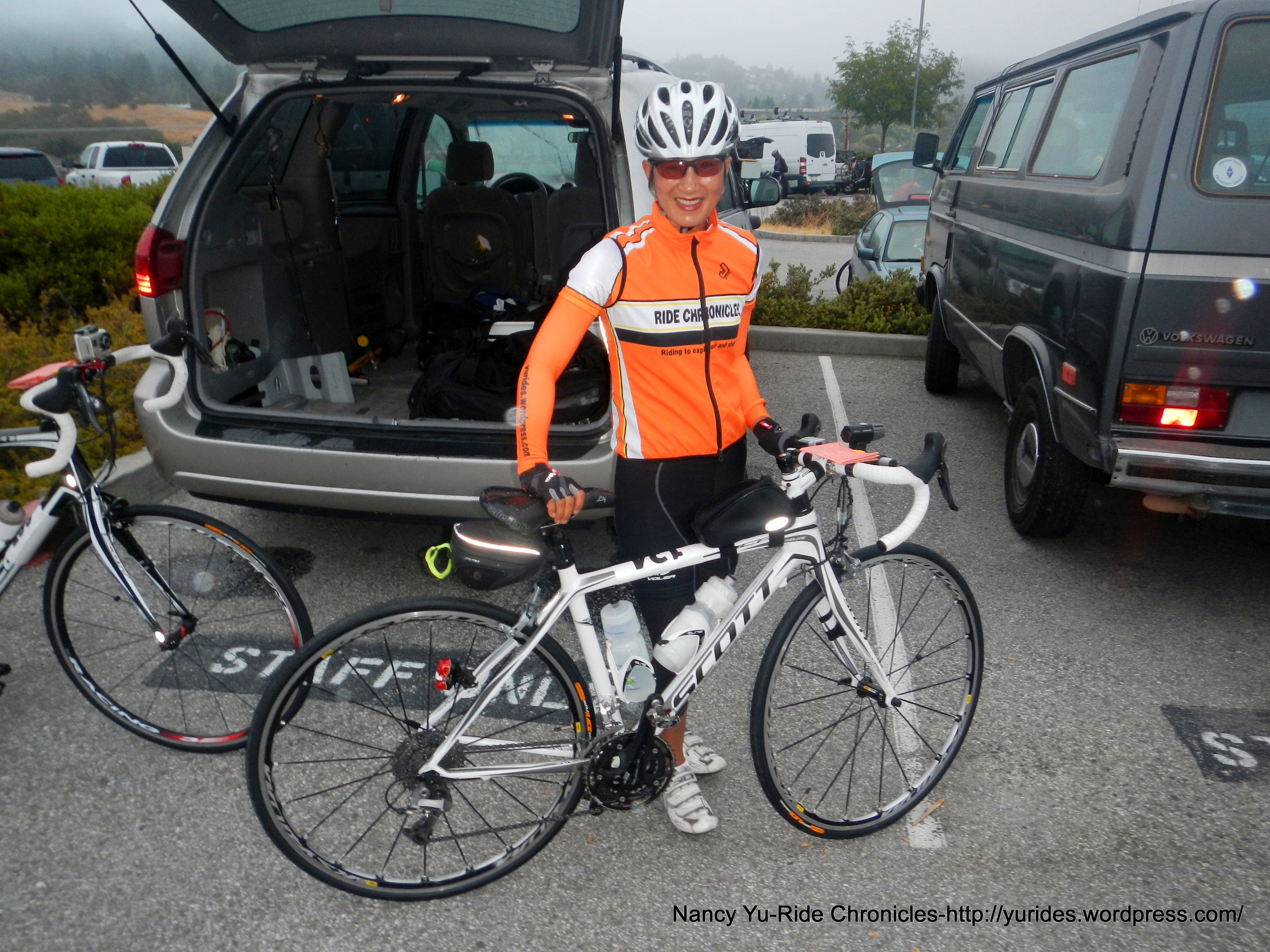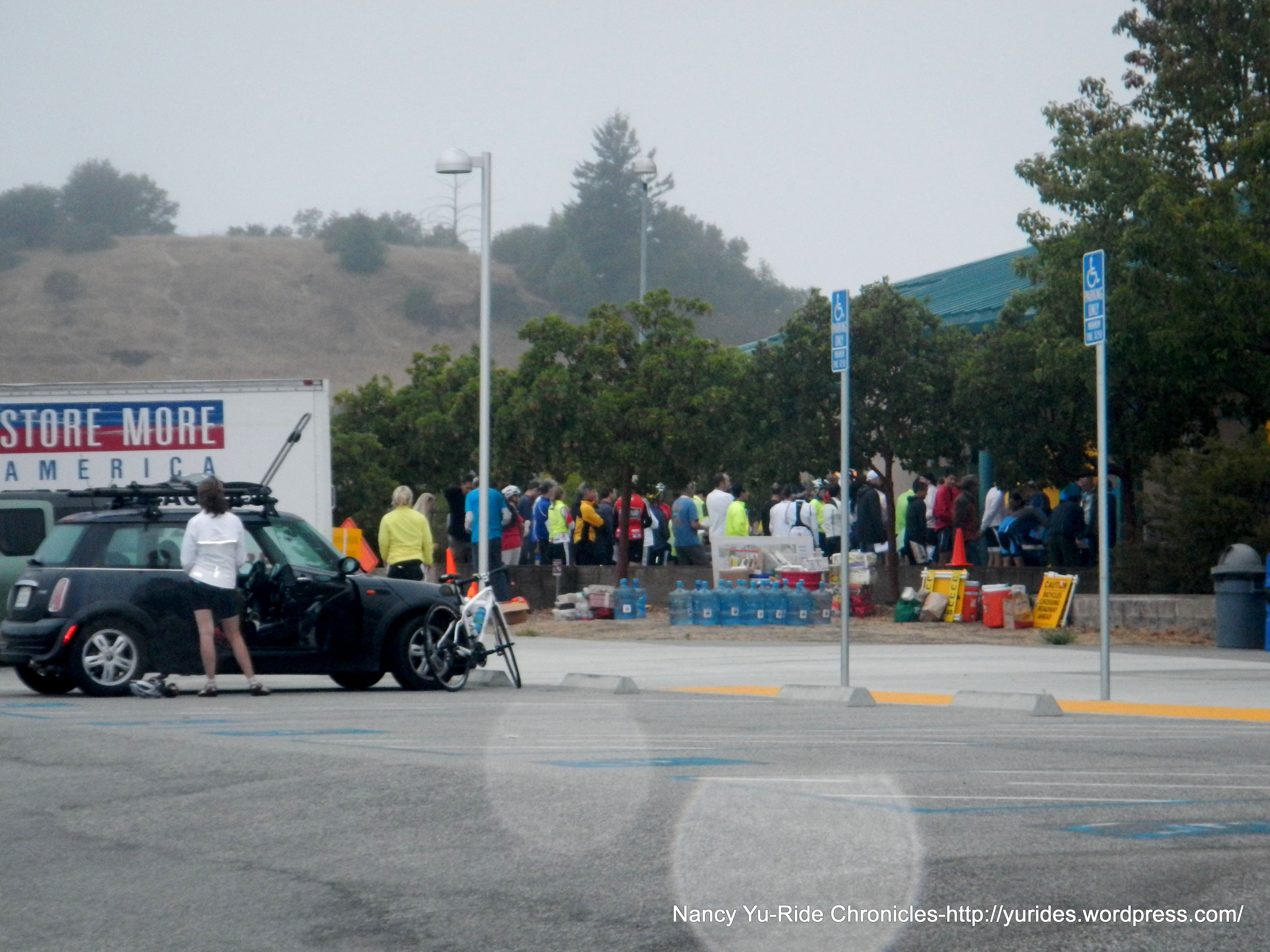 We arrive at Scotts Valley High School and already see riders out on the roads-it’s not even 6 AM yet! We wait until the skies lighten up before hitting the road at 6:20 AM-54F.