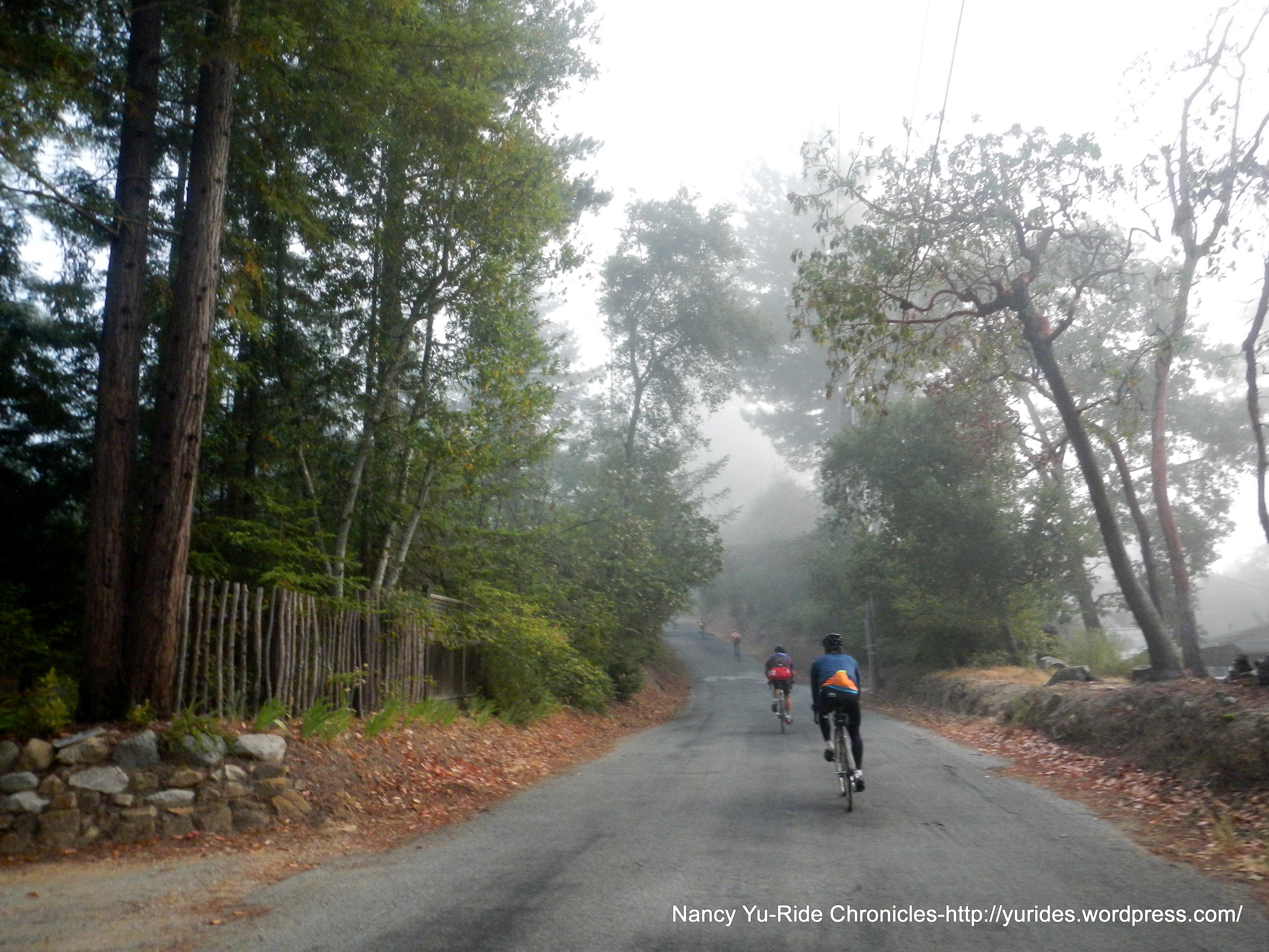 The dull grey of the early morning fog is accompanied by mist and drizzle. The cool moist air really wakes you up! As expected, the fog lingers through the whole climb up Mt Charlie Rd-it creates a feeling of calmness which is a great way to start the day!