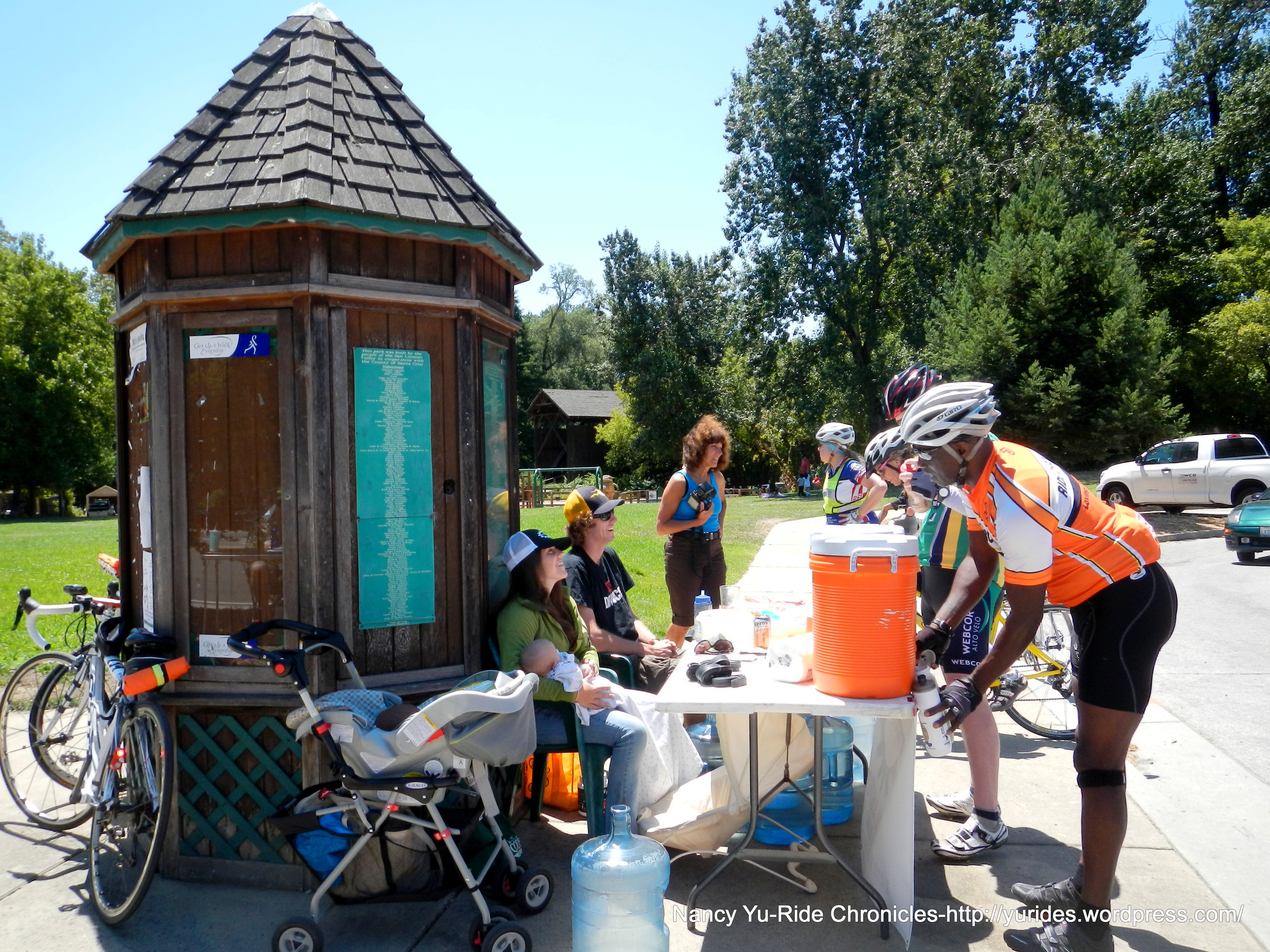 The 3.8 miles descent on Felton-Empire Rd is fast-it drops you into the town of Felton. We reach Water Stop #3-Covered Bridge Park, mile 62.8 at 12:55 PM.