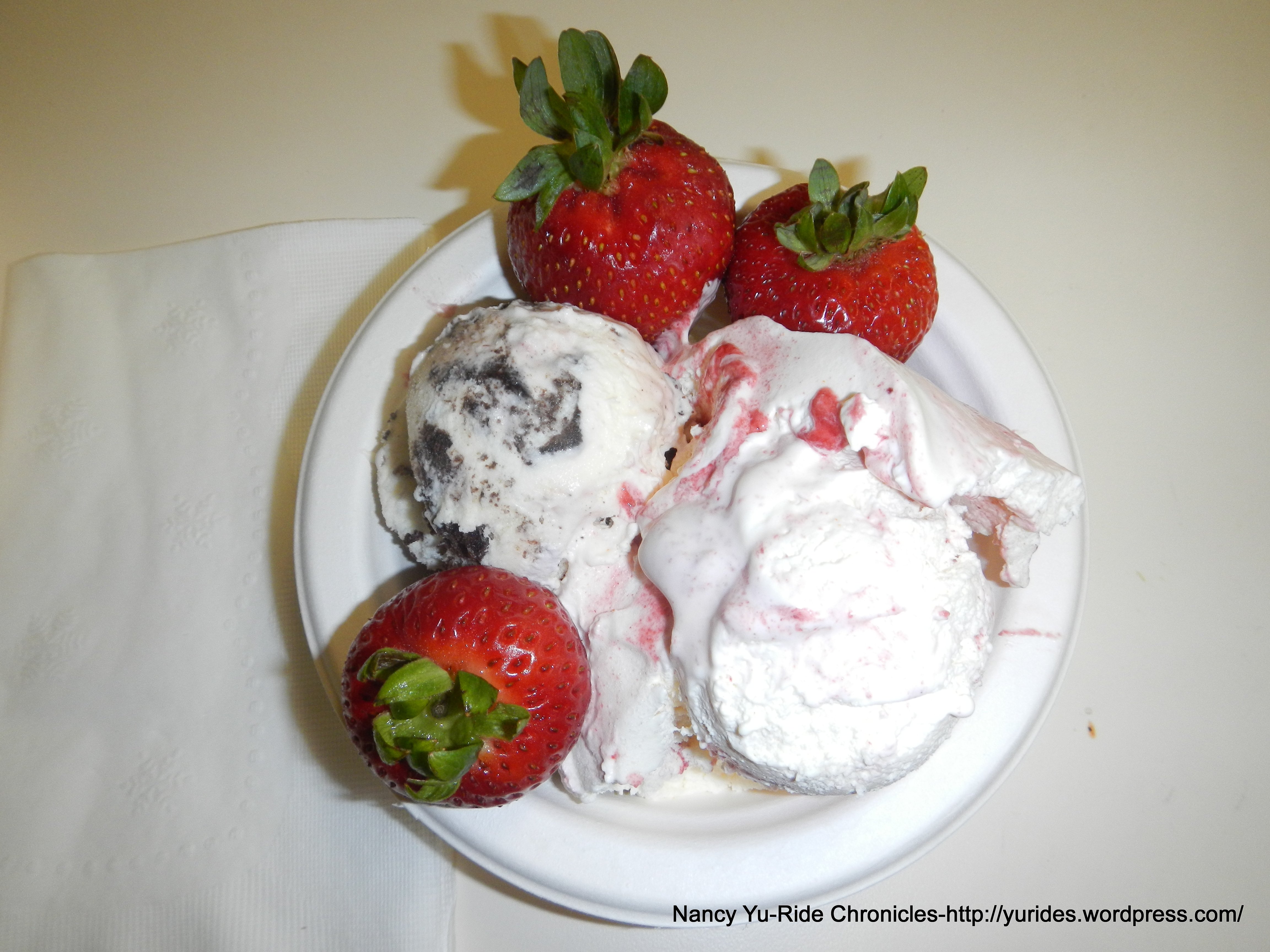 The post ride meal is a burrito with your choice of meat, rice, beans, salsa, guacamole, sour cream, cheese and lettuce. The passion fruit ice tea was very refreshing as was the ice cream; I had 2 flavors-cookies and cream & raspberry cheesecake swirl.