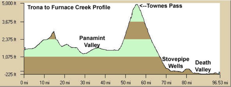 The winding descent drops us though the valley down to 1300′ with short rolling climbs up to the turn at Panamint Valley Rd. The next few flat miles take us to the turn up Townes Pass.