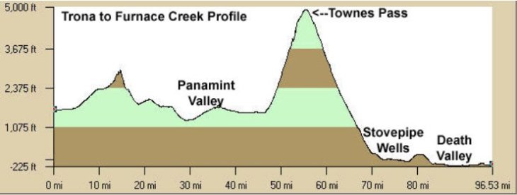 The flat miles out of Trona bring us to the 1000′ climb up the Trona Bump to the Panamint Valley. It’s about 10 miles long with gentle gradient ranges of 2-4.5%. We’re rolling along at a pretty good clip, passing many single riders as we make our way up to the summit at 2960′. Can you see us?