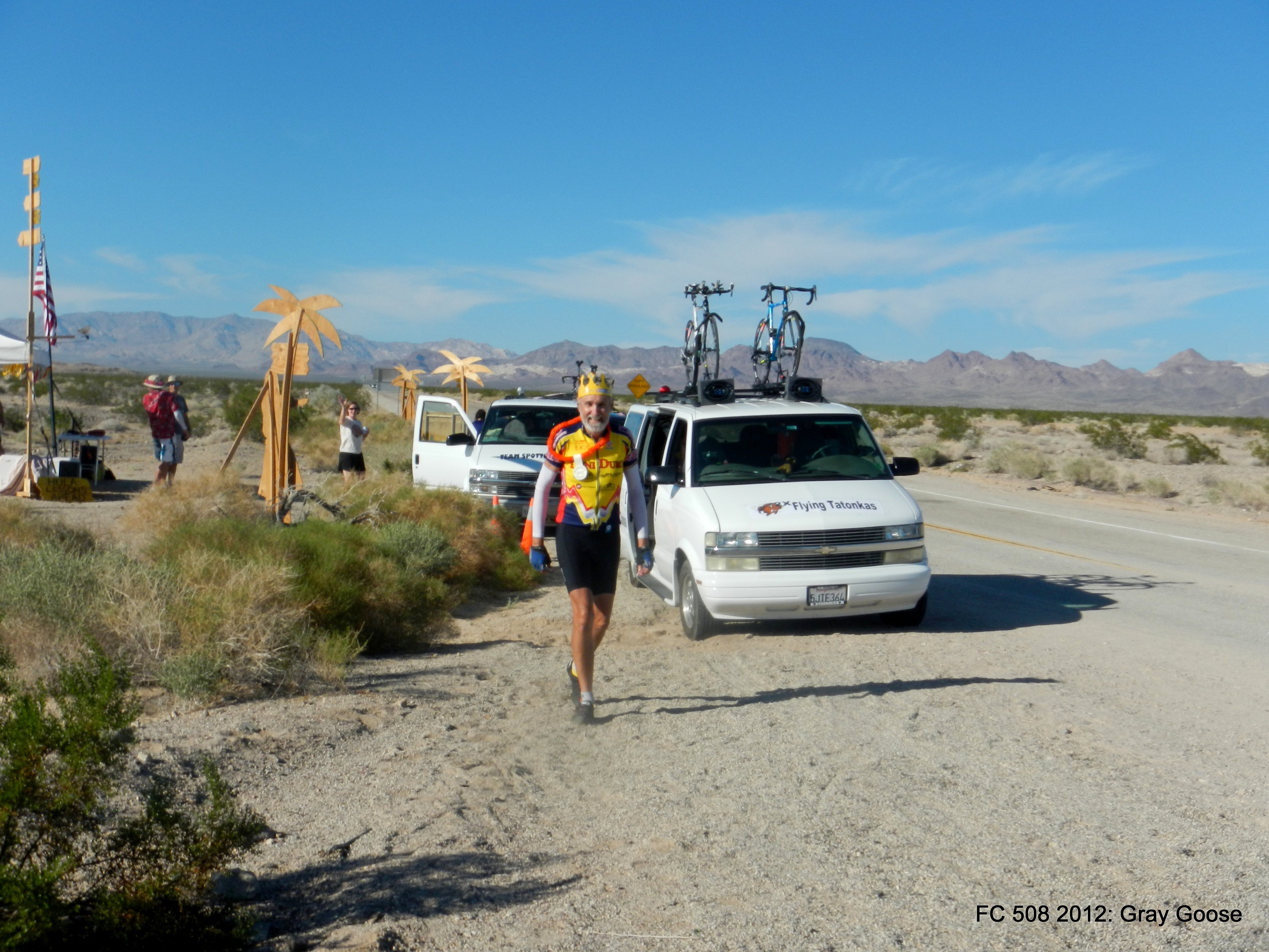 We arrive at Time Station #7-Natl Trails Hwy at 3:41 PM. It’s a Hawaiian themed stop-how wonderful! We both get Lei’d and receive a cold can of Dole pineapple juice-it’s quite refreshing after riding in the heat!