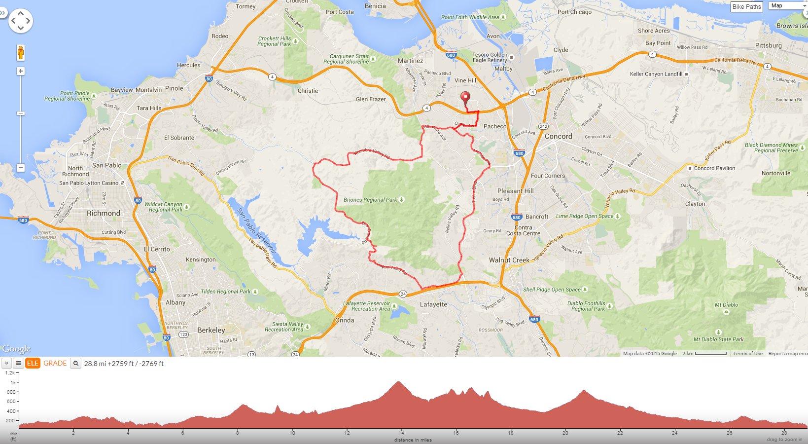 This hilly clockwise loop goes around Briones Hills from Martinez to Lafayette. Climb Taylor, Deer Hill and Happy Valley to Bear Creek. Continue climbing on Bear Creek Rd and Alhambra Valley before returning back through the valley into Martinez.
