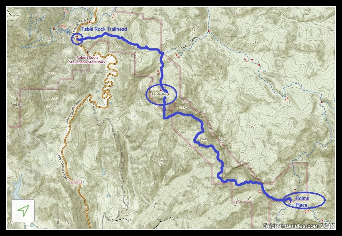 From Calistoga, it’s a twisty eight-mile drive up Highway 29 to the parking area and trailhead, the same staging area used for the Mount St. Helena Trail. It is signed Robert Louis Stevenson State Park. The trail to Table Rock and the Palisades is on the right (southeast) side of the road. *2