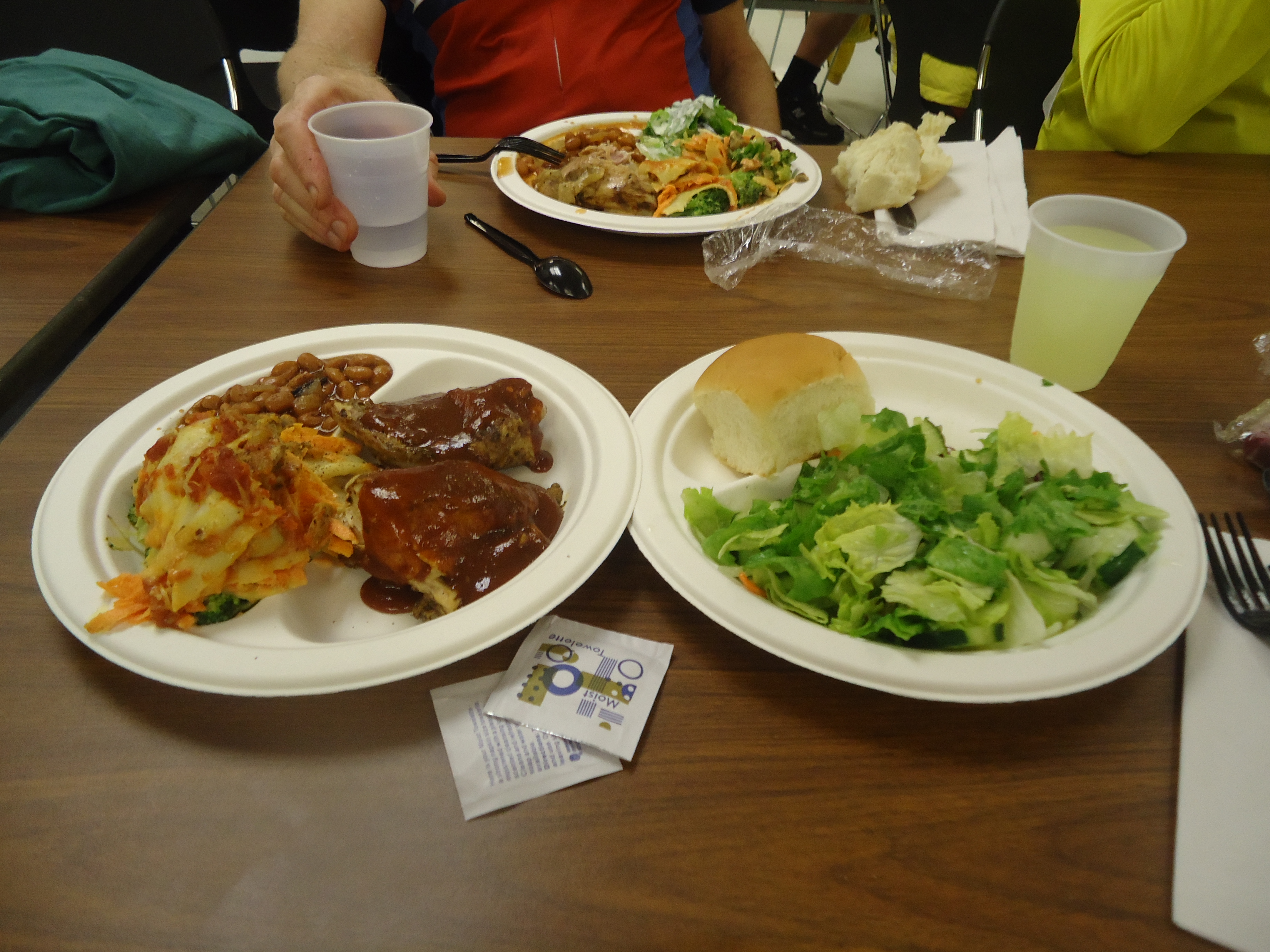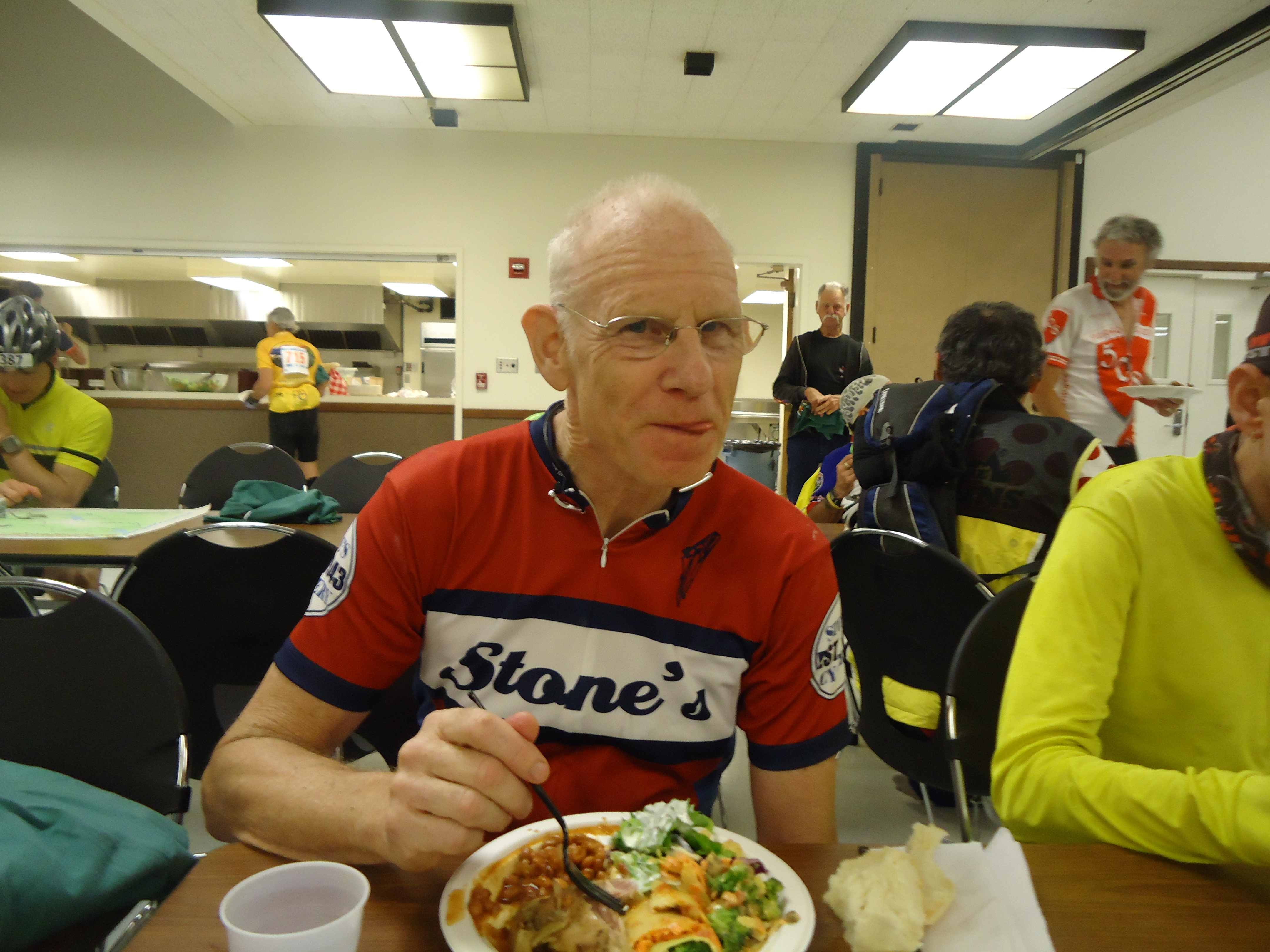 There is a post ride meal served to us all; BBQ chicken, vegetable lasagna, baked beans, salad and bread with a variety of drinks and fruit popsicles. We sit and share our day with Mick, Zach, and Veronica. As we’re getting ready to leave, Barb M comes in from the ride. Congrats to everyone for finishing!