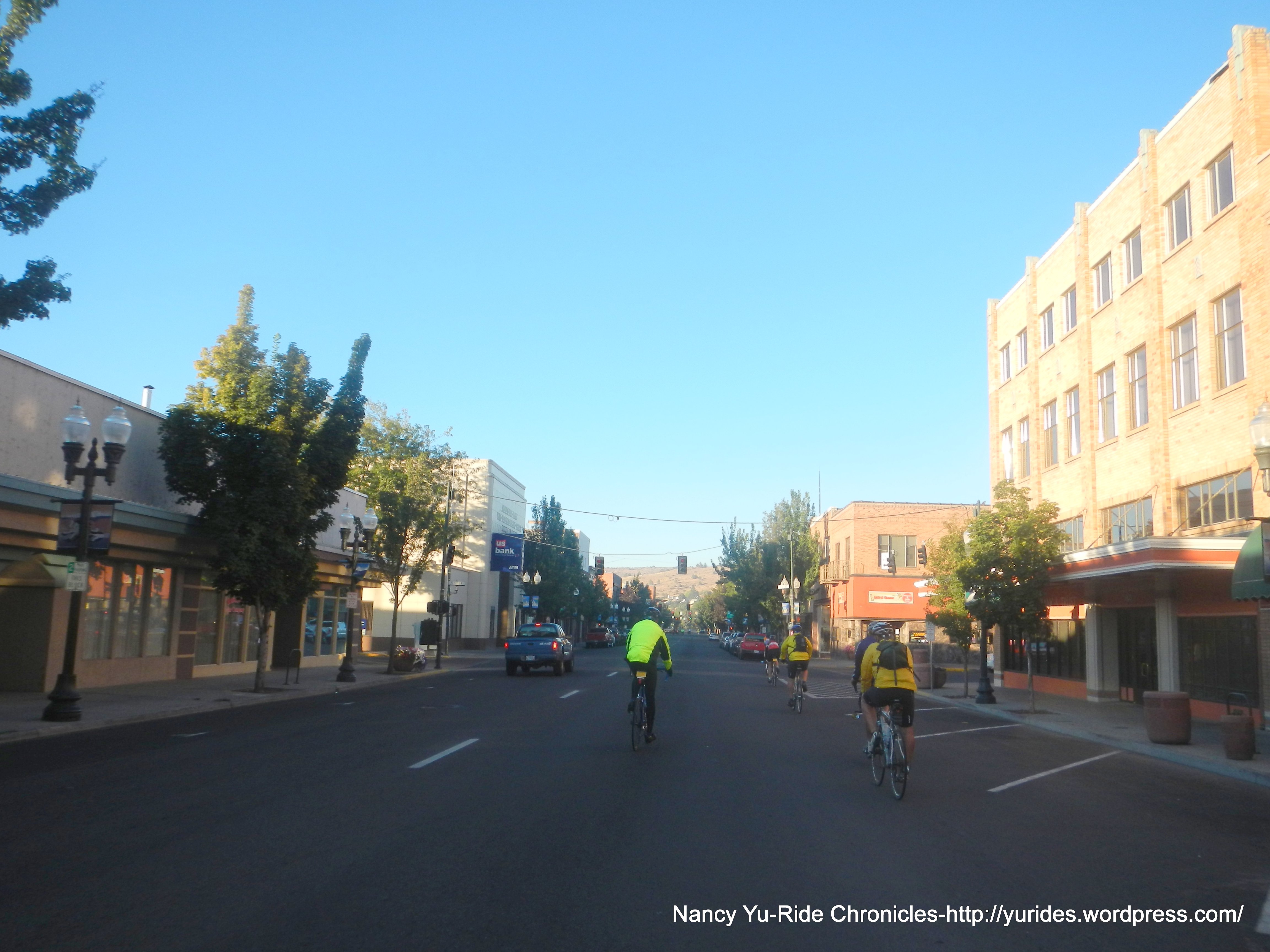 We’re all packed up and ready to exit camp at 7:30 AM-51F. The first 4.5 miles takes us directly on city streets through downtown, fortunately there’s not much traffic for this time of the day.