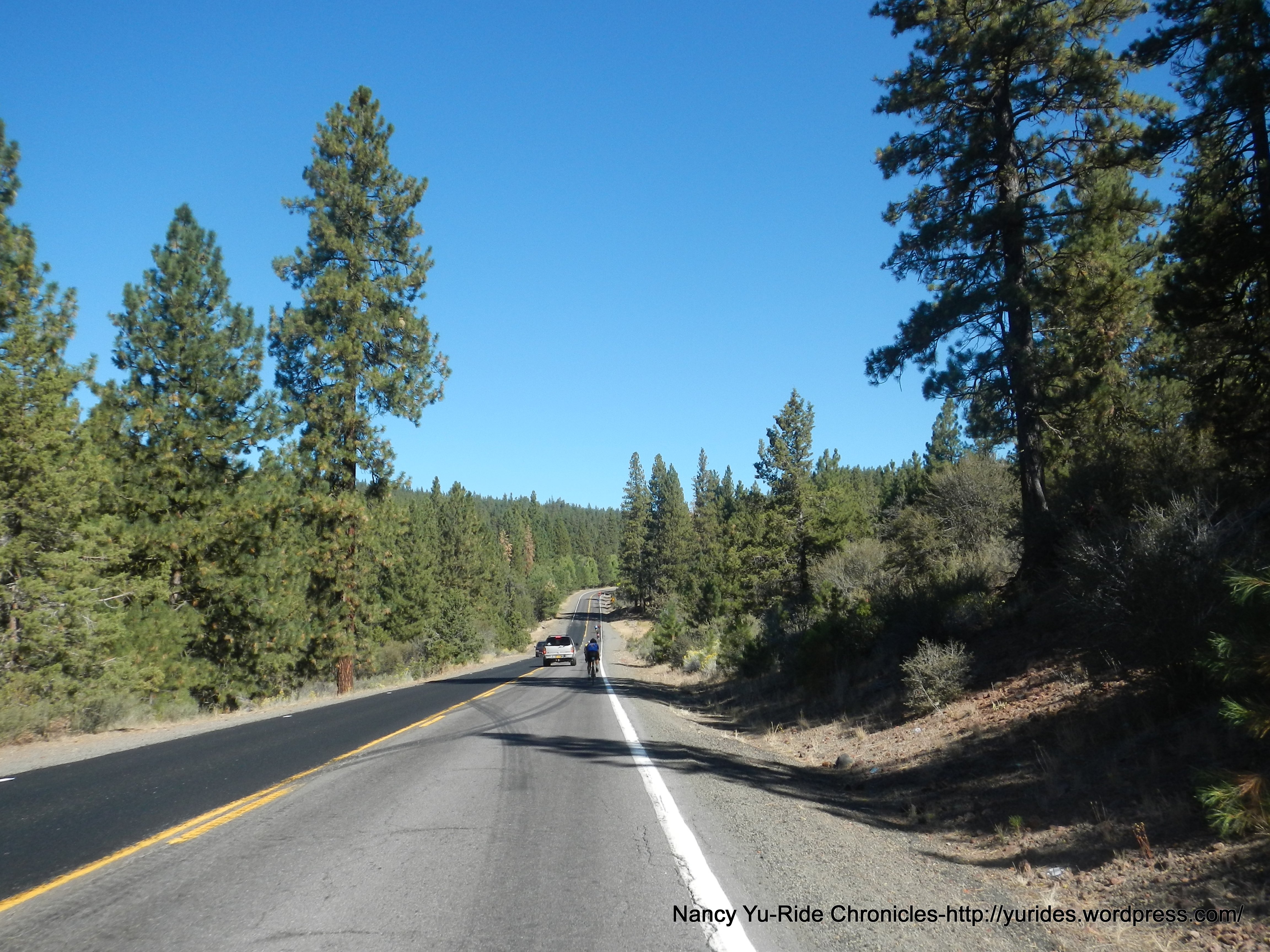 We continue straight onto Hwy 140 and immediately begin a 3.5 mile stair step climb up to Bly Mountain Summit at 5087′. The first section is a little over a mile long with a starting grade of 2.5% and steadily increases to a max grade of around 4.8%. This is followed by a very short descent and a slight longer and steeper 5.2% climb up to the summit. This is the last climb of the day!