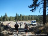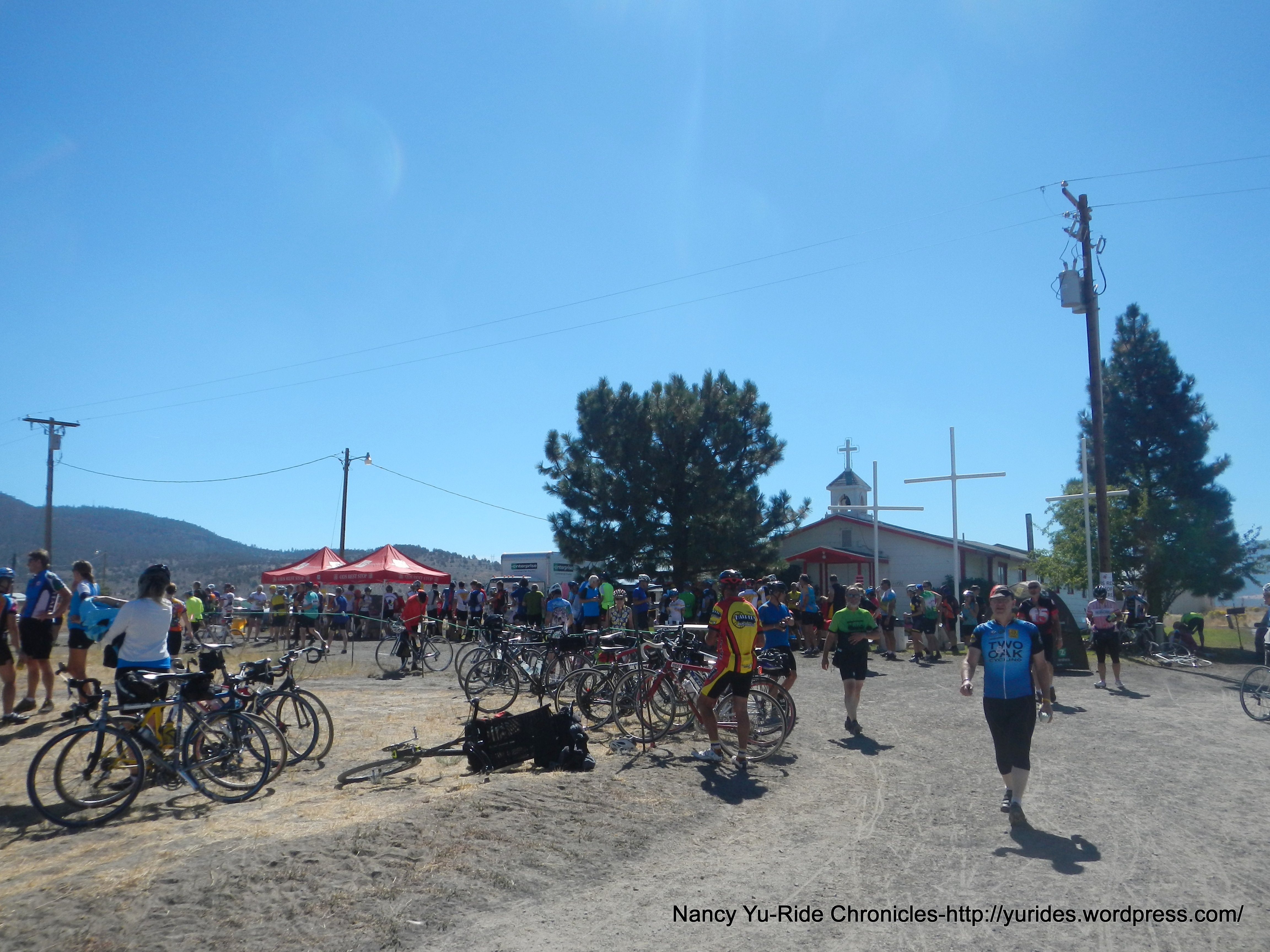 We enter the town of Bly and arrive under the finish banner at 12:55 PM, mile 64.2-96F.