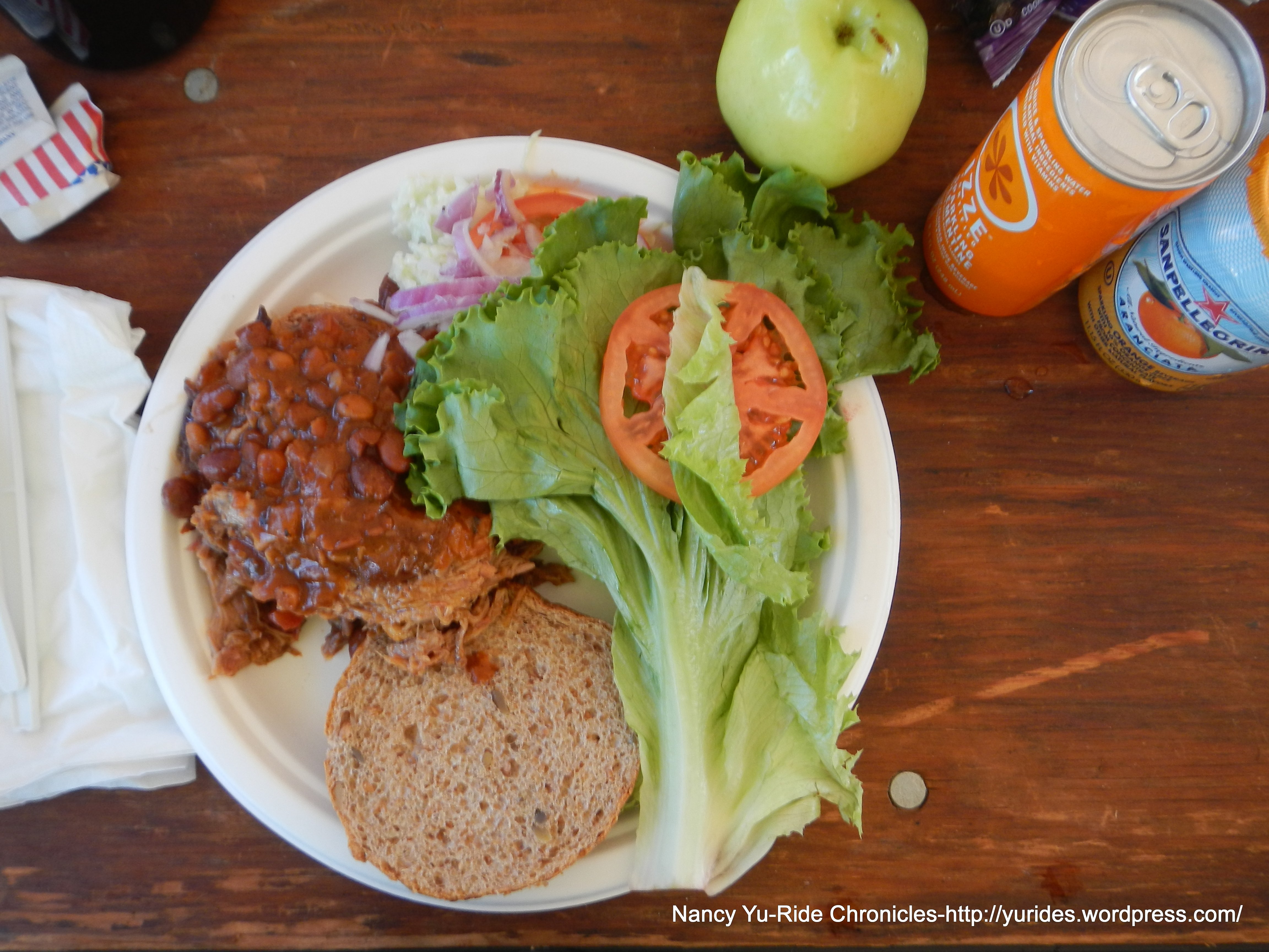 We’re back at our car and getting ready to have lunch before leaving for the drive back to California. Lunch: Pulled BBQ pork sandwich with baked beans, slaw, chips and fruit.