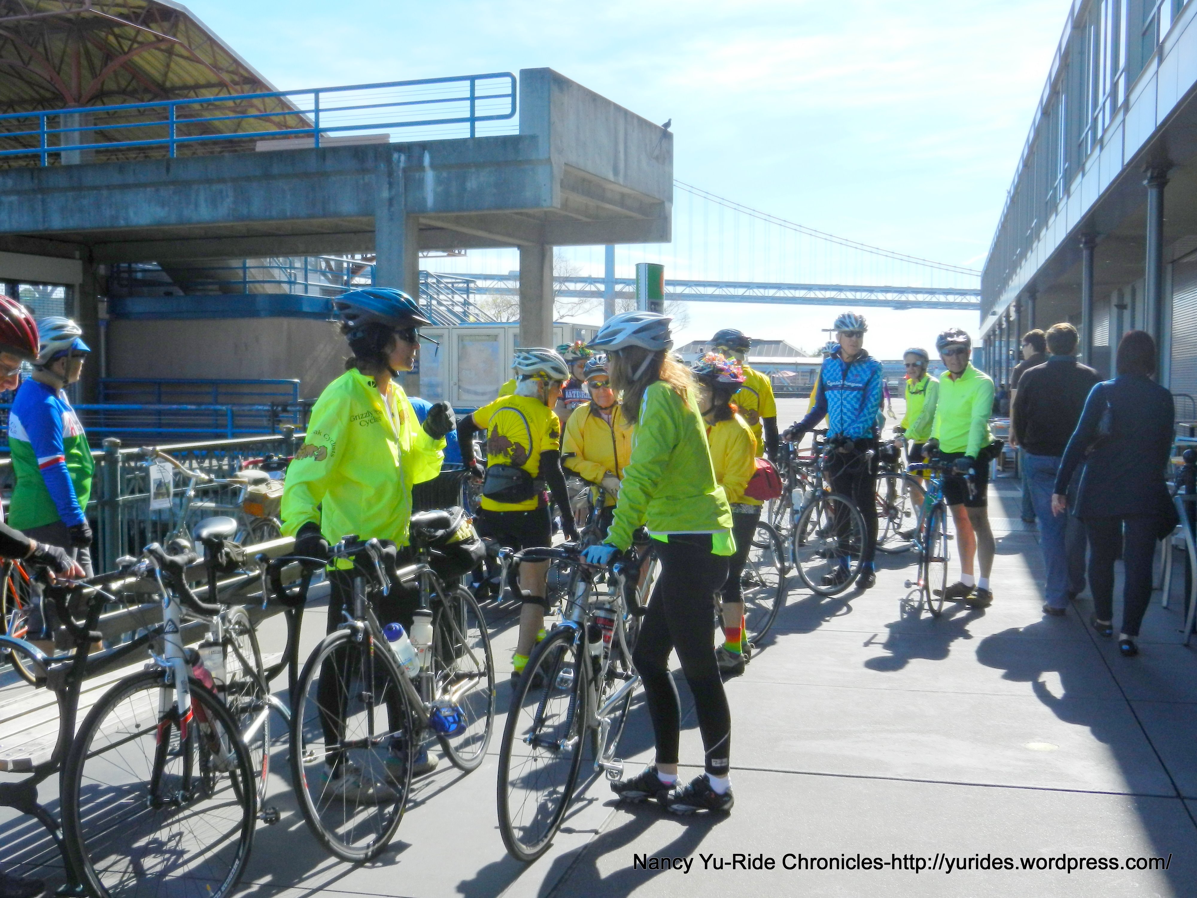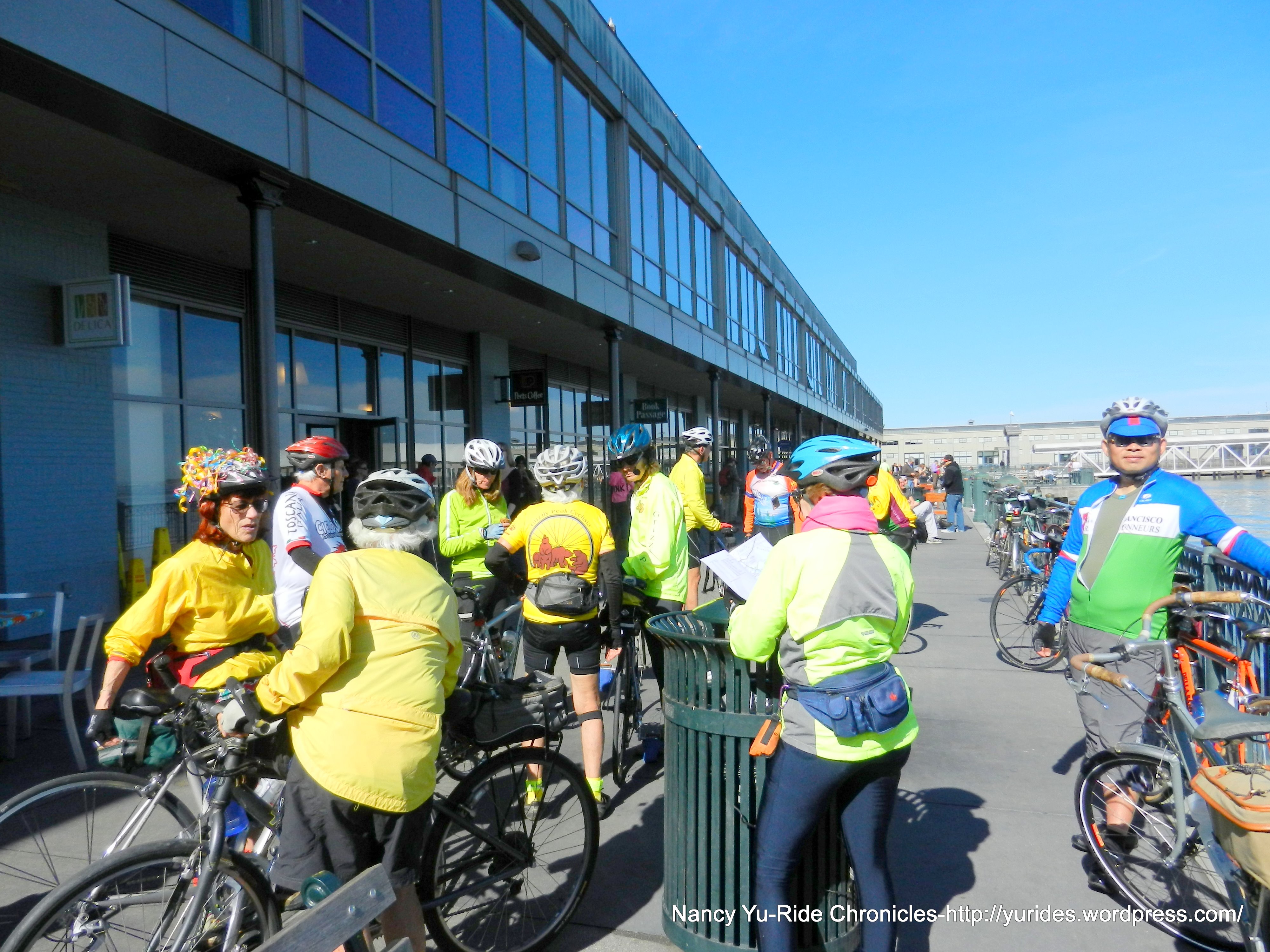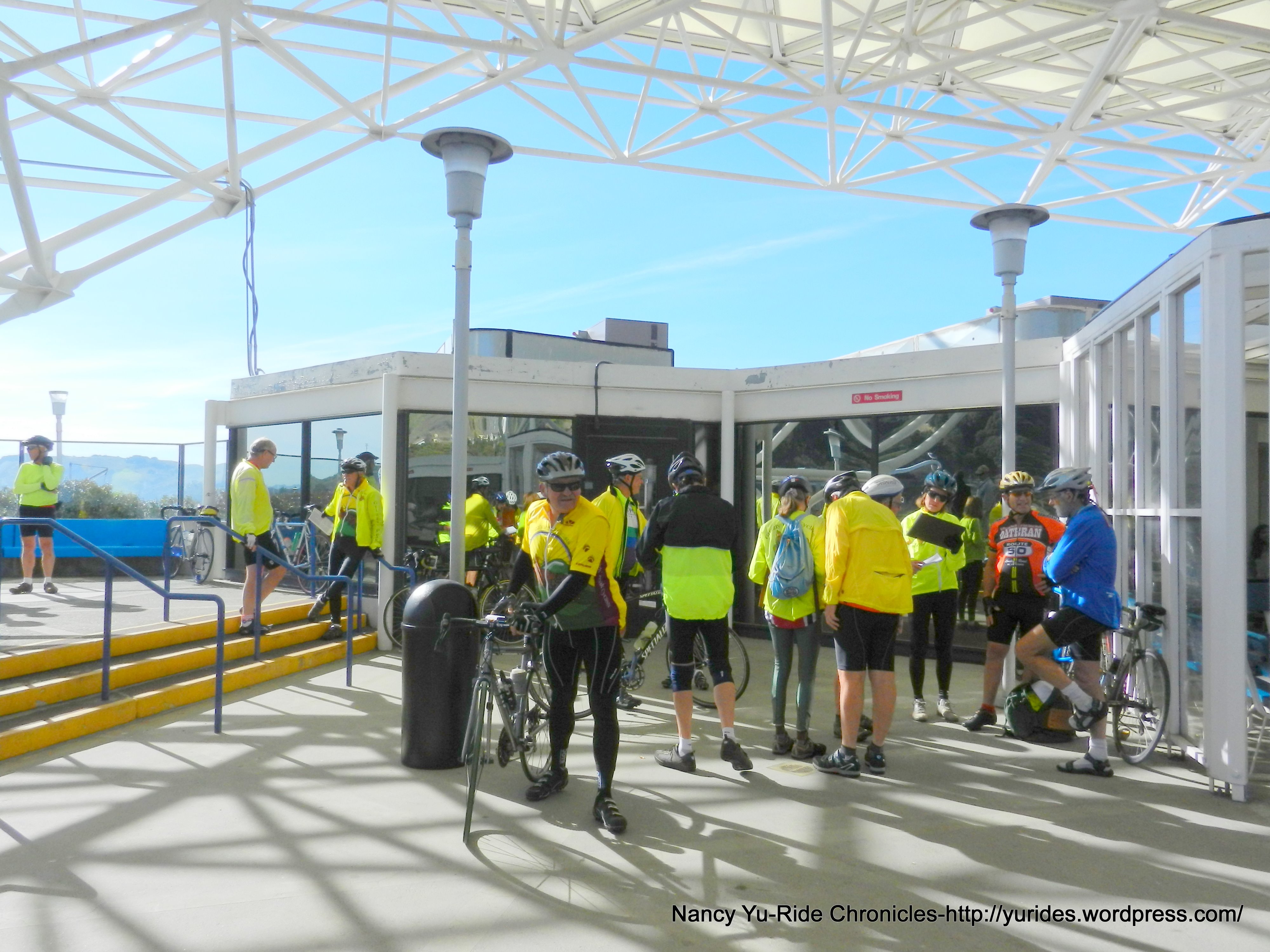 We arrive at the SF Ferry Terminal to meet up with the other group of riders at the Ferry Building. Water and restrooms are available at both ends of the building.