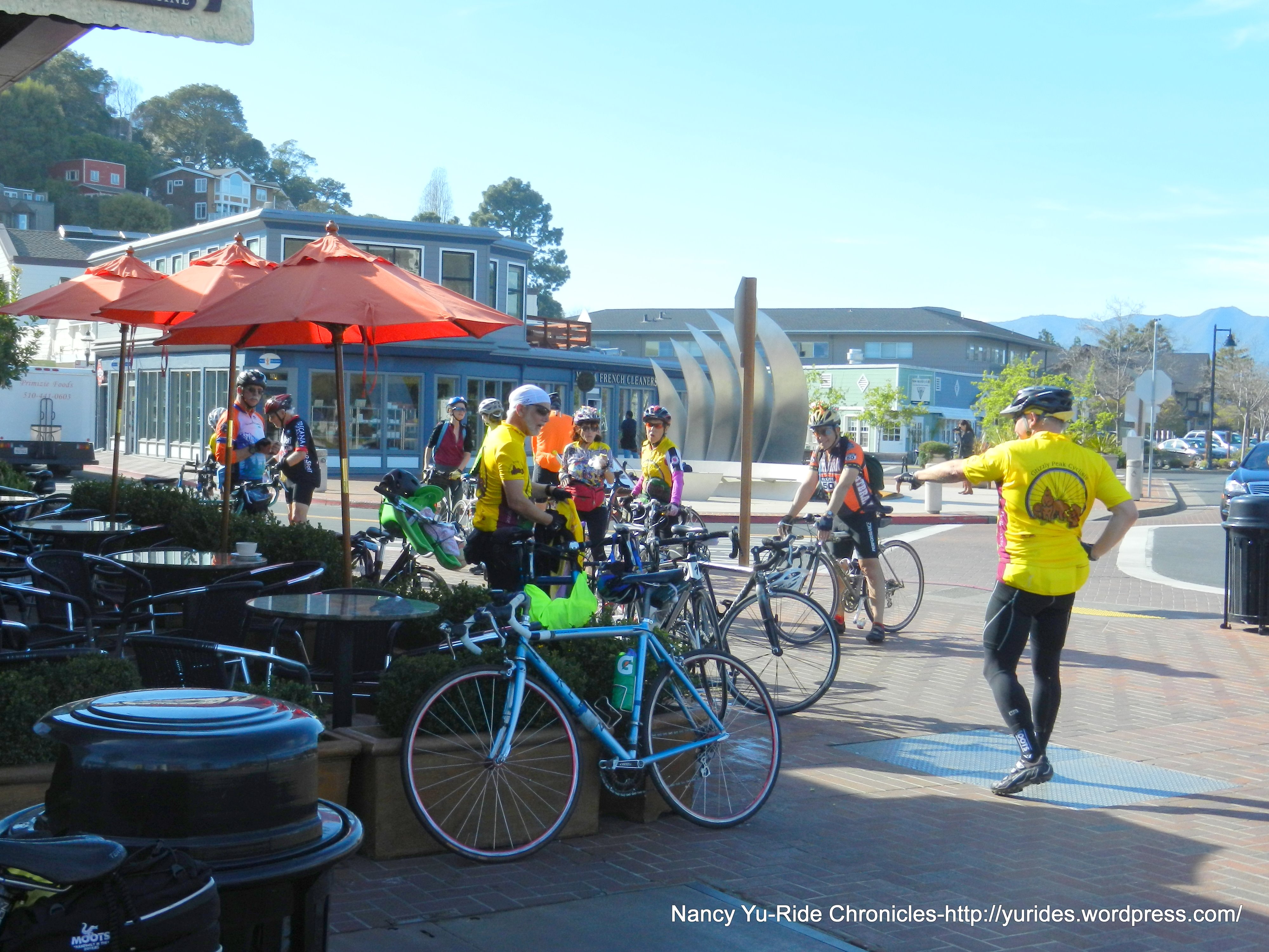 There is a regroup in Tiburon at Acfe Acri-it’s a nice coffee/snack stop. Water and restrooms are available inside the cafe.