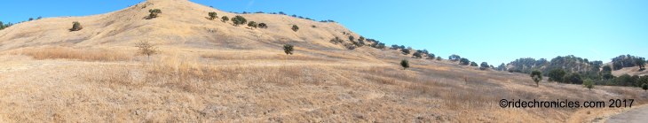 The trail rolls in and out of the scattered oaks across the open grasslands with glorious views of the rolling hills.