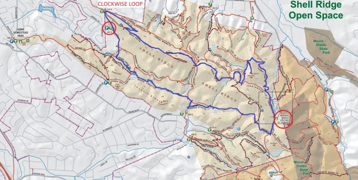 Directions: Marshall Dr > L-Briones Mt Diablo Reg Tr > R-Ridge Top Tr > L-stay on Ridge Top Tr >