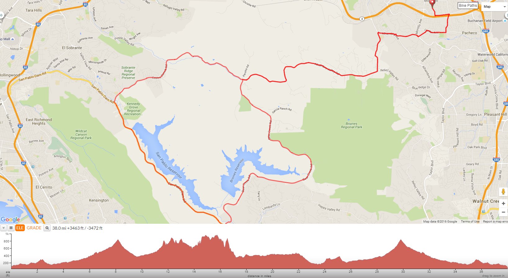 Head NW on San Pablo Dam Rd; this road runs along the west side of San Pablo Reservoir to the main entrance followed by a fast descent into El Sobrante.
