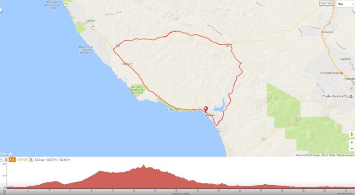 This short ride heads north on Old Creek Rd from the town of Cayucos up towards the Santa Lucia Range to the junction of Green Valley/Hwy 46 in Paso Robles. The route turns westward for a sweeping fast descent to the junction of Hwy 1 before rolling along the coast back to Cayucos.